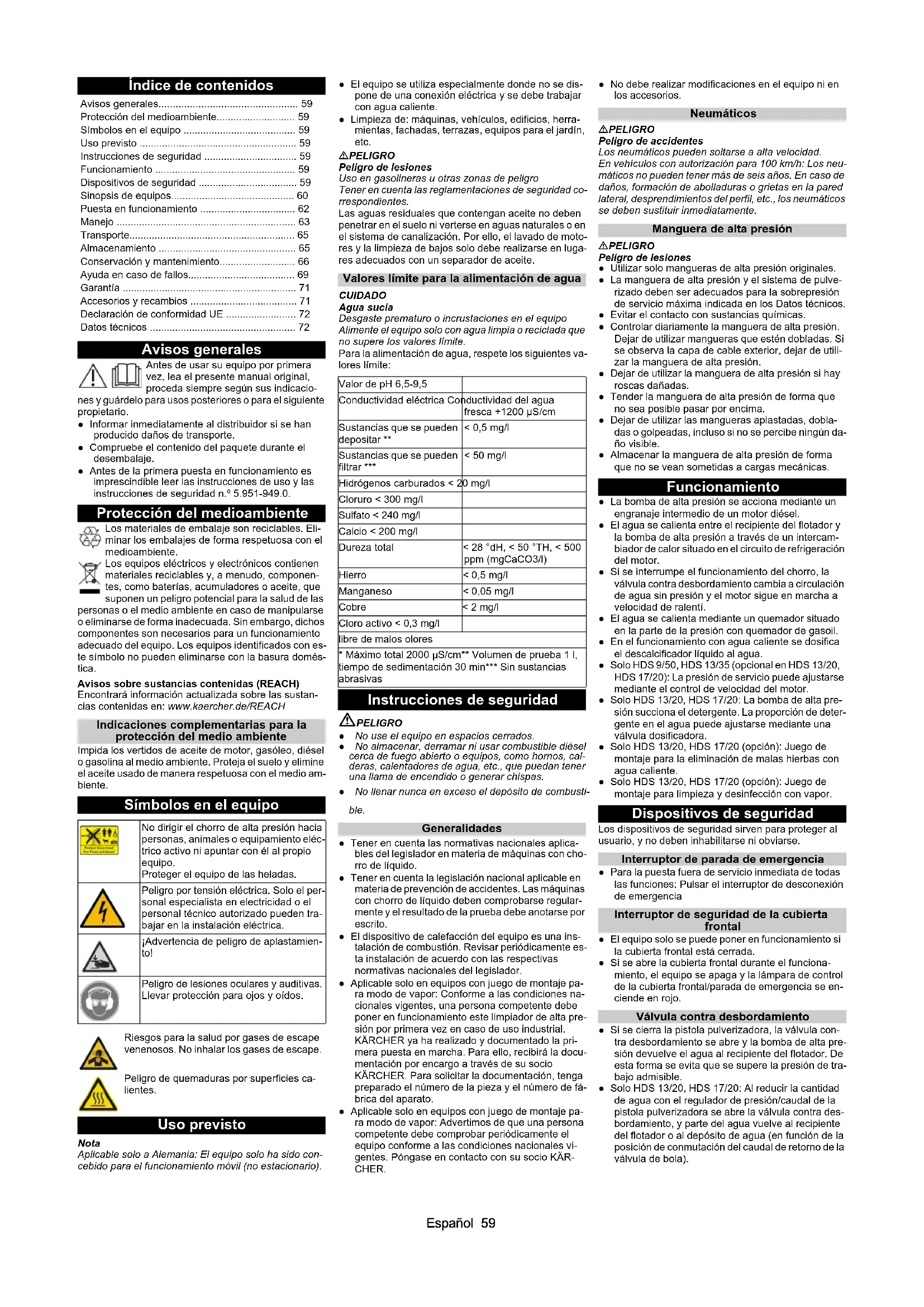 - 2,1 2,1 0,85 0,8Español 59 Índice de contenidos Avisos generales Antes de usar su equipo por primera vez, lea el presente manual original, proceda siempre según sus indicacio- nes y guárdelo para usos posteriores o para el siguiente propietario. ● Informar inmediatamente al distribuidor si se han producido daños de transporte. ● Compruebe el contenido del paquete durante el desembalaje. ● Antes de la primera puesta en funcionamiento es imprescindible leer las instrucciones de uso y las instrucciones de seguridad n.º 5.951-949.0. Protección del medioambiente Los materiales de embalaje son reciclables. Eli- minar los embalajes de forma respetuosa con el medioambiente. Los equipos eléctricos y electrónicos contienen materiales reciclables y, a menudo, componen- tes, como baterías, acumuladores o aceite, que suponen un peligro potencial para la salud de las personas o el medio ambiente en caso de manipularse o eliminarse de forma inadecuada. Sin embargo, dichos componentes son necesarios para un funcionamiento adecuado del equipo. Los equipos identificados con es- te símbolo no pueden eliminarse con la basura domés- tica. Avisos sobre sustancias contenidas (REACH) Encontrará información actualizada sobre las sustan- cias contenidas en: www.kaercher.de/REACH Indicaciones complementarias para la protección del medio ambiente Impida los vertidos de aceite de motor, gasóleo, diésel o gasolina al medio ambiente. Proteja el suelo y elimine el aceite usado de manera respetuosa con el medio am- biente. Símbolos en el equipo Uso previsto Nota Aplicable solo a Alemania: El equipo solo ha sido con- cebido para el funcionamiento móvil (no estacionario). ● El equipo se utiliza especialmente donde no se dis- pone de una conexión eléctrica y se debe trabajar con agua caliente. ● Limpieza de: máquinas, vehículos, edificios, herra- mientas, fachadas, terrazas, equipos para el jardín, etc. PELIGRO Peligro de lesiones Uso en gasolineras u otras zonas de peligro Tener en cuenta las reglamentaciones de seguridad co- rrespondientes. Las aguas residuales que contengan aceite no deben penetrar en el suelo ni verterse en aguas naturales o en el sistema de canalización. Por ello, el lavado de moto- res y la limpieza de bajos solo debe realizarse en luga- res adecuados con un separador de aceite. Valores límite para la alimentación de agua CUIDADO Agua sucia Desgaste prematuro o incrustaciones en el equipo Alimente el equipo solo con agua limpia o reciclada que no supere los valores límite. Para la alimentación de agua, respete los siguientes va- lores límite: Instrucciones de seguridad PELIGRO ● No use el equipo en espacios cerrados. ● No almacenar, derramar ni usar combustible diésel cerca de fuego abierto o equipos, como hornos, cal- deras, calentadores de agua, etc., que puedan tener una llama de encendido o generar chispas. ● No llenar nunca en exceso el depósito de combusti- ble. Generalidades ● Tener en cuenta las normativas nacionales aplica- bles del legislador en materia de máquinas con cho- rro de líquido. ● Tener en cuenta la legislación nacional aplicable en materia de prevención de accidentes. Las máquinas con chorro de líquido deben comprobarse regular- mente y el resultado de la prueba debe anotarse por escrito. ● El dispositivo de calefacción del equipo es una ins- talación de combustión. Revisar periódicamente es- ta instalación de acuerdo con las respectivas normativas nacionales del legislador. ● Aplicable solo en equipos con juego de montaje pa- ra modo de vapor: Conforme a las condiciones na- cionales vigentes, una persona competente debe poner en funcionamiento este limpiador de alta pre- sión por primera vez en caso de uso industrial. KÄRCHER ya ha realizado y documentado la pri- mera puesta en marcha. Para ello, recibirá la docu- mentación por encargo a través de su socio KÄRCHER. Para solicitar la documentación, tenga preparado el número de la pieza y el número de fá- brica del aparato. ● Aplicable solo en equipos con juego de montaje pa- ra modo de vapor: Advertimos de que una persona competente debe comprobar periódicamente el equipo conforme a las condiciones nacionales vi- gentes. Póngase en contacto con su socio KÄR- CHER. ● No debe realizar modificaciones en el equipo ni en los accesorios. Neumáticos PELIGRO Peligro de accidentes Los neumáticos pueden soltarse a alta velocidad. En vehículos con autorización para 100 km/h: Los neu- máticos no pueden tener más de seis años. En caso de daños, formación de abolladuras o grietas en la pared lateral, desprendimientos del perfil, etc., los neumáticos se deben sustituir inmediatamente. Manguera de alta presión PELIGRO Peligro de lesiones ● Utilizar solo mangueras de alta presión originales. ● La manguera de alta presión y el sistema de pulve- rizado deben ser adecuados para la sobrepresión de servicio máxima indicada en los Datos técnicos. ● Evitar el contacto con sustancias químicas. ● Controlar diariamente la manguera de alta presión. Dejar de utilizar mangueras que estén dobladas. Si se observa la capa de cable exterior, dejar de utili- zar la manguera de alta presión. ● Dejar de utilizar la manguera de alta presión si hay roscas dañadas. ● Tender la manguera de alta presión de forma que no sea posible pasar por encima. ● Dejar de utilizar las mangueras aplastadas, dobla- das o golpeadas, incluso si no se percibe ningún da- ño visible. ● Almacenar la manguera de alta presión de forma que no se vean sometidas a cargas mecánicas. Funcionamiento ● La bomba de alta presión se acciona mediante un engranaje intermedio de un motor diésel. ● El agua se calienta entre el recipiente del flotador y la bomba de alta presión a través de un intercam- biador de calor situado en el circuito de refrigeración del motor. ● Si se interrumpe el funcionamiento del chorro, la válvula contra desbordamiento cambia a circulació
