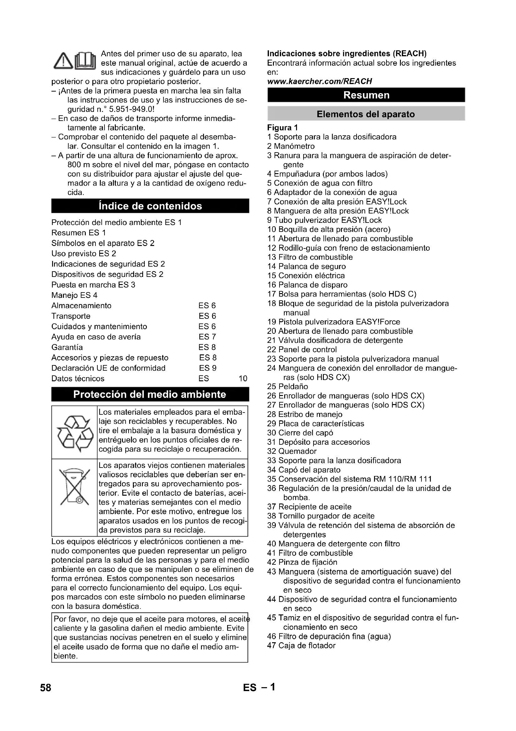 Typisch bedrijfsgewicht, C kg 118,1 118,1 121,1 Typisch bedrijfsgewicht, CX kg 121 121 124 Brandstofreservoir l 15,5 15,5 15,5 Reinigingsmiddelreservoir l 15,5 15,5 15,5 57NL– 1 Antes del primer uso de su aparato, lea este manual original, actúe de acuerdo a sus indicaciones y guárdelo para un uso posterior o para otro propietario posterior. – ¡Antes de la primera puesta en marcha lea sin falta las instrucciones de uso y las instrucciones de se- guridad n.° 5.951-949.0! – En caso de daños de transporte informe inmedia- tamente al fabricante. – Comprobar el contenido del paquete al desemba- lar. Consultar el contenido en la imagen 1. – A partir de una altura de funcionamiento de aprox. 800 m sobre el nivel del mar, póngase en contacto con su distribuidor para ajustar el ajuste del que- mador a la altura y a la cantidad de oxígeno redu- cida. Los equipos eléctricos y electrónicos contienen a me- nudo componentes que pueden representar un peligro potencial para la salud de las personas y para el medio ambiente en caso de que se manipulen o se eliminen de forma errónea. Estos componentes son necesarios para el correcto funcionamiento del equipo. Los equi- pos marcados con este símbolo no pueden eliminarse con la basura doméstica. Indicaciones sobre ingredientes (REACH) Encontrará información actual sobre los ingredientes en: www.kaercher.com/REACH Figura 1 1 Soporte para la lanza dosificadora 2 Manómetro 3 Ranura para la manguera de aspiración de deter- gente 4 Empuñadura (por ambos lados) 5 Conexión de agua con filtro 6 Adaptador de la conexión de agua 7 Conexión de alta presión EASY!Lock 8 Manguera de alta presión EASY!Lock 9 Tubo pulverizador EASY!Lock 10 Boquilla de alta presión (acero) 11 Abertura de llenado para combustible 12 Rodillo-guía con freno de estacionamiento 13 Filtro de combustible 14 Palanca de seguro 15 Conexión eléctrica 16 Palanca de disparo 17 Bolsa para herramientas (solo HDS C) 18 Bloque de seguridad de la pistola pulverizadora manual 19 Pistola pulverizadora EASY!Force 20 Abertura de llenado para combustible 21 Válvula dosificadora de detergente 22 Panel de control 23 Soporte para la pistola pulverizadora manual 24 Manguera de conexión del enrollador de mangue- ras (solo HDS CX) 25 Peldaño 26 Enrollador de mangueras (solo HDS CX) 27 Enrollador de mangueras (solo HDS CX) 28 Estribo de manejo 29 Placa de características 30 Cierre del capó 31 Depósito para accesorios 32 Quemador 33 Soporte para la lanza dosificadora 34 Capó del aparato 35 Conservación del sistema RM 110/RM 111 36 Regulación de la presión/caudal de la unidad de bomba. 37 Recipiente de aceite 38 Tornillo purgador de aceite 39 Válvula de retención del sistema de absorción de detergentes 40 Manguera de detergente con filtro 41 Filtro de combustible 42 Pinza de fijación 43 Manguera (sistema de amortiguación suave) del dispositivo de seguridad contra el funcionamiento en seco 44 Dispositivo de seguridad contra el funcionamiento en seco 45 Tamiz en el dispositivo de seguridad contra el fun- cionamiento en seco 46 Filtro de depuración fina (agua) 47 Caja de flotador Índice de contenidos Protección del medio ambiente ES 1 Resumen ES 1 Símbolos en el aparato ES 2 Uso previsto ES 2 Indicaciones de seguridad ES 2 Dispositivos de seguridad ES 2 Puesta en marcha ES 3 Manejo ES 4 Almacenamiento ES 6 Transporte ES 6 Cuidados y mantenimiento ES 6 Ayuda en caso de avería ES 7 Garantía ES 8 Accesorios y piezas de repuesto ES 8 Declaración UE de conformidad ES 9 Datos técnicos ES 10 Protección del medio ambiente Los materiales empleados para el emba- laje son reciclables y recuperables. No tire el embalaje a la basura doméstica y entréguelo en los puntos oficiales de re- cogida para su reciclaje o recuperación. Los aparatos viejos contienen materiales valiosos reciclables que deberían ser en- tregados para su aprovechamiento pos- terior. Evite el contacto de baterías, acei- tes y materias semejantes con el medio ambiente. Por este motivo, entregue los aparatos usados en los puntos de recogi- da previstos para su reciclaje. Por favor, no deje que el aceite para motores, el aceite caliente y la gasolina dañen el medio ambiente. Evite que sustancias nocivas penetren en el suelo y elimine el aceite usado de forma que no dañe el medio am- biente. Resumen Elementos del aparato 58 ES– 2 Figura 2 A Interruptor del aparato 1 Modo de funcionamiento: funcionamiento con agua fría 2 Modo de funcionamiento: funcionamiento con agua caliente (e = nivel eco, agua caliente máx. 60 °C) 3 Piloto de control dirección de giro (solo aparatos trifásicos) 4 Piloto de control de disponibilidad de servicio 5 Piloto de control de material combustible 6 Piloto de control revisión 7 Piloto de control detergente 8 Piloto de control producto para cuidado del sistema – Los elementos de control para el proceso de lim- pieza son amarillos. – Los elementos de control para el mantenimiento y el servicio son de color gris claro. Los chorros a alta presión pueden ser pe- ligrosos si se usan indebidamente. No di- rija el chorro hacia personas, animales o equipamiento eléctrico activo, ni apunte con él al propio aparato. Limpieza de: Máquinas, vehículos, edificios, herramien- tas, fachadas, terrazas, herramientas de jardín, etc. PELIGRO ¡Peligro de lesiones! Cuando se utilice en gasolineras u otras zonas de peligro deberán tenerse en cuenta las instrucciones de seguridad. Requisitos para la calidad del agua: CUIDADO Sólo se puede utilizar agua limpia como medio de alta presión. La suciedad provoca desgasto prematuro o se- dimentos en el aparato y los accesorios. Si se utiliza agua reciclada, no se pueden superar los si- guientes limites. – Respetar las normativas vigentes nacionales co- rrespondientes para eyectores de líquidos. – Respetar las normativas vigentes nacionales co- rrespondientes de prevención de accidentes. Los eyectores de líquidos deben ser examinados r