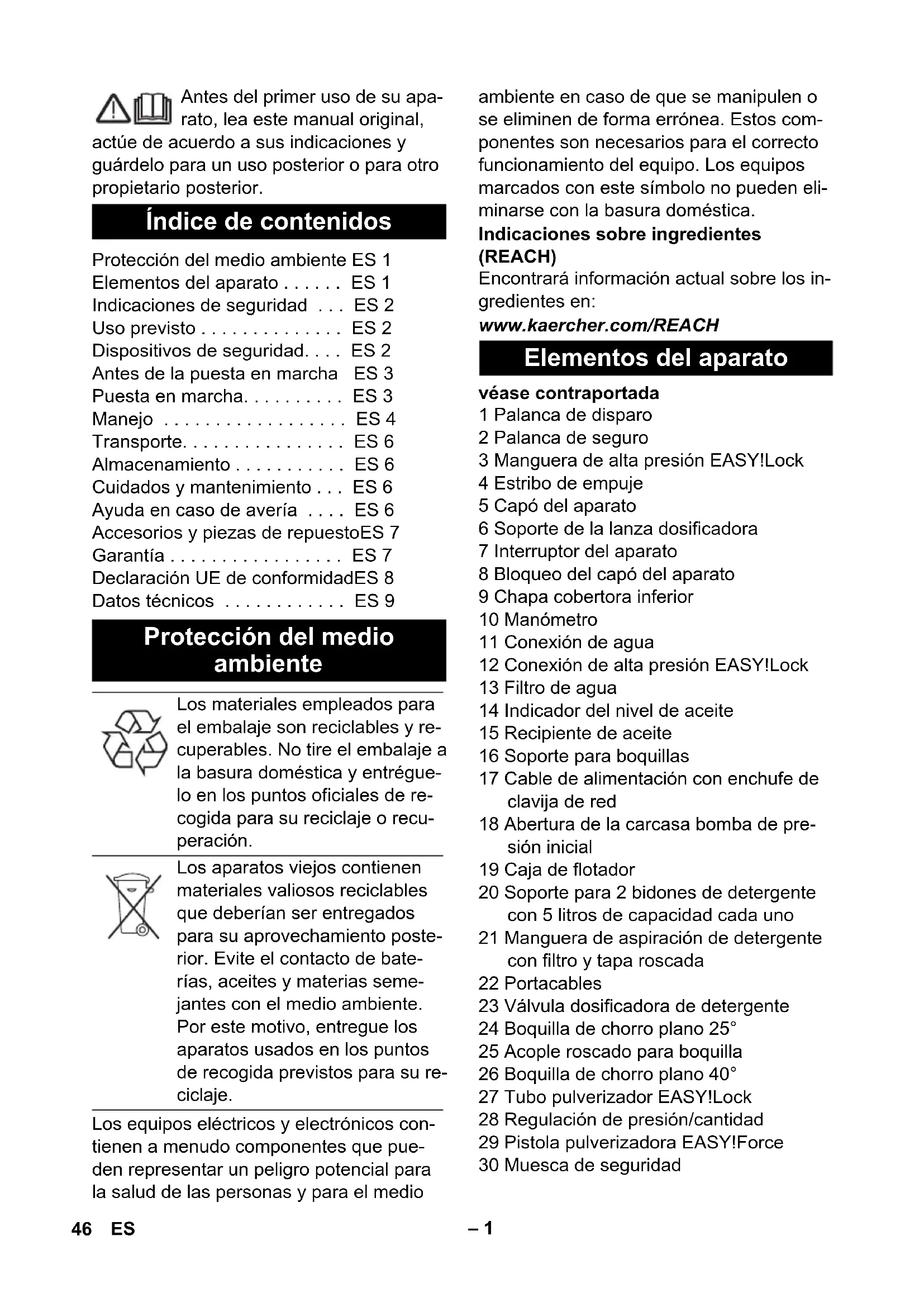 dB(A) 86 Bedrijfsstoffen Oliehoeveelheid l 0,75 Oliesoort -- Hypoid SAE 90 Maten en gewichten Lengte mm 524 Breedte mm 650 Hoogte mm 1100 Typisch bedrijfsgewicht kg 77 45NL– 1 Antes del primer uso de su apa- rato, lea este manual original, actúe de acuerdo a sus indicaciones y guárdelo para un uso posterior o para otro propietario posterior. Los equipos eléctricos y electrónicos con- tienen a menudo componentes que pue- den representar un peligro potencial para la salud de las personas y para el medio ambiente en caso de que se manipulen o se eliminen de forma errónea. Estos com- ponentes son necesarios para el correcto funcionamiento del equipo. Los equipos marcados con este símbolo no pueden eli- minarse con la basura doméstica. Indicaciones sobre ingredientes (REACH) Encontrará información actual sobre los in- gredientes en: www.kaercher.com/REACH véase contraportada 1 Palanca de disparo 2 Palanca de seguro 3 Manguera de alta presión EASY!Lock 4 Estribo de empuje 5 Capó del aparato 6 Soporte de la lanza dosificadora 7 Interruptor del aparato 8 Bloqueo del capó del aparato 9 Chapa cobertora inferior 10 Manómetro 11 Conexión de agua 12 Conexión de alta presión EASY!Lock 13 Filtro de agua 14 Indicador del nivel de aceite 15 Recipiente de aceite 16 Soporte para boquillas 17 Cable de alimentación con enchufe de clavija de red 18 Abertura de la carcasa bomba de pre- sión inicial 19 Caja de flotador 20 Soporte para 2 bidones de detergente con 5 litros de capacidad cada uno 21 Manguera de aspiración de detergente con filtro y tapa roscada 22 Portacables 23 Válvula dosificadora de detergente 24 Boquilla de chorro plano 25° 25 Acople roscado para boquilla 26 Boquilla de chorro plano 40° 27 Tubo pulverizador EASY!Lock 28 Regulación de presión/cantidad 29 Pistola pulverizadora EASY!Force 30 Muesca de seguridad Índice de contenidos Protección del medio ambiente ES 1 Elementos del aparato . . . . . . ES 1 Indicaciones de seguridad . . . ES 2 Uso previsto . . . . . . . . . . . . . . ES 2 Dispositivos de seguridad. . . . ES 2 Antes de la puesta en marcha ES 3 Puesta en marcha. . . . . . . . . . ES 3 Manejo . . . . . . . . . . . . . . . . . . ES 4 Transporte. . . . . . . . . . . . . . . . ES 6 Almacenamiento . . . . . . . . . . . ES 6 Cuidados y mantenimiento . . . ES 6 Ayuda en caso de avería . . . . ES 6 Accesorios y piezas de repuestoES 7 Garantía . . . . . . . . . . . . . . . . . ES 7 Declaración UE de conformidadES 8 Datos técnicos . . . . . . . . . . . . ES 9 Protección del medio ambiente Los materiales empleados para el embalaje son reciclables y re- cuperables. No tire el embalaje a la basura doméstica y entrégue- lo en los puntos oficiales de re- cogida para su reciclaje o recu- peración. Los aparatos viejos contienen materiales valiosos reciclables que deberían ser entregados para su aprovechamiento poste- rior. Evite el contacto de bate- rías, aceites y materias seme- jantes con el medio ambiente. Por este motivo, entregue los aparatos usados en los puntos de recogida previstos para su re- ciclaje. Elementos del aparato 46 ES– 2 – Los elementos de control para el proce- so de limpieza son amarillos. – Los elementos de control para el man- tenimiento y el servicio son de color gris claro. – ¡Antes de la primera puesta en marcha lea sin falta las instrucciones de uso y las instrucciones de seguridad n.° 5.951-949.0! – Respetar las normativas vigentes na- cionales correspondientes para eyecto- res de líquidos. – Respetar las normativas vigentes na- cionales correspondientes de preven- ción de accidentes. Los eyectores de lí- quidos deben ser examinados regular- mente y tiene que guardarse una copia escrita de la revisión. – No se debe efectuar ningún tipo de mo- dificación en el aparato/accesorios. PELIGRO Aviso sobre un riesgo de peligro inmediato que puede provocar lesiones corporales graves o la muerte. 몇 ADVERTENCIA Aviso sobre una situación propablemente peligrosa que puede provocar lesiones cor- porales graves o la muerte. 몇 PRECAUCIÓN Indicación sobre una situación que puede ser peligrosa, que puede acarrear lesiones leves. CUIDADO Aviso sobre una situación probablemente peligrosa que puede provocar daños mate- riales. Los chorros a alta presión pue- den ser peligrosos si se usan in- debidamente. No dirija el chorro hacia per- sonas, animales o equipamiento eléctrico activo, ni apunte con él al propio aparato. De acuerdo con las normativas vi- gentes, está prohibido utilizar el aparato sin un separador de siste- ma en la red de agua potable. Se debe utilizar un separador de sistema apro- piado de la empresa KÄRCHER, alternati- vamente, un separador de sistema que cumpla la norma EN 12729 tipo BA. El agua que haya pasado por un separador del sistema será catalogada como no pota- ble. 몇 PRECAUCIÓN Conectar el separador de sistema siempre a la alimentación de agua, nunca directa- mente al equipo. Usar este aparato exclusivamente para limpiar con el chorro a alta presión con/sin detergente (p. ej. industria alimentaria, ma- taderos...). Al reducir la cantidad de agua con la regu- lación de presión y caudal se abre la válvu- la de rebose y una parte del agua refluye al lado de succión de la bomba. Cuando se suelta la palanca de disparo de la pistola pulverizadora, un interruptor de presión desconecta la bomba y el chorro de alta presión se para. Cuando se acciona la palanca de disparo, se conecta la bomba nuevamente. La válvula de seguridad se abre si se so- brepasa la sobrepresión de servicio admi- sible; el agua fluye de nuevo hacia el lado de aspiración de la bomba. La válvula de derivación, el presostato y la válvula de seguridad vienen ajustados y precintados de fábrica. Los ajustes los deben realizar solamente el servicio postventa. Identificación por colores Indicaciones de seguridad Niveles de peligro Símbolos en el aparato Uso previsto Dispositivos de seguridad Válvula de derivación co