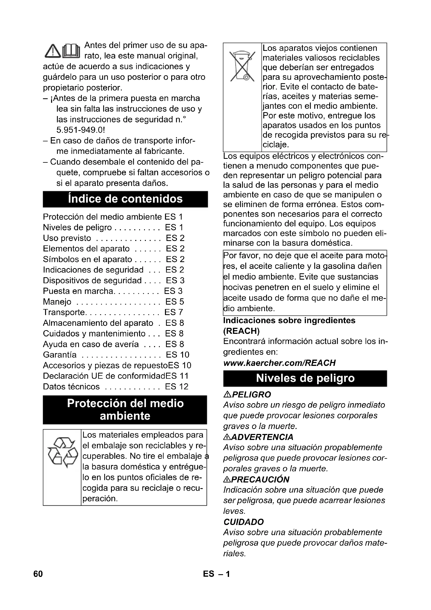 dB(A) 93 97 96 59NL– 1 Antes del primer uso de su apa- rato, lea este manual original, actúe de acuerdo a sus indicaciones y guárdelo para un uso posterior o para otro propietario posterior. – ¡Antes de la primera puesta en marcha lea sin falta las instrucciones de uso y las instrucciones de seguridad n.° 5.951-949.0! – En caso de daños de transporte infor- me inmediatamente al fabricante. – Cuando desembale el contenido del pa- quete, compruebe si faltan accesorios o si el aparato presenta daños. Los equipos eléctricos y electrónicos con- tienen a menudo componentes que pue- den representar un peligro potencial para la salud de las personas y para el medio ambiente en caso de que se manipulen o se eliminen de forma errónea. Estos com- ponentes son necesarios para el correcto funcionamiento del equipo. Los equipos marcados con este símbolo no pueden eli- minarse con la basura doméstica. Indicaciones sobre ingredientes (REACH) Encontrará información actual sobre los in- gredientes en: www.kaercher.com/REACH PELIGRO Aviso sobre un riesgo de peligro inmediato que puede provocar lesiones corporales graves o la muerte. 몇 ADVERTENCIA Aviso sobre una situación propablemente peligrosa que puede provocar lesiones cor- porales graves o la muerte. 몇 PRECAUCIÓN Indicación sobre una situación que puede ser peligrosa, que puede acarrear lesiones leves. CUIDADO Aviso sobre una situación probablemente peligrosa que puede provocar daños mate- riales. Índice de contenidos Protección del medio ambiente ES 1 Niveles de peligro . . . . . . . . . . ES 1 Uso previsto . . . . . . . . . . . . . . ES 2 Elementos del aparato . . . . . . ES 2 Símbolos en el aparato . . . . . . ES 2 Indicaciones de seguridad . . . ES 2 Dispositivos de seguridad . . . . ES 3 Puesta en marcha. . . . . . . . . . ES 3 Manejo . . . . . . . . . . . . . . . . . . ES 5 Transporte. . . . . . . . . . . . . . . . ES 7 Almacenamiento del aparato . ES 8 Cuidados y mantenimiento . . . ES 8 Ayuda en caso de avería . . . . ES 8 Garantía . . . . . . . . . . . . . . . . . ES 10 Accesorios y piezas de repuestoES 10 Declaración UE de conformidadES 11 Datos técnicos . . . . . . . . . . . . ES 12 Protección del medio ambiente Los materiales empleados para el embalaje son reciclables y re- cuperables. No tire el embalaje a la basura doméstica y entrégue- lo en los puntos oficiales de re- cogida para su reciclaje o recu- peración. Los aparatos viejos contienen materiales valiosos reciclables que deberían ser entregados para su aprovechamiento poste- rior. Evite el contacto de bate- rías, aceites y materias seme- jantes con el medio ambiente. Por este motivo, entregue los aparatos usados en los puntos de recogida previstos para su re- ciclaje. Por favor, no deje que el aceite para moto- res, el aceite caliente y la gasolina dañen el medio ambiente. Evite que sustancias nocivas penetren en el suelo y elimine el aceite usado de forma que no dañe el me- dio ambiente. Niveles de peligro 60 ES– 2 Utilice esta limpiadora a alta presión exclu- sivamente para: – limpiar máquinas, vehículos, edificios, herramientas, – con accesorios y piezas de repuesto autorizadas por Kärcher. Ilustraciones, véase la página 2 1 Pistola pulverizadora EASY!Force 2 Muesca de seguridad 3 Palanca de disparo 4 Palanca de seguro 5 Acoplamiento rotativo (no en el HD 16/15-4 Cage) 6 Manguera de alta presión EASY!Lock 7 Contador de horas de servicio (Opción) 8 Soporte de la lanza dosificadora 9 Estribo de empuje 10 Soporte de manguera/cable 11 Interruptor del aparato 12 Tapón 13 Piloto de control de estado de funciona- miento / avería 14 Cable de conexión a red con enchufe 15 Manguito de relleno de aceite (recipien- te de aceite de la HD 25/15-4) 16 Toma de agua con filtro 17 Regulación de presión/cantidad 18 Compartimento para los accesorios 19 Tornillo purgador de aceite 20 Indicador del nivel de aceite 21 Conexión de alta presión EASY!Lock 22 Manómetro 23 Travesaño para cargar con grúa 24 Boquilla para aumentar la velocidad de salida del vapor con tuerca de racor 25 Tubo pulverizador EASY!Lock 26 Regulador de rosca servo press – Los elementos de control para el proce- so de limpieza son amarillos. – Los elementos de control para el man- tenimiento y el servicio son de color gris claro. 몇 ADVERTENCIA Tenga en cuenta las normas de la empresa suministradora de agua. De acuerdo con las normativas vi- gentes, está prohibido utilizar el aparato sin un separador de siste- ma en la red de agua potable. Se debe utilizar un separador de sistema apro- piado de la empresa KÄRCHER, alternati- vamente, un separador de sistema que cumpla la norma EN 12729 tipo BA. El agua que haya pasado por un separador del sistema será catalogada como no potable. 몇 PRECAUCIÓN Conectar el separador de sistema siempre a la alimentación de agua, nunca directa- mente al equipo. PELIGRO ¡Peligro de lesiones! – Utilice solo mangueras de alta presión originales. – La manguera de alta presión y el meca- nismo pulverizador tienen que ser ap- tos para la sobrepresión de servicio máxima indicada en los datos técnicos. – Evitar el contacto con productos químicos. – Controlar diariamente la manguera de alta presión. No volver a utilizar mangueras retorcidas. Si se ve la capa exterior del alambre, no volver a utilizar la manguera de alta presión. Uso previsto Elementos del aparato Identificación por colores Símbolos en el aparato Los chorros a alta pre- sión pueden ser peligro- sos si se usan indebida- mente. No dirija el chorro hacia personas, anima- les o equipamiento eléc- trico activo, ni apunte con él al propio aparato. ¡Peligro de daños provo- cados por agua congela- da! En invierno manten- ga el aparato en un local calentado o vaciar. Indicaciones de seguridad 61ES– 3 – No volver a utilizar mangueras a pre- sión con una rosca dañada. – Colocar la manguera a presión de for- ma que no se puede pasar sobre ella. 