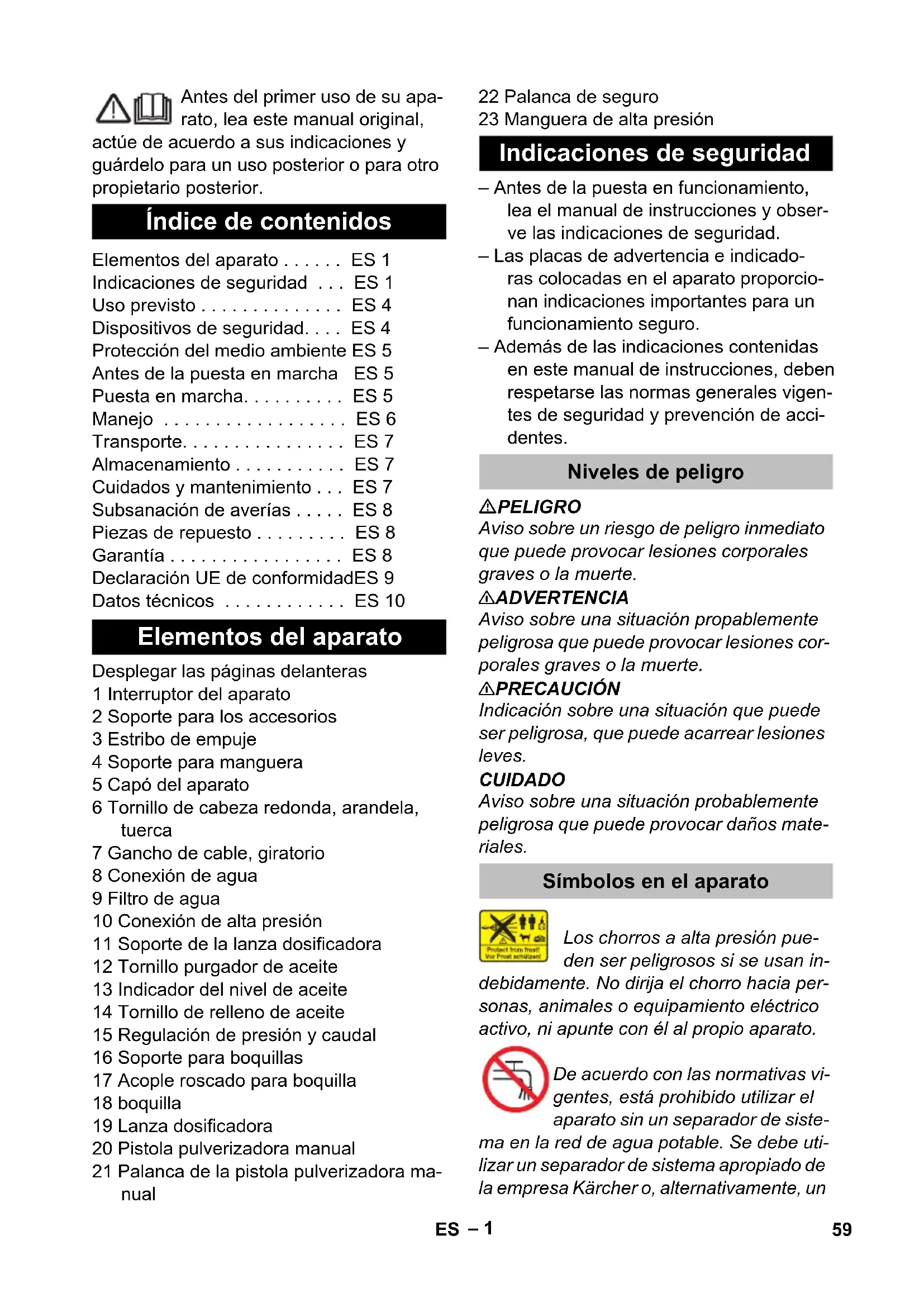 dB(A) 95 93 Bedrijfsstoffen Oliehoeveelheid l 0,4 Oliesoort -- 15W40 Maten en gewichten Lengte mm 700 Breedte mm 455 Hoogte mm 1010 Gewicht kg 55,4 60,9 Uitzondering volgens verordening (EU) 2019/1781 bijlage I punt 2 (12): j) 58 NL– 1 Antes del primer uso de su apa- rato, lea este manual original, actúe de acuerdo a sus indicaciones y guárdelo para un uso posterior o para otro propietario posterior. Desplegar las páginas delanteras 1 Interruptor del aparato 2 Soporte para los accesorios 3 Estribo de empuje 4 Soporte para manguera 5 Capó del aparato 6 Tornillo de cabeza redonda, arandela, tuerca 7 Gancho de cable, giratorio 8 Conexión de agua 9 Filtro de agua 10 Conexión de alta presión 11 Soporte de la lanza dosificadora 12 Tornillo purgador de aceite 13 Indicador del nivel de aceite 14 Tornillo de relleno de aceite 15 Regulación de presión y caudal 16 Soporte para boquillas 17 Acople roscado para boquilla 18 boquilla 19 Lanza dosificadora 20 Pistola pulverizadora manual 21 Palanca de la pistola pulverizadora ma- nual 22 Palanca de seguro 23 Manguera de alta presión – Antes de la puesta en funcionamiento, lea el manual de instrucciones y obser- ve las indicaciones de seguridad. – Las placas de advertencia e indicado- ras colocadas en el aparato proporcio- nan indicaciones importantes para un funcionamiento seguro. – Además de las indicaciones contenidas en este manual de instrucciones, deben respetarse las normas generales vigen- tes de seguridad y prevención de acci- dentes. PELIGRO Aviso sobre un riesgo de peligro inmediato que puede provocar lesiones corporales graves o la muerte. 몇 ADVERTENCIA Aviso sobre una situación propablemente peligrosa que puede provocar lesiones cor- porales graves o la muerte. 몇 PRECAUCIÓN Indicación sobre una situación que puede ser peligrosa, que puede acarrear lesiones leves. CUIDADO Aviso sobre una situación probablemente peligrosa que puede provocar daños mate- riales. Los chorros a alta presión pue- den ser peligrosos si se usan in- debidamente. No dirija el chorro hacia per- sonas, animales o equipamiento eléctrico activo, ni apunte con él al propio aparato. De acuerdo con las normativas vi- gentes, está prohibido utilizar el aparato sin un separador de siste- ma en la red de agua potable. Se debe uti- lizar un separador de sistema apropiado de la empresa Kärcher o, alternativamente, un Índice de contenidos Elementos del aparato . . . . . . ES 1 Indicaciones de seguridad . . . ES 1 Uso previsto . . . . . . . . . . . . . . ES 4 Dispositivos de seguridad. . . . ES 4 Protección del medio ambiente ES 5 Antes de la puesta en marcha ES 5 Puesta en marcha. . . . . . . . . . ES 5 Manejo . . . . . . . . . . . . . . . . . . ES 6 Transporte. . . . . . . . . . . . . . . . ES 7 Almacenamiento . . . . . . . . . . . ES 7 Cuidados y mantenimiento . . . ES 7 Subsanación de averías . . . . . ES 8 Piezas de repuesto . . . . . . . . . ES 8 Garantía . . . . . . . . . . . . . . . . . ES 8 Declaración UE de conformidadES 9 Datos técnicos . . . . . . . . . . . . ES 10 Elementos del aparato Indicaciones de seguridad Niveles de peligro Símbolos en el aparato 59ES– 2 separador de sistema que cumpla la norma EN 12729 tipo BA. El agua que haya pasado por un separador del sistema será catalogada como no pota- ble. El aparato tiene superficies ca- lientes que pueden provocar que- maduras. Peligro por descarga eléctrica. Solo personal eléctrico especiali- zado debe abrir la carcasa. – La tensión de la fuente de corriente tie- ne que coincidir con la indicada en la placa de características. – Protección mínima por fusible de la toma de corriente (véase Datos técnicos). – Clase de protección I - Los aparatos sólo pueden ser conectados a fuentes de co- rrientes con puesta a tierra correcta. – Se recomienda conectar el aparato úni- camente a un enchufe que esté asegu- rado con un interruptor de protección de corriente de defecto de 30 mA. – Se debe utilizar la conexión a red indicada por el fabricante, esto también es válido a la hora de sustituir el cable. Ref. y tipo véase manual de instrucciones. – Antes de cada puesta en marcha, com- pruebe si el cable de conexión y el en- chufe de red están dañados. Si el cable de conexión estuviera dañado, debe pedir inmediatamente a un electricista especializado del servicio técnico auto- rizado que lo sustituya. – El aparato sólo debe estar conectado a una conexión eléctrica que haya sido realizada por un electricista de confor- midad con la norma CEI 60364-1. – Los procesos de conexión generan caí- das breves de tensión. – En condiciones desfavorables de red pueden aparecer influencias negativas de otros aparatos. – No toque nunca la clavija con las ma- nos mojadas. – Debe tener cuidado de no dañar ni es- tropear el cable de conexión a red y el cable de prolongación por pisarlos, aplastarlos, tirar de ellos, u otras accio- nes similares. Proteja el cable de red del calor, aceite o cantos afilados. – El cable alargador tiene que tener el corte trasversal mostrado en el manual de instrucciones y estar protegido ante chorros de agua. La conexión no debe sumergirse en agua. – El enchufe y el acoplamiento de un con- ducto de prolongación tienen que ser estancos y no pueden estar dentro del agua. El acoplamiento no puede seguir en el suelo. Se recomienda utilizar en- rolladores de cables que garantizan que los enchufes estén al menos a 60 mm del suelo. – Los cables eléctricos prolongadores in- adecuados pueden ser peligrosos. Para el exterior, utilice solo cables de prolongación eléctricos autorizados ex- presamente para ello, adecuadamente marcados y con una sección de cable suficiente: – Comprobar regularmente si el cable tie- ne daños, como fisuras o desgaste. Si se detecta daños, sustituir el cable an- tes de volver a utilizarlo. – Al reemplazar los acoplamientos en el cable de conexión a la red o cable pro- longador deben perm