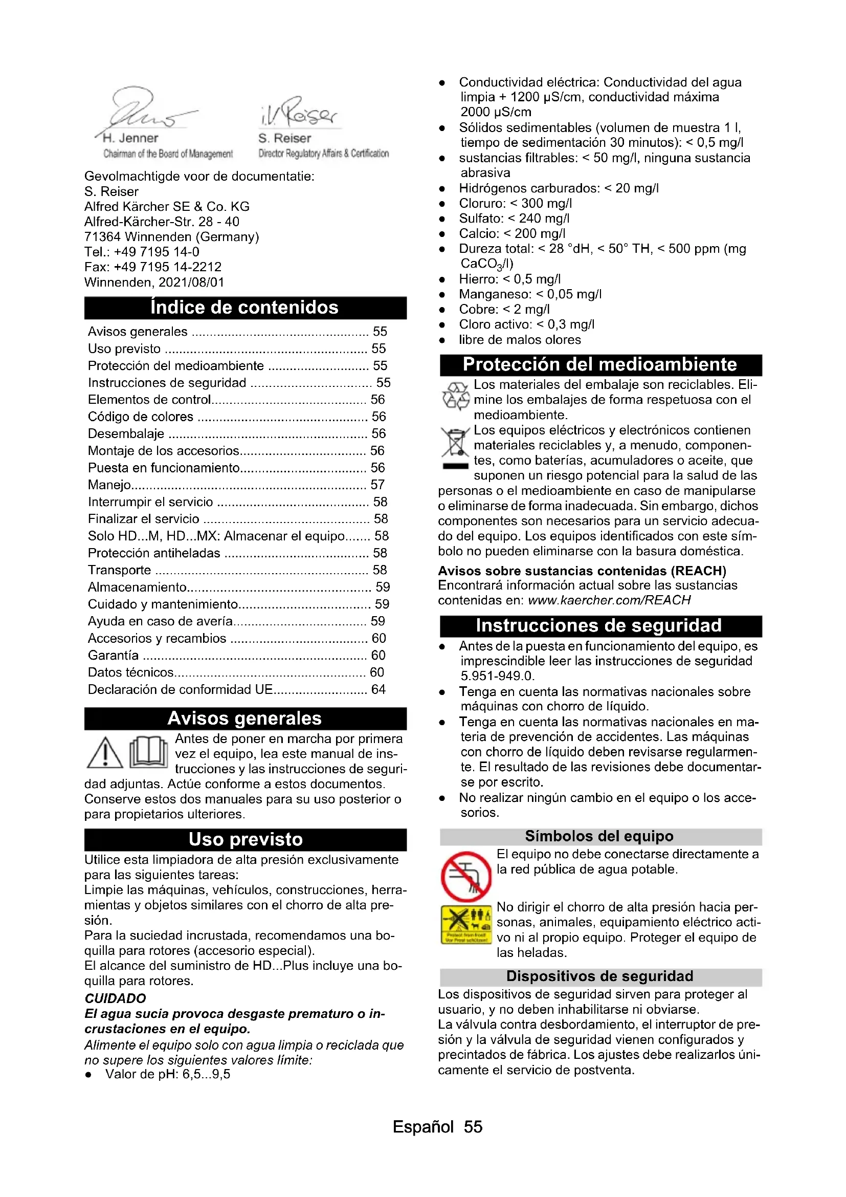 • /l) ● Hierro: < 0,5 mg/l ● Manganeso: < 0,05 mg/l ● Cobre: < 2 mg/l ● Cloro activo: < 0,3 mg/l ● libre de malos olores Protección del medioambiente Los materiales del embalaje son reciclables. Eli- mine los embalajes de forma respetuosa con el medioambiente. Los equipos eléctricos y electrónicos contienen materiales reciclables y, a menudo, componen- tes, como baterías, acumuladores o aceite, que suponen un riesgo potencial para la salud de las personas o el medioambiente en caso de manipularse o eliminarse de forma inadecuada. Sin embargo, dichos componentes son necesarios para un servicio adecua- do del equipo. Los equipos identificados con este sím- bolo no pueden eliminarse con la basura doméstica. Avisos sobre sustancias contenidas (REACH) Encontrará información actual sobre las sustancias contenidas en: www.kaercher.com/REACH Instrucciones de seguridad ● Antes de la puesta en funcionamiento del equipo, es imprescindible leer las instrucciones de seguridad 5.951-949.0. ● Tenga en cuenta las normativas nacionales sobre máquinas con chorro de líquido. ● Tenga en cuenta las normativas nacionales en ma- teria de prevención de accidentes. Las máquinas con chorro de líquido deben revisarse regularmen- te. El resultado de las revisiones debe documentar- se por escrito. ● No realizar ningún cambio en el equipo o los acce- sorios. Símbolos del equipo El equipo no debe conectarse directamente a la red pública de agua potable. No dirigir el chorro de alta presión hacia per- sonas, animales, equipamiento eléctrico acti- vo ni al propio equipo. Proteger el equipo de las heladas. Dispositivos de seguridad Los dispositivos de seguridad sirven para proteger al usuario, y no deben inhabilitarse ni obviarse. La válvula contra desbordamiento, el interruptor de pre- sión y la válvula de seguridad vienen configurados y precintados de fábrica. Los ajustes debe realizarlos úni- camente el servicio de postventa. Avisos generales p. 55