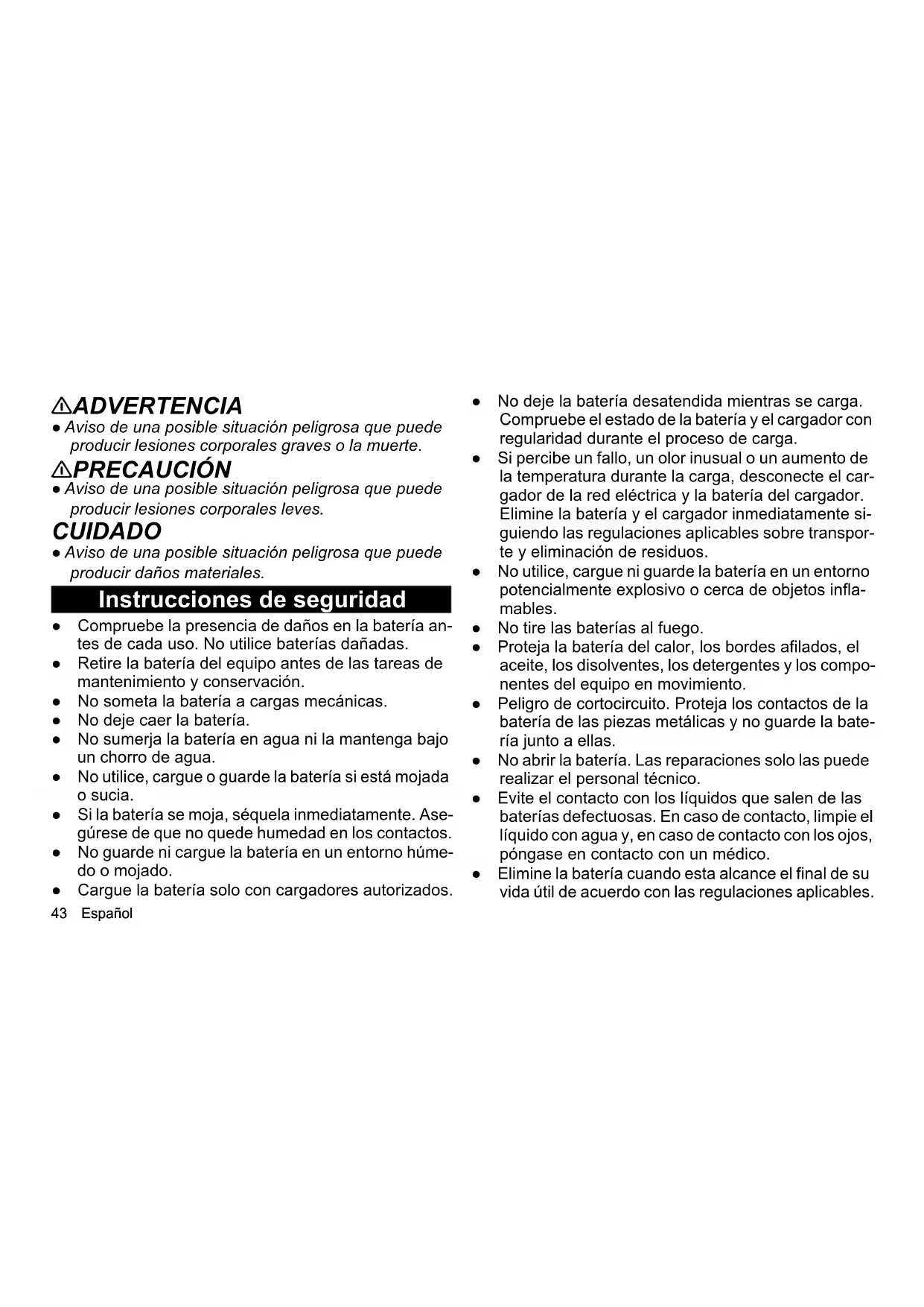 dig opladen. Technische gegevens 18/25 18/50 36/25 36/50 Elektrische aansluiting Nominale spanning accupack V 18 18 36 36 Accu-platform Battery Po- wer Battery Po- wer Battery Po- wer Battery Power Compatibel met accuplatform Battery Po- wer + Battery Po- wer + Battery Po- wer + Battery Power +Español 42 Technische wijzigingen voorbehouden. Avisos generales Antes de utilizar por primera vez la batería, lea este ma- nual original y el manual de instrucciones del equipo/ cargador Battery Power/Battery Power+ de KÄRCHER en el que se utiliza la batería o en el que la batería debe cargarse. Conserve todos los manuales para su uso posterior o para futuros propietarios. Niveles de peligro PELIGRO ● Aviso de un peligro inminente que produce lesiones corporales graves o la muerte. Accupacktype Li-ION Li-ION Li-ION Li-ION Nominale capaciteit (conform IEC/EN 61960) Ah 2,5 5,0 2,5 5,0 Nominale energie Wh 45 90 90 180 Laadstroom max. A 3,5 7,5 3,5 7,5 Afmetingen en gewichten Gewicht kg 0,5 0,8 0,9 1,5 Bedrijfstemperatuur °C -20 - 40 -20 - 40 -20 - 40 -20 - 40 Oplaadtemperatuur °C 4 - 40 4 - 40 4 - 40 4 - 40 Opslagtemperatuur °C -20 - 60 -20 - 60 -20 - 60 -20 - 60 Lengte x breedte x hoogte mm 133 x 88 x 50 133 x 88 x 72 133 x 88 x 72 133 x 88 x 117,5 18/25 18/50 36/25 36/5043 Español 몇 ADVERTENCIA ● Aviso de una posible situación peligrosa que puede producir lesiones corporales graves o la muerte. 몇 PRECAUCIÓN ● Aviso de una posible situación peligrosa que puede producir lesiones corporales leves. CUIDADO ● Aviso de una posible situación peligrosa que puede producir daños materiales. Instrucciones de seguridad ● Compruebe la presencia de daños en la batería an- tes de cada uso. No utilice baterías dañadas. ● Retire la batería del equipo antes de las tareas de mantenimiento y conservación. ● No someta la batería a cargas mecánicas. ● No deje caer la batería. ● No sumerja la batería en agua ni la mantenga bajo un chorro de agua. ● No utilice, cargue o guarde la batería si está mojada o sucia. ● Si la batería se moja, séquela inmediatamente. Ase- gúrese de que no quede humedad en los contactos. ● No guarde ni cargue la batería en un entorno húme- do o mojado. ● Cargue la batería solo con cargadores autorizados. ● No deje la batería desatendida mientras se carga. Compruebe el estado de la batería y el cargador con regularidad durante el proceso de carga. ● Si percibe un fallo, un olor inusual o un aumento de la temperatura durante la carga, desconecte el car- gador de la red eléctrica y la batería del cargador. Elimine la batería y el cargador inmediatamente si- guiendo las regulaciones aplicables sobre transpor- te y eliminación de residuos. ● No utilice, cargue ni guarde la batería en un entorno potencialmente explosivo o cerca de objetos infla- mables. ● No tire las baterías al fuego. ● Proteja la batería del calor, los bordes afilados, el aceite, los disolventes, los detergentes y los compo- nentes del equipo en movimiento. ● Peligro de cortocircuito. Proteja los contactos de la batería de las piezas metálicas y no guarde la bate- ría junto a ellas. ● No abrir la batería. Las reparaciones solo las puede realizar el personal técnico. ● Evite el contacto con los líquidos que salen de las baterías defectuosas. En caso de contacto, limpie el líquido con agua y, en caso de contacto con los ojos, póngase en contacto con un médico. ● Elimine la batería cuando esta alcance el final de su vida útil de acuerdo con las regulaciones aplicables.Español 44 Instrucciones de seguridad relativas al transporte La batería de iones de litio está sujeta a los requeri- mientos relativos al transporte de mercancías peligro- sas. Si una batería no presenta daños y funciona correcta- mente, el usuario puede transportarla en el área de cir- culación pública sin otras restricciones. En caso de envío por terceros (empresa de transporte), tenga en cuenta los requerimientos relativos al embala- je y el marcado. Envíe la batería solo si la carcasa no está dañada. Pegue los contactos expuestos. Embale la caja de batería de forma firme y segura. La batería no debe poder moverse dentro del embalaje. PELIGRO ● Una batería defectuosa o que no funcione no se debe enviar y deberá eliminarse correctamente en el lugar estipulado por las regulaciones aplicables. Tenga en cuenta las normativas nacionales. Uso previsto 몇 PRECAUCIÓN Peligro de explosión. Lesiones y daños debido a batería explosiva. Cargue, use y guarde únicamente baterías en perfecto estado y completamente funcionales. Las modificaciones y las alteraciones no permitidas por el fabricante están prohibidas. No se permite ningún uso distinto al descrito. El usuario es responsable de los peligros asociados con un uso no permitido. Cargue y use las baterías solo con los equipos Battery Power/Battery Power+ de 18 V/36 V del sistema KÄR- CHER. CUIDADO ¡Las baterías solo se pueden utilizar con equipos con el mismo tipo de voltaje (18 V o 36 V)! No use ni cargue baterías con equipos con un tipo de voltaje diferente. Antes de usarla, compruebe que el tipo de voltaje (18 V/ 36 V) de la batería y el equipo coincidan. La información de voltaje se puede encontrar en el equi- po, en la batería y en la placa de características. Protección del medioambiente Los materiales de embalaje son reciclables. No ti- re los embalajes a la basura doméstica sino al re- ciclaje. Los equipos usados contienen materiales recicla- bles valiosos que han de ser reciclados. Las ba- terías contienen sustancias abrasivas que no45 Español pueden verterse al medio ambiente. Elimine los equi- pos usados y las baterías a través de los sistemas co- lectores apropiados. Tenga en cuenta las recomendaciones del legislador a la hora de manipular baterías de iones de litio. Elimine las baterías gastadas y defectuosas conforme a la nor- mativa aplicable. Avisos sobre sustancias con