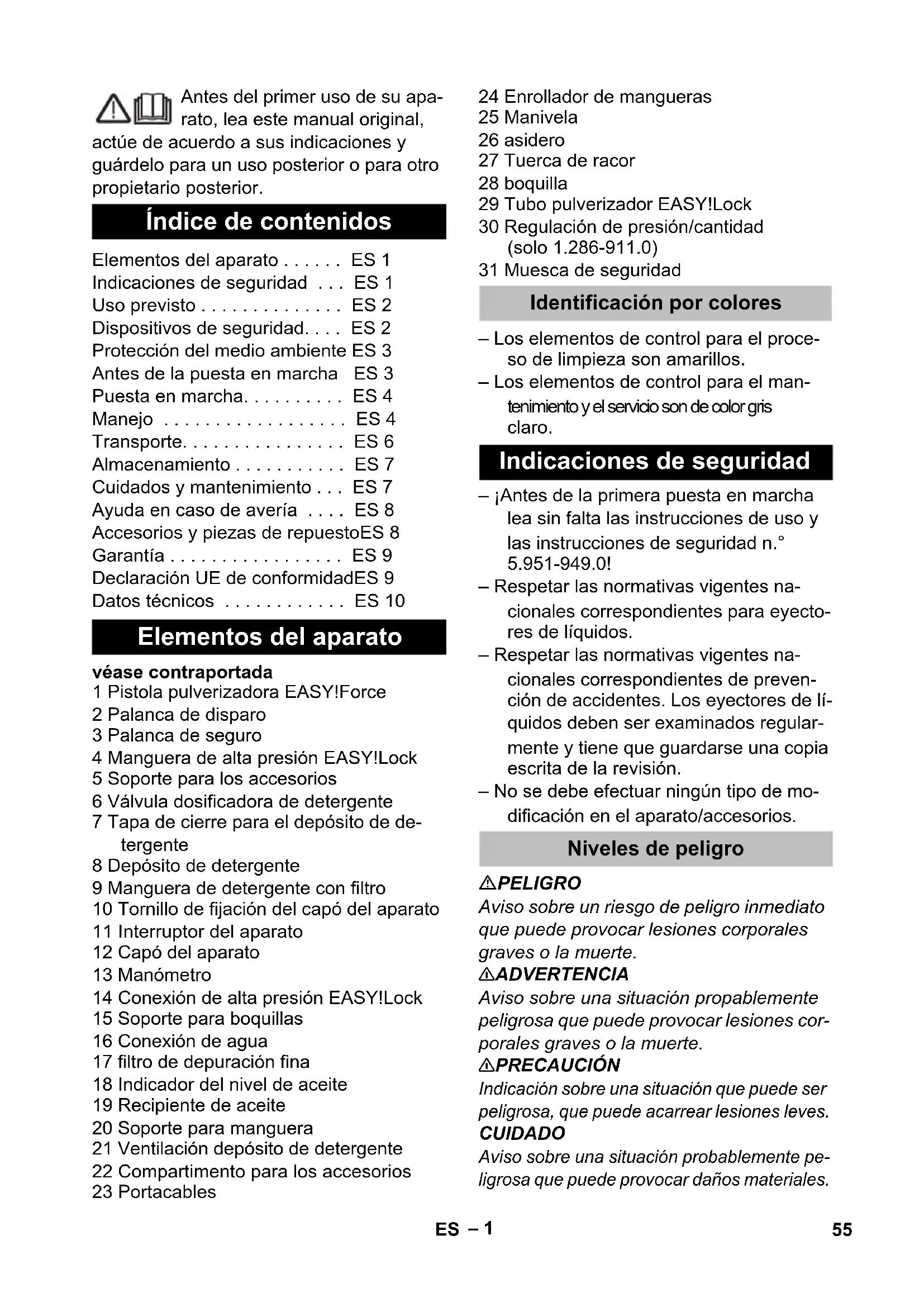 dB(A) 87 Bedrijfsstoffen Oliehoeveelheid l 1,2 Oliesoort SAE 90 Maten en gewichten Lengte x breedte x hoogte mm 560 x 500 x 1090 Gewicht zonder accessoires (SX) kg 66(68) Inhoud reinigingsmiddelreservoir l 6 Uitzondering volgens verordening (EU) 2019/1781 bijlage I punt 2 (12): j) 54 NL– 1 Antes del primer uso de su apa- rato, lea este manual original, actúe de acuerdo a sus indicaciones y guárdelo para un uso posterior o para otro propietario posterior. véase contraportada 1 Pistola pulverizadora EASY!Force 2 Palanca de disparo 3 Palanca de seguro 4 Manguera de alta presión EASY!Lock 5 Soporte para los accesorios 6 Válvula dosificadora de detergente 7 Tapa de cierre para el depósito de de- tergente 8 Depósito de detergente 9 Manguera de detergente con filtro 10 Tornillo de fijación del capó del aparato 11 Interruptor del aparato 12 Capó del aparato 13 Manómetro 14 Conexión de alta presión EASY!Lock 15 Soporte para boquillas 16 Conexión de agua 17 filtro de depuración fina 18 Indicador del nivel de aceite 19 Recipiente de aceite 20 Soporte para manguera 21 Ventilación depósito de detergente 22 Compartimento para los accesorios 23 Portacables 24 Enrollador de mangueras 25 Manivela 26 asidero 27 Tuerca de racor 28 boquilla 29 Tubo pulverizador EASY!Lock 30 Regulación de presión/cantidad (solo 1.286-911.0) 31 Muesca de seguridad – Los elementos de control para el proce- so de limpieza son amarillos. – Los elementos de control para el man- tenimiento y el servicio son de color gris claro. – ¡Antes de la primera puesta en marcha lea sin falta las instrucciones de uso y las instrucciones de seguridad n.° 5.951-949.0! – Respetar las normativas vigentes na- cionales correspondientes para eyecto- res de líquidos. – Respetar las normativas vigentes na- cionales correspondientes de preven- ción de accidentes. Los eyectores de lí- quidos deben ser examinados regular- mente y tiene que guardarse una copia escrita de la revisión. – No se debe efectuar ningún tipo de mo- dificación en el aparato/accesorios. PELIGRO Aviso sobre un riesgo de peligro inmediato que puede provocar lesiones corporales graves o la muerte. 몇 ADVERTENCIA Aviso sobre una situación propablemente peligrosa que puede provocar lesiones cor- porales graves o la muerte. 몇 PRECAUCIÓN Indicación sobre una situación que puede ser peligrosa, que puede acarrear lesiones leves. CUIDADO Aviso sobre una situación probablemente pe- ligrosa que puede provocar daños materiales. Índice de contenidos Elementos del aparato . . . . . . ES 1 Indicaciones de seguridad . . . ES 1 Uso previsto . . . . . . . . . . . . . . ES 2 Dispositivos de seguridad. . . . ES 2 Protección del medio ambiente ES 3 Antes de la puesta en marcha ES 3 Puesta en marcha. . . . . . . . . . ES 4 Manejo . . . . . . . . . . . . . . . . . . ES 4 Transporte. . . . . . . . . . . . . . . . ES 6 Almacenamiento . . . . . . . . . . . ES 7 Cuidados y mantenimiento . . . ES 7 Ayuda en caso de avería . . . . ES 8 Accesorios y piezas de repuestoES 8 Garantía . . . . . . . . . . . . . . . . . ES 9 Declaración UE de conformidadES 9 Datos técnicos . . . . . . . . . . . . ES 10 Elementos del aparato Identificación por colores Indicaciones de seguridad Niveles de peligro 55ES– 2 Los chorros a alta presión pue- den ser peligrosos si se usan in- debidamente. No dirija el chorro hacia per- sonas, animales o equipamiento eléctrico activo, ni apunte con él al propio aparato. De acuerdo con las normativas vi- gentes, está prohibido utilizar el apa- rato sin un separador de sistema en la red de agua potable. Se debe utili- zar un separador de sistema apropiado de la empresa KÄRCHER, alternativamente, un se- parador de sistema que cumpla la norma EN 12729 tipo BA. El agua que haya pasado por un separador del sistema será catalogada como no potable. 몇 PRECAUCIÓN Conectar el separador de sistema siempre a la alimentación de agua, nunca directa- mente al equipo. Utilizar exclusivamente esta limpiadora a presión