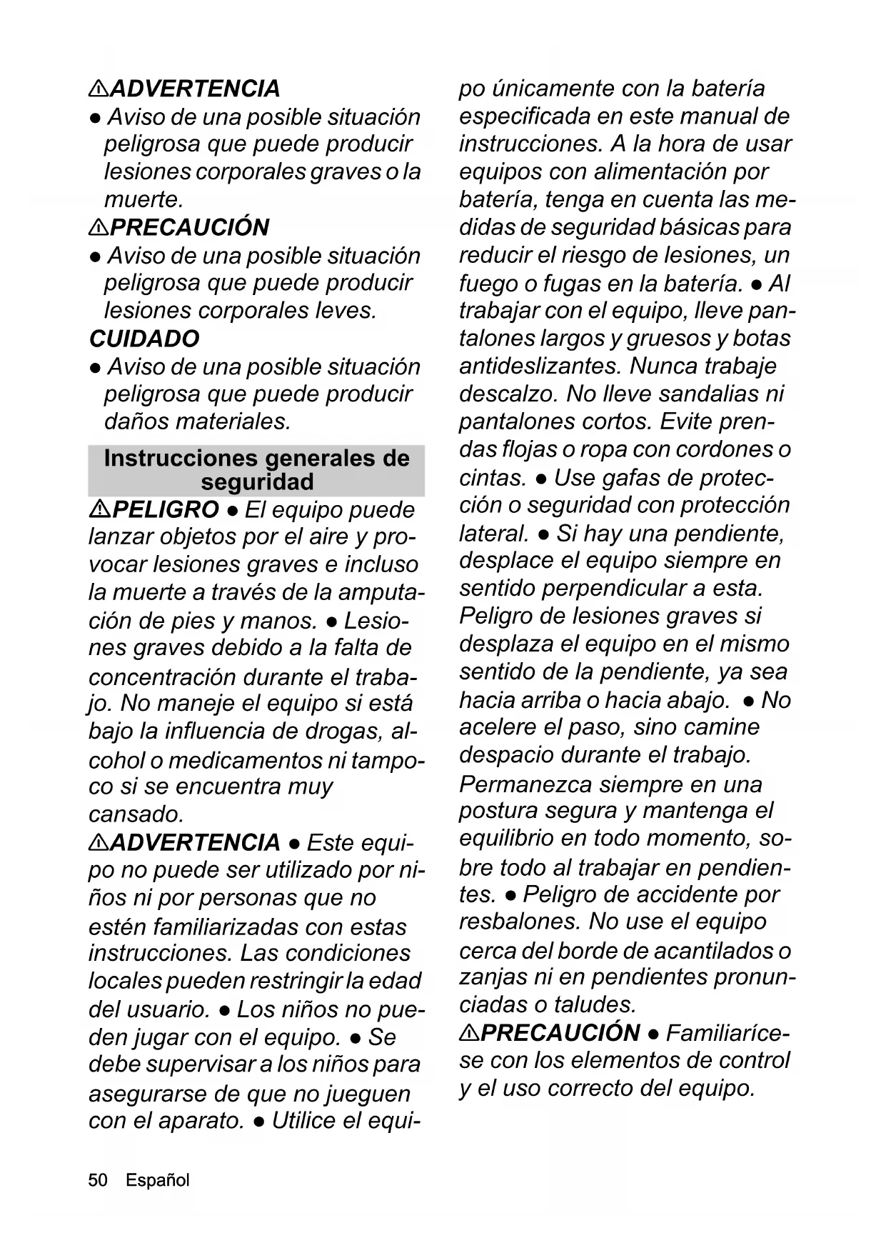 - Declaración de conformidad UE Español 몇 ADVERTENCIA ● Aviso de una posible situación peligrosa que puede producir lesiones corporales graves o la muerte. 몇 PRECAUCIÓN ● Aviso de una posible situación peligrosa que puede producir lesiones corporales leves. CUIDADO ● Aviso de una posible situación peligrosa que puede producir daños materiales. Instrucciones generales de seguridad PELIGRO ● El equipo puede lanzar objetos por el aire y pro- vocar lesiones graves e incluso la muerte a través de la amputa- ción de pies y manos. ● Lesio- nes graves debido a la falta de concentración durante el traba- jo. No maneje el equipo si está bajo la influencia de drogas, al- cohol o medicamentos ni tampo- co si se encuentra muy cansado. 몇 ADVERTENCIA ● Este equi- po no puede ser utilizado por ni- ños ni por personas que no estén familiarizadas con estas instrucciones. Las condiciones locales pueden restringir la edad del usuario. ● Los niños no pue- den jugar con el equipo. ● Se debe supervisar a los niños para asegurarse de que no jueguen con el aparato. ● Utilice el equi- po únicamente con la batería especificada en este manual de instrucciones. A la hora de usar equipos con alimentación por batería, tenga en cuenta las me- didas de seguridad básicas para reducir el riesgo de lesiones, un fuego o fugas en la batería. ● Al trabajar con el equipo, lleve pan- talones largos y gruesos y botas antideslizantes. Nunca trabaje descalzo. No lleve sandalias ni pantalones cortos. Evite pren- das flojas o ropa con cordones o cintas. ● Use gafas de protec- ción o seguridad con protección lateral. ● Si hay una pendiente, desplace el equipo siempre en sentido perpendicular a esta. Peligro de lesiones graves si desplaza el equipo en el mismo sentido de la pendiente, ya sea hacia arriba o hacia abajo. ● No acelere el paso, sino camine despacio durante el trabajo. Permanezca siempre en una postura segura y mantenga el equilibrio en todo momento, so- bre todo al trabajar en pendien- tes. ● Peligro de accidente por resbalones. No use el equipo cerca del borde de acantilados o zanjas ni en pendientes pronun- ciadas o taludes. 몇 PRECAUCIÓN ● Familiaríce- se con los elementos de control y el uso correcto del equipo.Español 51 Seguridad en el lugar de trabajo PELIGRO ● Peligro de lesio- nes graves si salen objetos des- pedidos de la cuchilla de corte o si alambres o hilos se enredan en las herramientas de corte. Antes de usar el equipo, inspec- ciones cuidadosamente la zona de trabajo en busca de piedras, palos, piezas metálicas, alam- bres, huesos o juguetes y retire cualquier obstáculo. ● No use el equipo si hay personas, espe- cialmente niños, o animales en un radio de 15 m, ya que existe riesgo de que salgan objetos despedidos de la cuchilla de corte. ● Peligro de explosión. El equipo genera chispas que pue- den prender polvo, gas o vapo- res. No utilice el equipo en entornos potencialmente explo- sivos, donde haya líquidos, ga- ses o polvos inflamables. ● Accidentes graves con la im- plicación de niños. Los niños pueden sentirse atraídos por el equipo y su actividad. Vigile a los niños, ya que puede que no se encuentren en el último sitio en el que los haya visto. 몇 ADVERTENCIA ● No utilice el equipo en césped mojado o si llueve. ● No utilice el equipo en caso de riesgo de relámpagos. ● Únicamente corte el césped con luz diurna o suficiente luz artificial. ● Mantenga los niños alejados de la zona en la que se va a cor- tar el césped y asegúrese de que están bajo la supervisión de un adulto distinto al usuario del equipo. En caso de que un niño acceda a la zona de corte, des- conecte inmediatamente el equipo. ● Tenga cuidado a la ho- ra de acercarse a ángulos muer- tos, arbustos, árboles u objetos que puedan reducir su visibili- dad. CUIDADO ● El usuario del equi- po será el responsable de posi- bles accidentes que involucren a otras personas o sus posesio- nes. Servicio seguro PELIGRO ● Cada vez que utilice el equipo, asegúrese de que la cuchilla, los pernos de la cuchilla y la unidad de cuchilla no están dañados ni excesiva- mente desgastados. ● Nunca bloquee el interruptor de cone- xión y desconexión en la posi- ción de ON; esto es muy peligroso. ● Únicamente despla- ce el equipo hacia atrás si es ab- solutamente imprescindible. Si necesita alejar el equipo de una pared o un obstáculo, eche un vistazo al suelo para evitar una caída o que pase con el equipo por encima de sus propios pies.52 Español ● Peligro de contacto con la cu- chilla descubierta o de ser al- canzado por objetos que salen despedidos. No vuelque el equi- po para arrancar el motor o con el motor en marcha. Si es im- prescindible volcar el equipo, p. ej. para facilitar el arranque, puede elevar la parte delantera del equipo unos 5 cm. Para ello, presione la empuñadura con cuidado hacia abajo. Antes de comenzar el proceso de corte debe colocar el equipo en su po- sición de servicio normal (es de- cir, con las cuatro ruedas apoyadas en el suelo). ● Aque- llas cuchillas que estén en con- tacto con un cable conductor de corriente pueden electrificar las piezas de metal descubiertas del equipo y provocar una des- carga eléctrica. 몇 ADVERTENCIA ● Las cuchi- llas del equipo están afiladas. Use guantes de protección re- sistentes y trabaje con la máxi- ma atención cuando realice actividades de montaje, sustitu- ción, limpieza o comprobación de apriete de los tornillos. ● Sustituya las piezas desgasta- das o dañadas en bloque, para mantener el equilibrio. ● Asegú- rese de que el equipo está en un estado seguro mediante la com- probación regular del apriete de los pernos, tuercas y tornillos. ● Sustituya cualquier pieza des- gastada o dañada antes de po- ner en funcionamiento el equipo. ● No use el equipo si el interruptor de conexión y desco- nexión de la empuñadura no funciona correctamente. ● No us