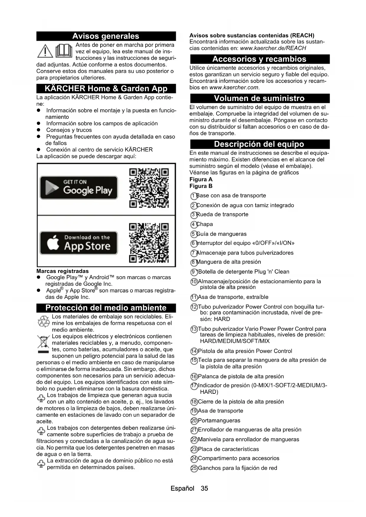 - Declaración de conformidad UE Chairman of the Board of Management Director Regulatory Affairs & Certification H. Jenner S. ReiserEspañol 35 Avisos generales Antes de poner en marcha por primera vez el equipo, lea este manual de ins- trucciones y las instrucciones de seguri- dad adjuntas. Actúe conforme a estos documentos. Conserve estos dos manuales para su uso posterior o para propietarios ulteriores. KÄRCHER Home & Garden App La aplicación KÄRCHER Home & Garden App contie- ne: Información sobre el montaje y la puesta en funcio- namiento Información sobre los campos de aplicación Consejos y trucos Preguntas frecuentes con ayuda detallada en caso de fallos Conexión al centro de servicio KÄRCHER La aplicación se puede descargar aquí: Marcas registradas Google Play™ y Android™ son marcas o marcas registradas de Google Inc. Apple p. 40