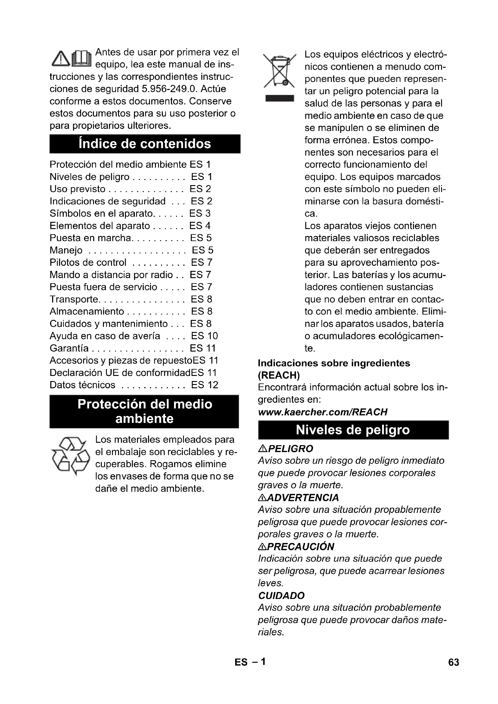 62 NL– 1 Antes de usar por primera vez el equipo, lea este manual de ins- trucciones y las correspondientes instruc- ciones de seguridad 5.956-249.0. Actúe conforme a estos documentos. Conserve estos documentos para su uso posterior o para propietarios ulteriores. Indicaciones sobre ingredientes (REACH) Encontrará información actual sobre los in- gredientes en: www.kaercher.com/REACH PELIGRO Aviso sobre un riesgo de peligro inmediato que puede provocar lesiones corporales graves o la muerte. 몇 ADVERTENCIA Aviso sobre una situación propablemente peligrosa que puede provocar lesiones cor- porales graves o la muerte. 몇 PRECAUCIÓN Indicación sobre una situación que puede ser peligrosa, que puede acarrear lesiones leves. CUIDADO Aviso sobre una situación probablemente peligrosa que puede provocar daños mate- riales. Índice de contenidos Protección del medio ambiente ES 1 Niveles de peligro . . . . . . . . . . ES 1 Uso previsto . . . . . . . . . . . . . . ES 2 Indicaciones de seguridad . . . ES 2 Símbolos en el aparato. . . . . . ES 3 Elementos del aparato . . . . . . ES 4 Puesta en marcha. . . . . . . . . . ES 5 Manejo . . . . . . . . . . . . . . . . . . ES 5 Pilotos de control . . . . . . . . . . ES 7 Mando a distancia por radio . . ES 7 Puesta fuera de servicio . . . . . ES 7 Transporte. . . . . . . . . . . . . . . . ES 8 Almacenamiento . . . . . . . . . . . ES 8 Cuidados y mantenimiento . . . ES 8 Ayuda en caso de avería . . . . ES 10 Garantía . . . . . . . . . . . . . . . . . ES 11 Accesorios y piezas de repuestoES 11 Declaración UE de conformidadES 11 Datos técnicos . . . . . . . . . . . . ES 12 Protección del medio ambiente Los materiales empleados para el embalaje son reciclables y re- cuperables. Rogamos elimine los envases de forma que no se dañe el medio ambiente. Los equipos eléctricos y electró- nicos contienen a menudo com- ponentes que pueden represen- tar un peligro potencial para la salud de las personas y para el medio ambiente en caso de que se manipulen o se eliminen de forma errónea. Estos compo- nentes son necesarios para el correcto funcionamiento del equipo. Los equipos marcados con este símbolo no pueden eli- minarse con la basura domésti- ca. Los aparatos viejos contienen materiales valiosos reciclables que deberán ser entregados para su aprovechamiento pos- terior. Las baterías y los acumu- ladores contienen sustancias que no deben entrar en contac- to con el medio ambiente. Elimi- nar los aparatos usados, batería o acumuladores ecológicamen- te. Niveles de peligro 63ES– 2 – Esta aspiradora es apta para la limpie- za en seco y en húmedo de las superfi- cies del suelo y de las paredes. – Este equipo está destinado a la aspira- ción de polvo seco no inflamable de las máquinas. – El equipo no es apto para aspirar sus- tancias húmedas y líquidas. – El aparato es apto para aspirar polvos secos, no inflamables y nocivos para la salud: clases de polvo M establecidas por la norma EN 60 335–2–69. Restric- ción: No está permitido aspirar sustan- cias cancerígenas. – Este es apto para el uso en aplicacio- nes industriales. – No viene incluido ningún accesorio. El accesorio se puede pedir por separado según la aplicación. – El funcionamiento correcto del equipo solo se garantiza con un ancho nominal de la manguera de aspiración DN42, DN52 y DN 72. El IV 100/40 M solo se puede usar con los accesorios DN 42 y DN 52. – Cualquier otro uso será considerado in- correcto. Antes de la primera puesta en marcha, leer las indicaciones de seguridad suministra- das para la aspiradora de líquidos/sólidos. PELIGRO – Cuando se retorne el aire de escape al cuarto, debe existir en el mismo una tasa suficiente de renovación de aire L. Para respetar el valor límite requerido, el flujo volumétrico retornado debe ser como máximo el 50% del flujo volumé- trico de aire exterior limpio (volumen del cuarto V