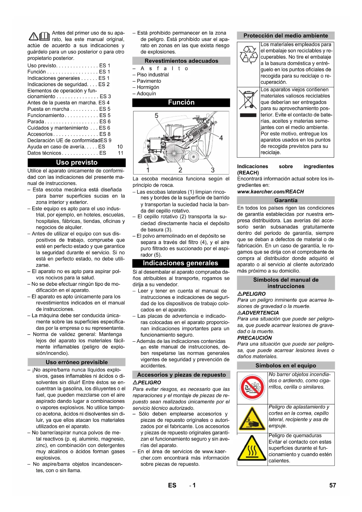 este manual de instrucciones, de- ben respetarse las normas generales vigentes de seguridad y prevención de accidentes. PELIGRO Para evitar riesgos, es necesario que las reparaciones y el montaje de piezas de re- puesto sean realizados únicamente por el servicio técnico autorizado. – Sólo deben emplearse accesorios y piezas de repuesto originales o autori- zados por el fabricante. Los accesorios y piezas de repuesto originales garanti- zan el funcionamiento seguro y sin ave- rías del aparato. – En el área de servicios de www.kaer- cher.com encontrará más información sobre piezas de repuesto. Indicaciones sobre ingredientes (REACH) Encontrará información actual sobre los in- gredientes en: www.kaercher.com/REACH En todos los países rigen las condiciones de garantía establecidas por nuestra em- presa distribuidora. Las averías del acce- sorio serán subsanadas gratuitamente dentro del periodo de garantía, siempre que se deban a defectos de material o de fabricación. En un caso de garantía, le ro- gamos que se dirija con el comprobante de compra al distribuidor donde adquirió el aparato o al servicio al cliente autorizado más próximo a su domicilio. PELIGRO Para un peligro inminente que acarrea le- siones de gravedad o la muerte. 몇 ADVERTENCIA Para una situación que puede ser peligro- sa, que puede acarrear lesiones de grave- dad o la muerte. PRECAUCIÓN Para una situación que puede ser peligro- sa, que puede acarrear lesiones leves o daños materiales. Uso previsto. . . . . . . . . . . . . . . ES 1 Función . . . . . . . . . . . . . . . . . . ES 1 Indicaciones generales . . . . . . ES 1 Indicaciones de seguridad. . . . ES 2 Elementos de operación y fun- cionamiento . . . . . . . . . . . . . . . ES 3 Antes de la puesta en marcha. ES 4 Puesta en marcha . . . . . . . . . . ES 5 Funcionamiento. . . . . . . . . . . . ES 5 Parada . . . . . . . . . . . . . . . . . . . ES 6 Cuidados y mantenimiento . . . ES 6 Accesorios . . . . . . . . . . . . . . . . ES 8 Declaración UE de conformidadES 9 Ayuda en caso de avería. . . . . ES 10 Datos técnicos. . . . . . . . . . . . . ES 11 Uso previsto Uso erróneo previsible Revestimientos adecuados Función Indicaciones generales Accesorios y piezas de repuesto Protección del medio ambiente Los materiales empleados para el embalaje son reciclables y re- cuperables. No tire el embalaje a la basura doméstica y entré- guelo en los puntos oficiales de recogida para su reciclaje o re- cuperación. Los aparatos viejos contienen materiales valiosos reciclables que deberían ser entregados para su aprovechamiento pos- terior. Evite el contacto de bate- rías, aceites y materias seme- jantes con el medio ambiente. Por este motivo, entregue los aparatos usados en los puntos de recogida previstos para su reciclaje. Garantía Símbolos del manual de instrucciones Símbolos en el equipo No barrer objetos incendia- dos o ardiendo, como ciga- rrillos, cerilla o similares. Peligro de aplastamiento y cortes en la correa, cepillo lateral, recipiente y asa de empuje. Peligro de quemaduras Evitar el contacto con estas superficies durante el fun- cionamiento y cuando estén calientes. 57ES- 2 – Antes de utilizar el equipo con sus dis- positivos de trabajo, compruebe que esté en perfecto estado y que garantice la seguridad durante el servicio. Si no está en perfecto estado, no debe utili- zarse. – Para usar el aparato en zonas con peli- gro de explosión (p. ej., gasolineras) son de obligado cumplimiento las nor- mas de seguridad correspondientes. Está prohibido usar el aparato en zonas en las que exista riesgo de explosiones. – El usuario debe utilizar el aparato con- forme a las instrucciones. Durante los trabajos con el aparato, debe tener en cuenta las condiciones locales y evitar causar daños a terceras personas, so- bre todo a niños. – Antes de comenzar el trabajo, el opera- rio se tiene que asegurar de que todos los dispositivos protectores estén colo- cados correctamente y funcionan. – El operario del aparato es responsable de cualquier accidente que ocurra con otras personas o sus propiedades. – El operario debe utilizar ropa pegada al cuerpo. Utilizar calzado fuerte y evitar llevar ropa holgada. – Comprobar la zona cercana antes de desplazarse (ej. niños). ¡Asegurarse de disponer siempre de suficiente visibili- dad! – Para evitar un uso no autorizado, saque la llave. – Al dejar el equipo, hay que asegurarlo frente a movimientos involuntarios. – El aparato sólo debe ser utilizado por personas que hayan sido instruidas en el manejo o hayan probado su capaci- dad al respecto y a las que se les haya encargado expresamente su utiliza- ción. – El uso de este equipo está prohibido para personas (incluidos niños) con ca- pacidades físicas, sensoriales o psíqui- cas limitadas o que carezcan de expe- riencia o conocimiento. – Se debe supervisar a los niños para asegurarse de que no juegan con el aparato. Peligro Peligro de lesiones Peligro de vuelco ante pendientes dema- siado acentuadas. – En la dirección de marcha solo se admi- ten pendientes de hasta 12%. Peligro de vuelco ante una base inestable. – Mueva el aparato únicamente sobre una base firme. Peligro de vuelco ante una inclinación late- ral demasiado pronunciada. – En sentido transversal a la marcha sólo se admiten pendientes de hasta 12%. La vel ocidad de marcha se tiene que adap- tar a las particularidades. – Respetar el peso del aparato para el transporte. – Para transportar el aparato, desengan- char la batería y fijar el aparato de for- ma segura. Nota: Tendrá derecho de garantía sólo si utiliza baterías y cargadores recomenda- dos por Kärcher. – Es imprescindible respetar las indica- ciones de funcionamiento del fabrican- te de la batería y del cargador. Es im- prescindible respetar las recomenda- ciones vigentes para la manipulación de baterías. – No dejar las baterías descargadas, car- garlas de nuevo tan pronto como
