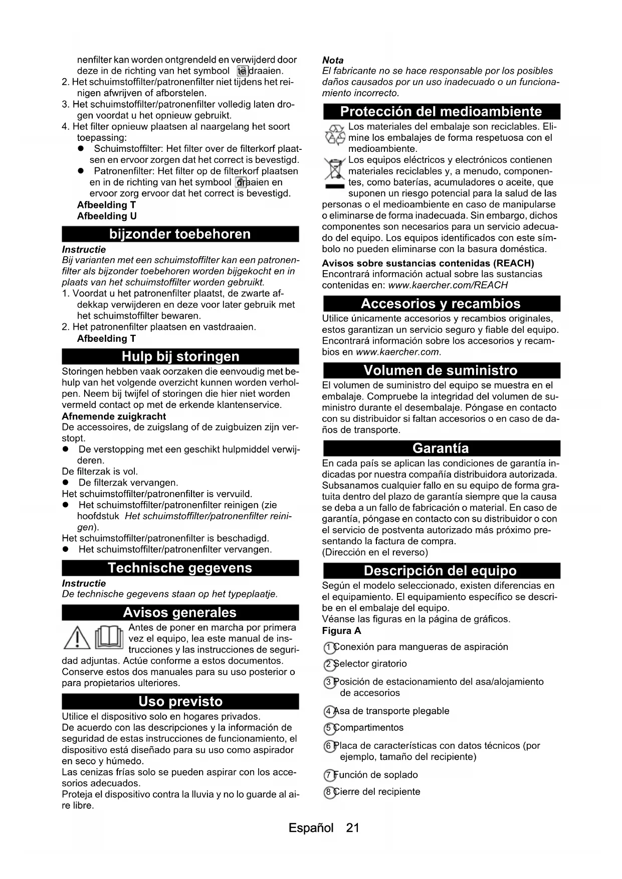 Afbeelding T Hulp bij storingen Storingen hebben vaak oorzaken die eenvoudig met be- hulp van het volgende overzicht kunnen worden verhol- pen. Neem bij twijfel of storingen die hier niet worden vermeld contact op met de erkende klantenservice. Afnemende zuigkracht De accessoires, de zuigslang of de zuigbuizen zijn ver- stopt. De verstopping met een geschikt hulpmiddel verwij- deren. De filterzak is vol. De filterzak vervangen. Het schuimstoffilter/patronenfilter is vervuild. Het schuimstoffilter/patronenfilter reinigen (zie hoofdstuk Het schuimstoffilter/patronenfilter reini- gen). Het schuimstoffilter/patronenfilter is beschadigd. Het schuimstoffilter/patronenfilter vervangen. Technische gegevens Instructie De technische gegevens staan op het typeplaatje. Avisos generales Antes de poner en marcha por primera vez el equipo, lea este manual de ins- trucciones y las instrucciones de seguri- dad adjuntas. Actúe conforme a estos documentos. Conserve estos dos manuales para su uso posterior o para propietarios ulteriores. Uso previsto Utilice el dispositivo solo en hogares privados. De acuerdo con las descripciones y la información de seguridad de estas instrucciones de funcionamiento, el dispositivo está diseñado para su uso como aspirador en seco y húmedo. Las cenizas frías solo se pueden aspirar con los acce- sorios adecuados. Proteja el dispositivo contra la lluvia y no lo guarde al ai- re libre. Nota El fabricante no se hace responsable por los posibles daños causados por un uso inadecuado o un funciona- miento incorrecto. Protección del medioambiente Los materiales del embalaje son reciclables. Eli- mine los embalajes de forma respetuosa con el medioambiente. Los equipos eléctricos y electrónicos contienen materiales reciclables y, a menudo, componen- tes, como baterías, acumuladores o aceite, que suponen un riesgo potencial para la salud de las personas o el medioambiente en caso de manipularse o eliminarse de forma inadecuada. Sin embargo, dichos componentes son necesarios para un servicio adecua- do del equipo. Los equipos identificados con este sím- bolo no pueden eliminarse con la basura doméstica. Avisos sobre sustancias contenidas (REACH) Encontrará información actual sobre las sustancias contenidas en: www.kaercher.com/REACH Accesorios y recambios Utilice únicamente accesorios y recambios originales, estos garantizan un servicio seguro y fiable del equipo. Encontrará información sobre los accesorios y recam- bios en www.kaercher.com. Volumen de suministro El volumen de suministro del equipo se muestra en el embalaje. Compruebe la integridad del volumen de su- ministro durante el desembalaje. Póngase en contacto con su distribuidor si faltan accesorios o en caso de da- ños de transporte. Garantía En cada país se aplican las condiciones de garantía in- dicadas por nuestra compañía distribuidora autorizada. Subsanamos cualquier fallo en su equipo de forma gra- tuita dentro del plazo de garantía siempre que la causa se deba a un fallo de fabricación o material. En caso de garantía, póngase en contacto con su distribuidor o con el servicio de postventa autorizado más próximo pre- sentando la factura de compra. (Dirección en el reverso) Descripción del equipo Según el modelo seleccionado, existen diferencias en el equipamiento. El equipamiento específico se descri- be en el embalaje del equipo. Véanse las figuras en la página de gráficos. Figura A 1 Conexión para mangueras de aspiración 2 Selector giratorio 3 Posición de estacionamiento del asa/alojamiento de accesorios 4 Asa de transporte plegable 5 Compartimentos 6 Placa de características con datos técnicos (por ejemplo, tamaño del recipiente) 7 Función de soplado 8 Cierre del recipiente22 Español 9 Cable de conexión de red con conector de red 10 Alojamiento de accesorios 11 Posición de estacionamiento para boquilla para suelos 12 Rodillo de dirección 13 Enchufe del equipo 14 Almacenamiento para mangueras, a ambos lados (WD 3/KWD 3) 15 Gancho para cables (WD 3/KWD 3) 16 Bolsa de filtro 17 Filtro para espumosa 18 Filtro de cartucho 19 Manguera de aspiración (WD 2 Plus/KWD 2) 20 Asa desmontable (WD 3/KWD 3) 21 Manguera de aspiración con conector (WD 3/KWD 3) 22 Tubos de aspiración 2 x 0,5 m 23 Boquilla para ranuras 24 ** Boquilla para suelos con aplicación para aspirar en seco y en húmedo 25 Adaptador para conectar herramientas eléctricas 26 Boquilla para suelos conmutable para alfombras y suelos resistentes (hogar) 27 Boquilla para acolchado (hogar) 28 2 bolsas de filtro (hogar) 29 Boquilla automática (automóvil) 30 Boquilla para ranuras extralarga (automóvil) 31 Pincel de aspiración con cerdas duras (automóvil) 32 Pincel de aspiración con cerdas suaves (automóvil/ taller) 33 Manguera flexible para herramientas (taller) ** No incluida en el alcance del suministro de la versión para hogar Montaje de los rodillos de dirección