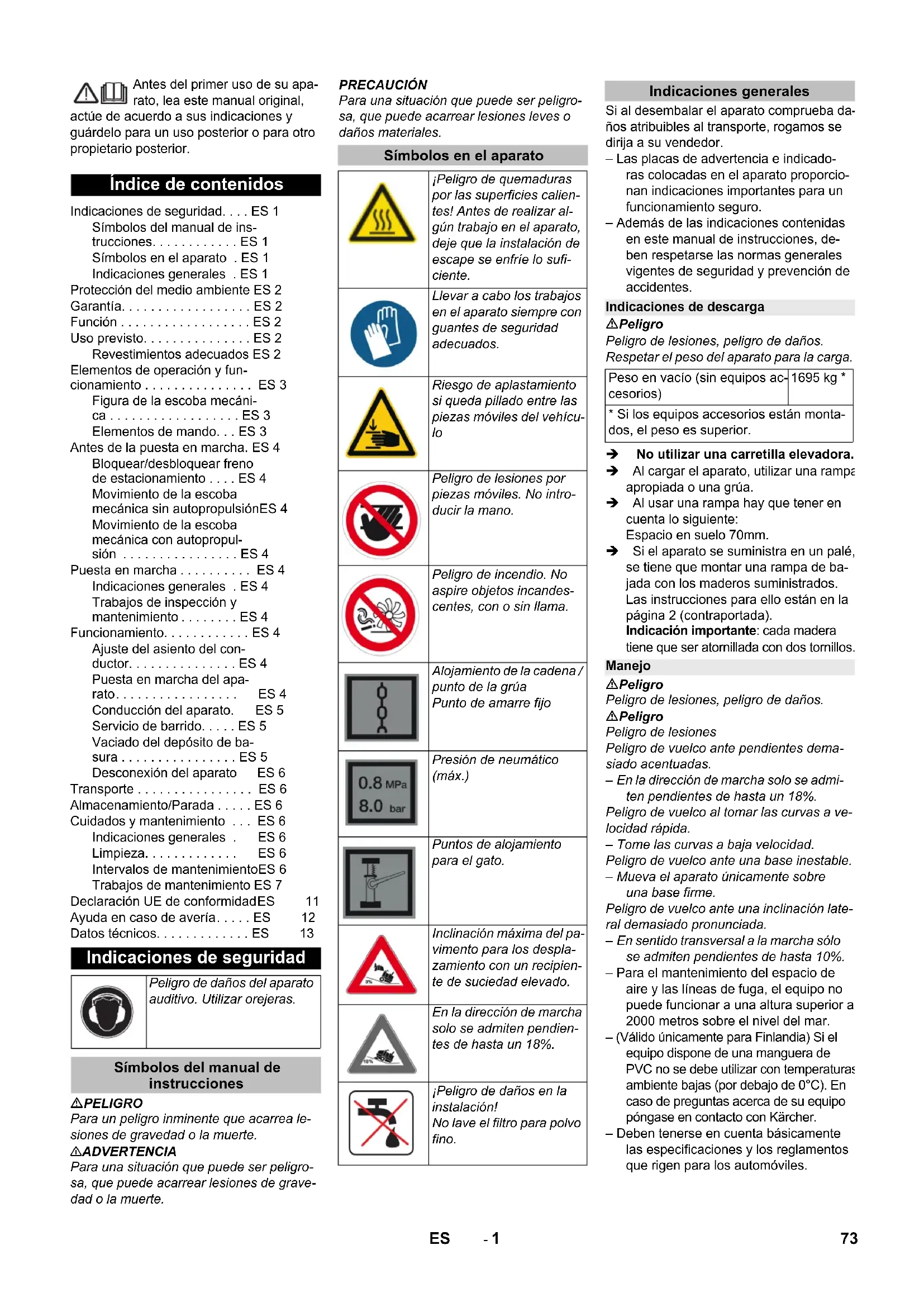 - Si los equipos accesorios están monta- dos, el peso es superior. Manejo 73ES- 2 – El usuario debe utilizar el aparato con- forme a las instrucciones. Durante los trabajos con el aparato, debe tener en cuenta las condiciones locales y evitar causar daños a terceras personas, so- bre todo a niños. – El aparato sólo debe ser utilizado por per- sonas que hayan sido instruidas en el manejo o hayan probado su capacidad al respecto y a las que se les haya encarga- do expresamente su utilización. – Los niños y los adolescentes no deben utilizar el aparato. – No se admite la presencia de acompa- ñantes. – Las máquinas con asiento sólo deben ponerse en movimiento desde dicha posición. Para evitar un uso no autorizado, saque la llave de encendido. El aparato no debe permanecer jamás sin vigilar mientras el motor esté en marcha. El usuario debe abandonar el equipo sólo con el motor parado, el se- guro contra movimientos accidentales colocado y, en caso necesario, con el freno de estacionamiento accionado y sin la llave de encendido. Peligro Peligro de lesiones – El orificio de gas de escape no debe ce- rrarse. – No doble ni agarre por el orificio de gas de escape (peligro de quemaduras). – No toque el motor de accionamiento (peligro de quemaduras). – Los gases de escape son tóxicos y no- civos para la salud, y no se deben aspi- rar. – El motor requiere aprox. 3-4 segundos de marcha por inercia tras la detención. Durante este intervalo de tiempo es im- prescindible mantenerse alejado de la zona de accionamiento. – En caso de emergencia, destruir las lu- nas con el martillo de emergencia. AVISO El martillo de emergencia se encuentra en la zona de los pedales, debajo del asiento del conductor. – Sólo deben emplearse accesorios y piezas de repuesto originales o autori- zados por el fabricante. Los accesorios y piezas de repuesto originales garanti- zan el funcionamiento seguro y sin ave- rías del aparato. – En el área de servicios de www.kaer- cher.com encontrará más información sobre piezas de repuesto. Indicaciones sobre ingredientes (REACH) Encontrará información actual sobre los in- gredientes en: www.kaercher.com/REACH En todos los países rigen las condiciones de garantía establecidas por nuestra em- presa distribuidora. Las averías del aparato serán subsanadas gratuitamente dentro del periodo de garantía, siempre que se deban a defectos de material o de fabrica- ción. En un caso de garantía, le rogamos que se dirija con el comprobante de com- pra al distribuidor donde adquirió el aparato o al servicio al cliente autorizado más próximo a su domicilio. La escoba mecánica funciona según el principio de recogedor. – El cepillo rotativo transporta la sucie- dad directamente hacia el depósito de basura. – La escoba lateral limpia rincones y bor- des de la superficie de barrido y trans- porta la suciedad hacia la banda del ce- pillo rotativo. – El polvo fino se aspira a través del filtro de polvo por el aspirador. Utilice la escoba mecánica únicamente de conformidad con las indicaciones del pre- sente manual de instrucciones. Antes de utili zar el equipo con sus dis- positivos de trabajo, compruebe que esté en perfecto estado y que garantice la seguridad durante el servicio. Si no está en perfecto estado, no debe utili- zarse. – Esta escoba mecánica está diseñada para barrer superficies sucias en la zona exterior. – No use el aparato en espacios cerrados. – Las máquinas con asiento sin un equi- pamiento apropiado (opcional de fábri- ca), no son aptas para la circulación por la vía pública. – El aparato sólo se podrá utilizar para la circulación por la vía pública tras una inspección individual realizada por la oficina oficial de supervisión. – Todas las tapas del equipo solo se pue- den abrir en áreas impermeables. – El aparato no es apto para aspirar pol- vos nocivos para la salud. – No se debe efectuar ningún tipo de mo- dificación en el aparato. – ¡No aspire/barra nunca líquidos explo- sivos, gases inflamables ni ácidos o di- solventes sin diluir! Entre éstos se en- cuentran la gasolina, los diluyentes o el fuel, que pueden mezclarse con el aire aspirado dando lugar a combinaciones o vapores explosivos. No utilice tampo- co acetona, ácidos ni disolventes sin di- luir, ya que ellos atacan los materiales utilizados en el aparato. – No aspire/barra objetos incandescen- tes, con o sin llama. – El aparato es apto únicamente para los revestimientos indicados en el manual de instrucciones. – La máquina debe ser conducida única- mente sobre las superficies especifica- das por la empresa o su representante. – Está prohibido permanecer en la zona de peligro. Está prohibido usar el apa- rato en zonas en las que exista riesgo de explosiones. – Norma de validez general: Mantenga lejos del aparato los materiales fácil- mente inflamables (peligro de explo- sión/incendio). PELIGRO ¡Peligro de lesiones! Comprobar la capaci- dad de carga del pavimento antes de co- menzar el desplazamiento. –Asfalto – Piso industrial – Pavimento – Hormigón – Adoquín PRECAUCIÓN ¡Peligro de daños en la instalación! No ba- rrer cintas, cordones o alambres, se puede enrollar en el cepillo rotativo. Aparatos con motor de combustión Aparatos con cabina del conductor Accesorios y piezas de repuesto Protección del medio ambiente Los materiales empleados para el embalaje son reciclables y re- cuperables. No tire el embalaje a la basura doméstica y entré- guelo en los puntos oficiales de recogida para su reciclaje o re- cuperación. Los aparatos viejos contienen materiales valiosos reciclables que deberían ser entregados para su aprovechamiento pos- terior. Evite el contacto de bate- rías, aceites y materias seme- jantes con el medio ambiente. Por este motivo, entregue los aparatos usados en los puntos de recogida previstos para su reciclaje. Garantía Función Uso previsto Revestimientos adecua