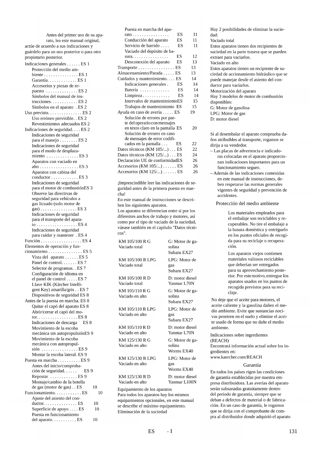 Toebehoren (KM 105/...) Benaming Bestel-nr. Zijbezem, standaard 6.966-063.0 Voor de reiniging van binnen- en buitenop- pervlakken. Zijbezem, hard 6.906-705.0 Voor het verwijderen van vastzittend vuil buiten, vochtvast. Zijbezem, zacht 6.966-065.0 Speciaal voor het opvegen van fijn stof op gladde ondergronden Veegrol, standaard 4.762-529.0 Slijtage- en vochtvast. Universele borstels voor binnen- en buitenreiniging. Keerrol, zacht 4.762-523.0 Met natuurborstels speciaal voor het opve- gen van fijn stof op gladde vloeren binnen. Niet vochtvast, niet voor abrasieve opper- vlakken. Keerrol, hard 4.762-524.0 Voor het verwijderen van vastzittend vuil buiten, vochtvast. Vlakvouwfilter (stoffilter) 6.907-352.0 Apparaat heeft 2 stuks nodig Chairman of the Board of Management Director Regulatory Affairs & Certification Toebehoren (KM 125/...) Benaming Bestel-nr. Zijbezem, standaard 6.966-063.0 Voor de reiniging van binnen- en buitenop- pervlakken. Zijbezem, hard 6.906-705.0 Voor het verwijderen van vastzittend vuil buiten, vochtvast. Zijbezem, zacht 6.966-065.0 Speciaal voor het opvegen van fijn stof op gladde ondergronden Veegrol, standaard 4.762-525.0 Slijtage- en vochtvast. Universele borstels voor binnen- en buitenreiniging. Keerrol, zacht 4.762-526.0 Met natuurborstels speciaal voor het opve- gen van fijn stof op gladde vloeren binnen. Niet vochtvast, niet voor abrasieve opper- vlakken. Keerrol, hard 4.762-527.0 Voor het verwijderen van vastzittend vuil buiten, vochtvast. Vlakvouwfilter (stoffilter) 6.907-352.0 Apparaat heeft 3 stuks nodig 130 NL- 1 Antes del primer uso de su apa- rato, lea este manual original, actúe de acuerdo a sus indicaciones y guárdelo para un uso posterior o para otro propietario posterior. ¡Imprescindible leer las indicaciones de se- guridad antes de la primera puesta en mar- cha! En este manual de instrucciones se descri- ben los siguientes aparatos. Los aparatos se diferencian entre sí por los diferentes anchos de trabajo y motores, así como por el tipo de vaciado de la suciedad, váease también en el capítulo "Datos técni- cos". Equipamiento de los aparatos Para todos los aparatos hay los mismos equipamientos opcionales, en este manual se describe el máximo equipamiento. Eliminación de la suciedad Hay 2 posibilidades de eliminar la sucie- dad: Vaciado total Estos aparatos tienen dos recipientes de suciedad en la parte trasera que se pueden extraer para vaciarlos. Vaciado en alto Estos aparatos tienen un recipiente de su- ciedad de accionamiento hidráulico que se puede manejar desde el asiento del con- ductor para vaciarlos. Motorización del aparato Hay 3 modelos de motor de combustión disponibles: G: Motor de gasolina LPG: Motor de gas D: motor diesel Si al desembalar el aparato comprueba da- ños atribuibles al transporte, rogamos se dirija a su vendedor. – Las placas de advertencia e indicado- ras colocadas en el aparato proporcio- nan indicaciones importantes para un funcionamiento seguro. – Además de las indicaciones contenidas en este manual de instrucciones, de- ben respetarse las normas generales vigentes de seguridad y prevención de accidentes. Indicaciones sobre ingredientes (REACH) Encontrará información actual sobre los in- gredientes en: www.kaercher.com/REACH En todos los países rigen las condiciones de garantía establecidas por nuestra em- presa distribuidora. Las averías del aparato serán subsanadas gratuitamente dentro del periodo de garantía, siempre que se deban a defectos de material o de fabrica- ción. En un caso de garantía, le rogamos que se dirija con el comprobante de com- pra al distribuidor donde adquirió el aparato Indicaciones generales . . . . . . ES 1 Protección del medio am- biente . . . . . . . . . . . . . . . ES 1 Garantía. . . . . . . . . . . . . ES 1 Accesorios y piezas de re- puesto . . . . . . . . . . . . . . ES 2 Símbolos del manual de ins- trucciones. . . . . . . . . . . . ES 2 Símbolos en el aparato . ES 2 Uso previsto. . . . . . . . . . . . . . . ES 2 Uso erróneo previsible. . ES 2 Revestimientos adecuados ES 2 Indicaciones de seguridad. . . . ES 2 Indicaciones de seguridad para el manejo . . . . . . . . ES 2 Indicaciones de seguridad para el modo de desplaza- miento . . . . . . . . . . . . . . ES 3 Aparatos con vaciado en alto . . . . . . . . . . . . . . . . . ES 3 Aparatos con cabina del conductor . . . . . . . . . . . . ES 3 Indicaciones de seguridad para el motor de combustiónES 3 Observe las directivas de seguridad para vehículos a gas licuado (solo motor de gas) . . . . . . . . . . . . . . . . ES 3 Indicaciones de seguridad para el transporte del apara- to . . . . . . . . . . . . . . . . . . ES 4 Indicaciones de seguridad para cuidar y mantener . ES 4 Función . . . . . . . . . . . . . . . . . . ES 4 Elementos de operación y fun- cionamiento . . . . . . . . . . . . . . . ES 5 Vista del aparato . . . . . . ES 5 Panel de control. . . . . . . ES 7 Selector de programas. . ES 7 Configuración de idioma en el panel de control . . . . . ES 7 Llave KIK (Kärcher Intelli- gent Key) amarilla/gris . . ES 7 Dispositivos de seguridad ES 8 Antes de la puesta en marcha. ES 8 Quitar el capó del aparato ES 8 Abrir/cerrar el capó del mo- tor. . . . . . . . . . . . . . . . . . ES 8 Indicaciones de descarga ES 8 Movimiento de la escoba mecánica sin autopropulsiónES 9 Movimiento de la escoba mecánica con autopropul- sión . . . . . . . . . . . . . . . . ES 9 Montar la escoba lateral. ES 9 Puesta en marcha . . . . . . . . . . ES 9 Antes del inicio/comproba- ción de seguridad. . . . . . ES 9 Repostar . . . . . . . . . . . . ES 9 Montaje/cambio de la botella de gas (motor de gas) . . ES 10 Funcionamiento. . . . . . . . . . . . ES 10 Ajuste del asiento del con- ductor. . . . . . . . . . . . . . . ES 10 Superficie de apoyo . . . . ES 10 Puesta en funcionamiento del aparato. . . . . . . . . . . ES 10 Puesta en marcha del apa- rato . . . . . . . . . . . . . . . . ES 11 Conducción del aparato ES 11 Servi
