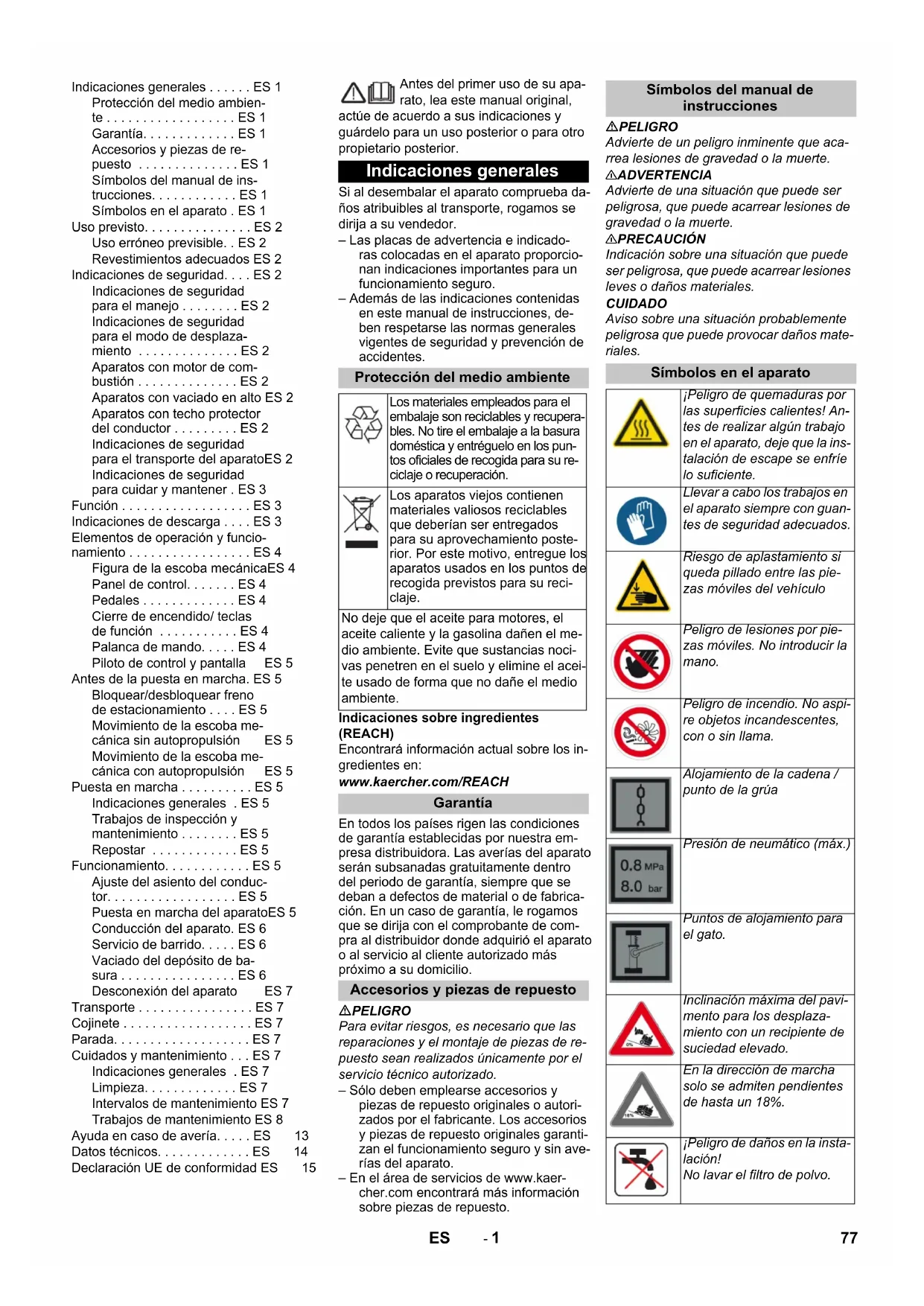 Toegepaste conformiteitsbeoordelings- procedure 2000/14/EG: Bijlage V Geluidsvermogensniveau dB(A) Gemeten: 99 Gegarandeerd: 102 Chairman of the Board of Management Director Regulatory Affairs & Certification 76 NL- 1 Antes del primer uso de su apa- rato, lea este manual original, actúe de acuerdo a sus indicaciones y guárdelo para un uso posterior o para otro propietario posterior. Si al desembalar el aparato comprueba da- ños atribuibles al transporte, rogamos se dirija a su vendedor. – Las placas de advertencia e indicado- ras colocadas en el aparato proporcio- nan indicaciones importantes para un funcionamiento seguro. – Además de las indicaciones contenidas en este manual de instrucciones, de- ben respetarse las normas generales vigentes de seguridad y prevención de accidentes. Indicaciones sobre ingredientes (REACH) Encontrará información actual sobre los in- gredientes en: www.kaercher.com/REACH En todos los países rigen las condiciones de garantía establecidas por nuestra em- presa distribuidora. Las averías del aparato serán subsanadas gratuitamente dentro del periodo de garantía, siempre que se deban a defectos de material o de fabrica- ción. En un caso de garantía, le rogamos que se dirija con el comprobante de com- pra al distribuidor donde adquirió el aparato o al servicio al cliente autorizado más próximo a su domicilio. PELIGRO Para evitar riesgos, es necesario que las reparaciones y el montaje de piezas de re- puesto sean realizados únicamente por el servicio técnico autorizado. – Sólo deben emplearse accesorios y piezas de repuesto originales o autori- zados por el fabricante. Los accesorios y piezas de repuesto originales garanti- zan el funcionamiento seguro y sin ave- rías del aparato. – En el área de servicios de www.kaer- cher.com encontrará más información sobre piezas de repuesto. PELIGRO Advierte de un peligro inminente que aca- rrea lesiones de gravedad o la muerte. 몇 ADVERTENCIA Advierte de una situación que puede ser peligrosa, que puede acarrear lesiones de gravedad o la muerte. 몇 PRECAUCIÓN Indicación sobre una situación que puede ser peligrosa, que puede acarrear lesiones leves o daños materiales. CUIDADO Aviso sobre una situación probablemente peligrosa que puede provocar daños mate- riales. Indicaciones generales . . . . . . ES 1 Protección del medio ambien- te . . . . . . . . . . . . . . . . . . ES 1 Garantía. . . . . . . . . . . . . ES 1 Accesorios y piezas de re- puesto . . . . . . . . . . . . . . ES 1 Símbolos del manual de ins- trucciones. . . . . . . . . . . . ES 1 Símbolos en el aparato . ES 1 Uso previsto. . . . . . . . . . . . . . . ES 2 Uso erróneo previsible. . ES 2 Revestimientos adecuados ES 2 Indicaciones de seguridad. . . . ES 2 Indicaciones de seguridad para el manejo . . . . . . . . ES 2 Indicaciones de seguridad para el modo de desplaza- miento . . . . . . . . . . . . . . ES 2 Aparatos con motor de com- bustión . . . . . . . . . . . . . . ES 2 Aparatos con vaciado en alto ES 2 Aparatos con techo protector del conductor . . . . . . . . . ES 2 Indicaciones de seguridad para el transporte del aparatoES 2 Indicaciones de seguridad para cuidar y mantener . ES 3 Función . . . . . . . . . . . . . . . . . . ES 3 Indicaciones de descarga . . . . ES 3 Elementos de operación y funcio- namiento . . . . . . . . . . . . . . . . . ES 4 Figura de la escoba mecánicaES 4 Panel de control. . . . . . . ES 4 Pedales . . . . . . . . . . . . . ES 4 Cierre de encendido/ teclas de función . . . . . . . . . . . ES 4 Palanca de mando. . . . . ES 4 Piloto de control y pantalla ES 5 Antes de la puesta en marcha. ES 5 Bloquear/desbloquear freno de estacionamiento . . . . ES 5 Movimiento de la escoba me- cánica sin autopropulsión ES 5 Movimiento de la escoba me- cánica con autopropulsión ES 5 Puesta en marcha . . . . . . . . . . ES 5 Indicaciones generales . ES 5 Trabajos de inspección y mantenimiento . . . . . . . . ES 5 Repostar . . . . . . . . . . . . ES 5 Funcionamiento. . . . . . . . . . . . ES 5 Ajuste del asiento del conduc- tor. . . . . . . . . . . . . . . . . . ES 5 Puesta en marcha del aparatoES 5 Conducción del aparato. ES 6 Servicio de barrido. . . . . ES 6 Vaciado del depósito de ba- sura . . . . . . . . . . . . . . . . ES 6 Desconexión del aparato ES 7 Transporte . . . . . . . . . . . . . . . . ES 7 Cojinete . . . . . . . . . . . . . . . . . . ES 7 Parada. . . . . . . . . . . . . . . . . . . ES 7 Cuidados y mantenimiento . . . ES 7 Indicaciones generales . ES 7 Limpieza. . . . . . . . . . . . . ES 7 Intervalos de mantenimiento ES 7 Trabajos de mantenimiento ES 8 Ayuda en caso de avería. . . . . ES 13 Datos técnicos. . . . . . . . . . . . . ES 14 Declaración UE de conformidad ES 15 Indicaciones generales Protección del medio ambiente Los materiales empleados para el embalaje son reciclables y recupera- bles. No tire el embalaje a la basura doméstica y entréguelo en los pun- tos oficiales de recogida para su re- ciclaje o recuperación. Los aparatos viejos contienen materiales valiosos reciclables que deberían ser entregados para su aprovechamiento poste- rior. Por este motivo, entregue los aparatos usados en los puntos de recogida previstos para su reci- claje. No deje que el aceite para motores, el aceite caliente y la gasolina dañen el me- dio ambiente. Evite que sustancias noci- vas penetren en el suelo y elimine el acei- te usado de forma que no dañe el medio ambiente. Garantía Accesorios y piezas de repuesto Símbolos del manual de instrucciones Símbolos en el aparato ¡Peligro de quemaduras por las superficies calientes! An- tes de realizar algún trabajo en el aparato, deje que la ins- talación de escape se enfríe lo suficiente. Llevar a cabo los trabajos en el aparato siempre con guan- tes de seguridad adecuados. Riesgo de aplastamiento si queda pillado entre las pie- zas móviles del vehículo Peligro de lesiones por pie- zas móviles. No introducir la mano. Peligro de inc