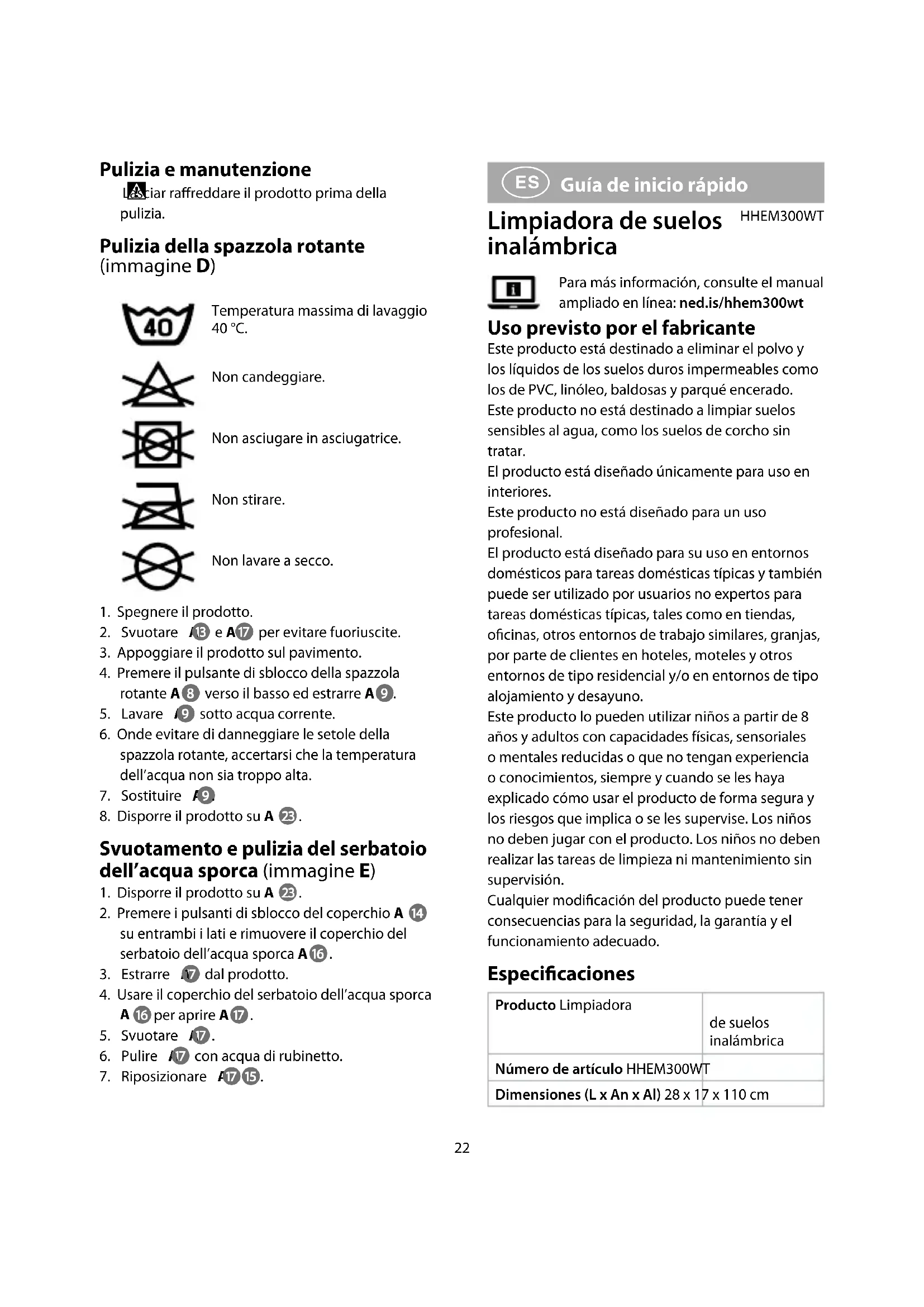 Guía de inicio rápido Limpiadora de suelos inalámbrica HHEM300WTPara más información, consulte el manual ampliado en línea: ned.is/hhem300wt Uso previsto por el fabricante Este producto está destinado a eliminar el polvo y los líquidos de los suelos duros impermeables como los de PVC, linóleo, baldosas y parqué encerado.Este producto no está destinado a limpiar suelos sensibles al agua, como los suelos de corcho sin tratar.El producto está diseñado únicamente para uso en interiores.Este producto no está diseñado para un uso profesional.El producto está diseñado para su uso en entornos domésticos para tareas domésticas típicas y también puede ser utilizado por usuarios no expertos para tareas domésticas típicas, tales como en tiendas, ocinas, otros entornos de trabajo similares, granjas, por parte de clientes en hoteles, moteles y otros entornos de tipo residencial y/o en entornos de tipo alojamiento y desayuno.Este producto lo pueden utilizar niños a partir de 8 años y adultos con capacidades físicas, sensoriales o mentales reducidas o que no tengan experiencia o conocimientos, siempre y cuando se les haya explicado cómo usar el producto de forma segura y los riesgos que implica o se les supervise. Los niños no deben jugar con el producto. Los niños no deben realizar las tareas de limpieza ni mantenimiento sin supervisión.Cualquier modicación del producto puede tener consecuencias para la seguridad, la garantía y el funcionamiento adecuado. Especicaciones Producto Limpiadora de suelos inalámbricaNúmero de artículo HHEM300WTDimensiones (L x An x Al) 28 x 17 x 110 cm Pulizia e manutenzione