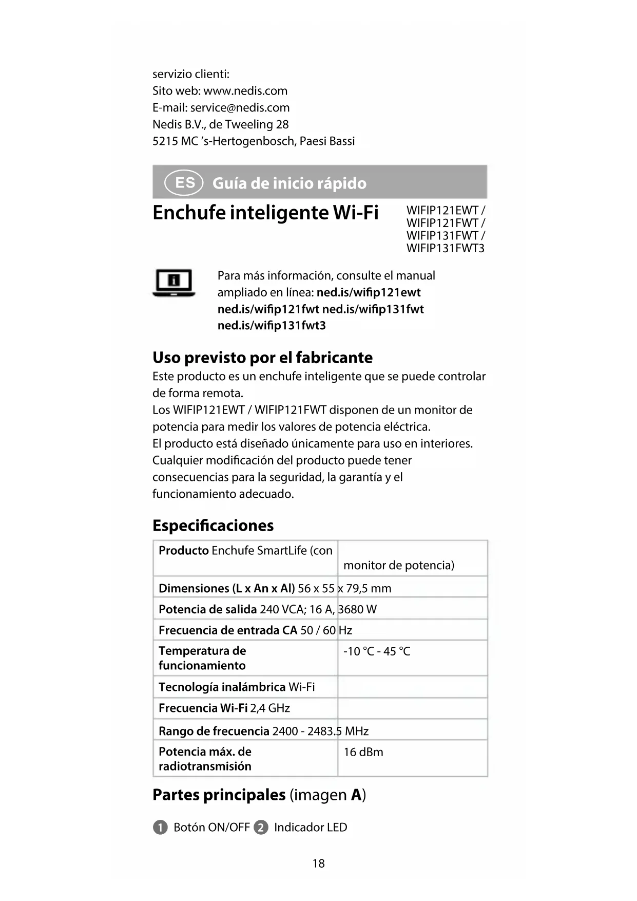 Guía de inicio rápido Enchufe inteligente Wi-Fi WIFIP121EWT / WIFIP121FWT / WIFIP131FWT / WIFIP131FWT3 Para más información, consulte el manual ampliado en línea: ned.is/wip121ewt ned.is/wip121fwt ned.is/wip131fwt ned.is/wip131fwt3 Uso previsto por el fabricante Este producto es un enchufe inteligente que se puede controlar de forma remota. Los WIFIP121EWT / WIFIP121FWT disponen de un monitor de potencia para medir los valores de potencia eléctrica. El producto está diseñado únicamente para uso en interiores. Cualquier modicación del producto puede tener consecuencias para la seguridad, la garantía y el funcionamiento adecuado. Especicaciones Producto Enchufe SmartLife (con monitor de potencia) Dimensiones (L x An x Al) 56 x 55 x 79,5 mm Potencia de salida 240 VCA; 16 A, 3680 W Frecuencia de entrada CA 50 / 60 Hz Temperatura de funcionamiento -10 °C - 45 °C Tecnología inalámbrica Wi-Fi Frecuencia Wi-Fi 2,4 GHz Rango de frecuencia 2400 - 2483.5 MHz Potencia máx. de radiotransmisión 16 dBm Partes principales (imagen A) 1 Botón ON/OFF 2 Indicador LED19 Instrucciones de seguridad