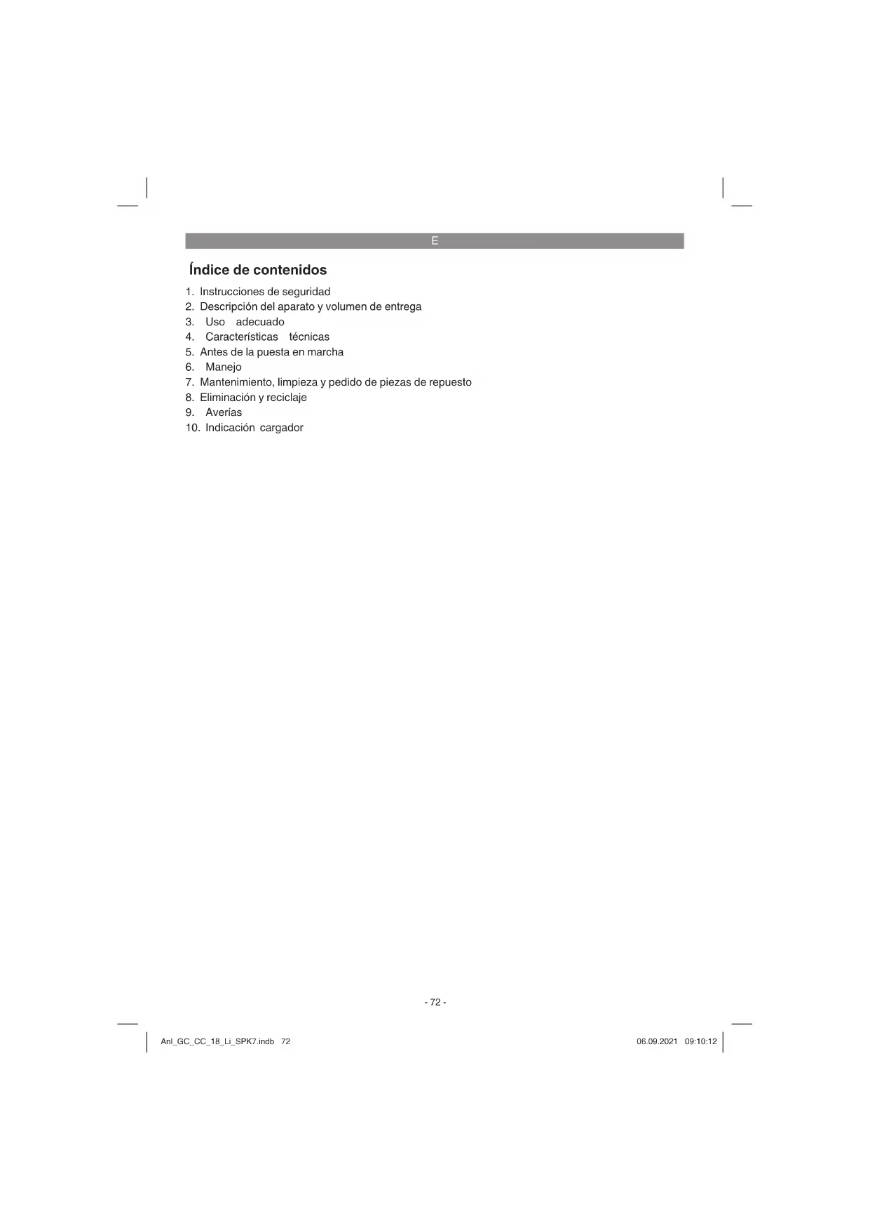 El aparato no funciona: Comprobar que la batería esté cargada y que el cargador funcione. En caso de que el aparato no funcione a pesar de haber tensión, enviarlo a la dirección indicada del servicio de asistencia técnica. Anl_GC_CC_18_Li_SPK7.indb 77Anl_GC_CC_18_Li_SPK7.indb 77 06.09.2021 09:10:1206.09.2021 09:10:12E