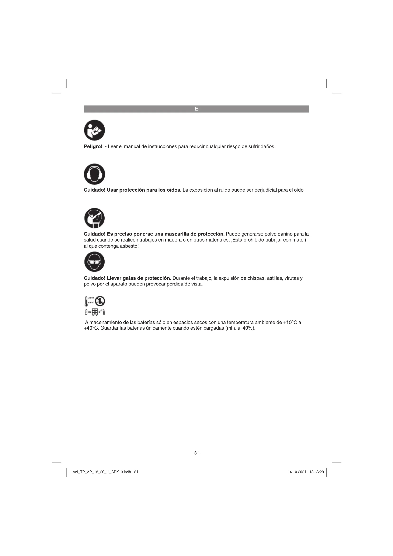 Peligro! - Leer el manual de instrucciones para reducir cualquier riesgo de sufrir daños. Cuidado! Usar protección para los oídos. La exposición al ruido puede ser perjudicial para el oído. Cuidado! Llevar gafas de protección. Durante el trabajo, la expulsión de chispas, astillas, virutas y polvo por el aparato pueden provocar pérdida de vista. Cuidado! Es preciso ponerse una mascarilla de protección. Puede generarse polvo dañino para la salud cuando se realicen trabajos en madera o en otros materiales. ¡Está prohibido trabajar con materi- al que contenga asbesto! Almacenamiento de las baterías sólo en espacios secos con una temperatura ambiente de +10°C a +40°C. Guardar las baterías únicamente cuando estén cargadas (mín. al 40%). Anl_TP_AP_18_26_Li_SPK13.indb 81Anl_TP_AP_18_26_Li_SPK13.indb 81 14.10.2021 13:53:2914.10.2021 13:53:29E