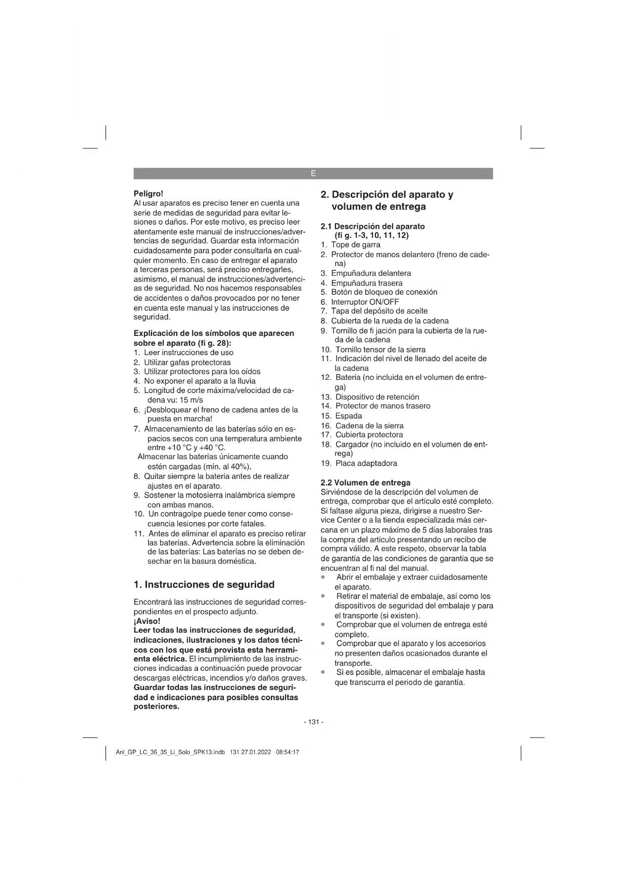 Si es posible, almacenar el embalaje hasta que transcurra el periodo de garantía. Anl_GP_LC_36_35_Li_Solo_SPK13.indb 131 27.01.2022 08:54:17E