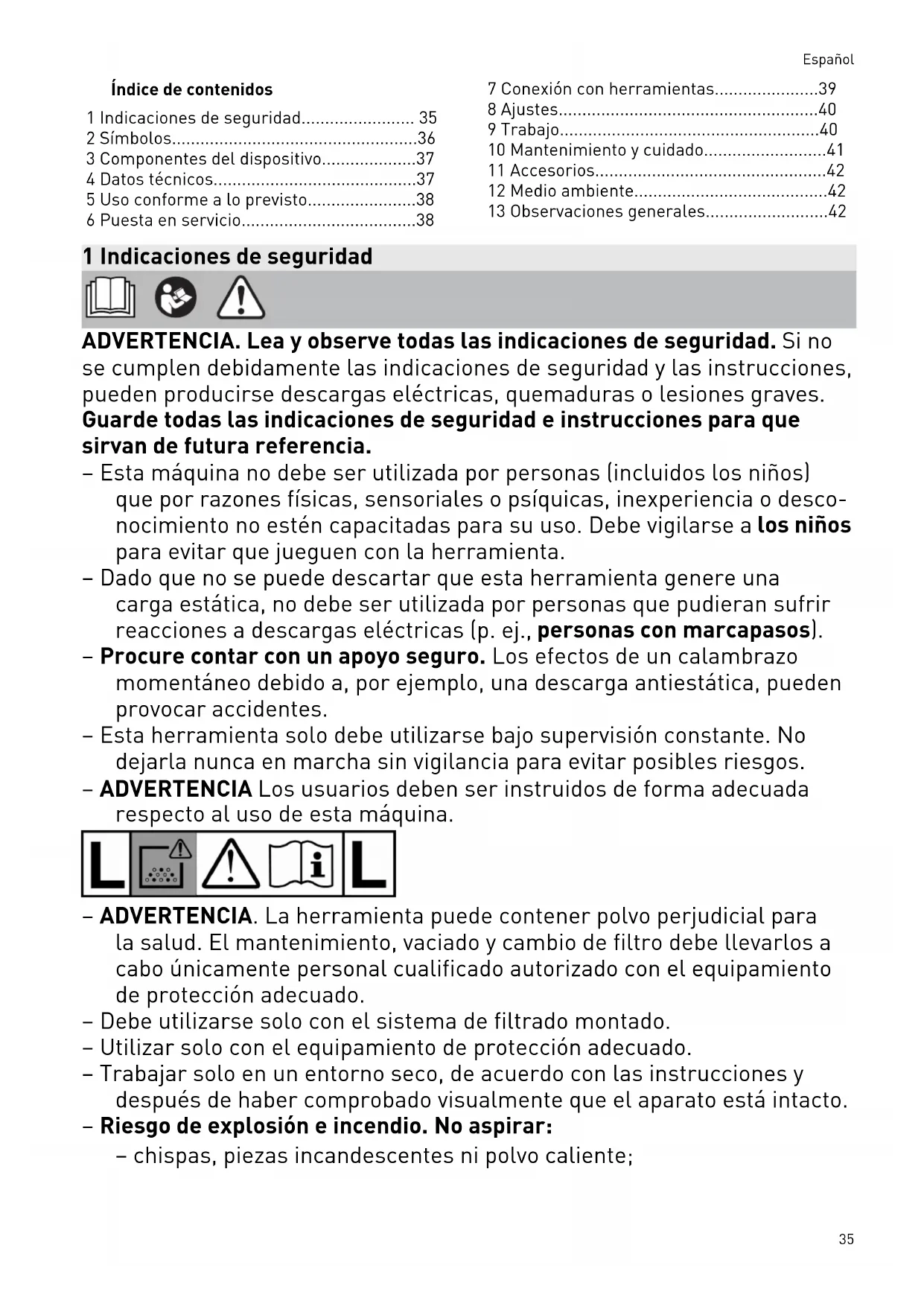 - 13 Observaciones generales 1 Indicaciones de seguridad ADVERTENCIA. Lea y observe todas las indicaciones de seguridad. Si no se cumplen debidamente las indicaciones de seguridad y las instrucciones, pueden producirse descargas eléctricas, quemaduras o lesiones graves. Guarde todas las indicaciones de seguridad e instrucciones para que sirvan de futura referencia. – Esta máquina no debe ser utilizada por personas (incluidos los niños) que por razones físicas, sensoriales o psíquicas, inexperiencia o desco nocimiento no estén capacitadas para su uso. Debe vigilarse a los niños para evitar que jueguen con la herramienta. – Dado que no se puede descartar que esta herramienta genere una carga estática, no debe ser utilizada por personas que pudieran sufrir reacciones a descargas eléctricas (p. ej., personas con marcapasos). – Procure contar con un apoyo seguro. Los efectos de un calambrazo momentáneo debido a, por ejemplo, una descarga antiestática, pueden provocar accidentes. – Esta herramienta solo debe utilizarse bajo supervisión constante. No dejarla nunca en marcha sin vigilancia para evitar posibles riesgos. – ADVERTENCIA Los usuarios deben ser instruidos de forma adecuada respecto al uso de esta máquina. – ADVERTENCIA. La herramienta puede contener polvo perjudicial para la salud. El mantenimiento, vaciado y cambio de filtro debe llevarlos a cabo únicamente personal cualificado autorizado con el equipamiento de protección adecuado. – Debe utilizarse solo con el sistema de filtrado montado. – Utilizar solo con el equipamiento de protección adecuado. – Trabajar solo en un entorno seco, de acuerdo con las instrucciones y después de haber comprobado visualmente que el aparato está intacto. – Riesgo de explosión e incendio. No aspirar: – chispas, piezas incandescentes ni polvo caliente; Español 35– materiales inflamables o explosivos (p. ej. magnesio, aluminio, gasoli na, diluyentes); – líquidos agresivos (p. ej. ácidos, lejías, disolventes); – sustancias químicas reactivas que generen calor, ácidos/bases, ga ses, etc. (p. ej. materiales de 2 componentes reactivos, aluminio y agua). – Deben respetarse las normativas de seguridad nacionales, así como las indicaciones del fabricante del material. – ADVERTENCIA Utilizar el enchufe de la máquina solo para los fines definidos en las instrucciones. – Comprobar periódicamente el enchufe, la caja de contacto, el cable y el filtro para evitar riesgos. Acudir exclusivamente a un taller autorizado para sustituir los componentes eléctricos dañados. – Antes de realizar tareas de limpieza o mantenimiento, o si necesita cambiar artículos de uso o hacer cambios en la herramienta lo primero que se debe hacer siempre es desconectar el enchufe de la corriente. – ATENCIÓN Limpiar regularmente la instalación de limitación de nivel de agua y comprobar si hay indicios de daños. – ADVERTENCIA Si sale espuma o líquido, desconectar la máquina inme diatamente. – Utilice solo el tubo flexible de aspiración original de Festool. – Tenga en cuenta el entorno de trabajo y preste atención a su propia seguridad y a la de terceros al transportar el dispositivo o al trabajar con él. De este modo, evitará el riesgo de tropiezos, p.ej., con el tubo flexible de aspiración o la conducción de red. – Transporte la herramienta agarrándola únicamente por la empuñadura prevista para ello. – No elevar ni transportar la herramienta con el gancho de una grúa o con un sistema de elevación. – Mantenga las láminas de embalaje fuera del alcance de los niños. Existe peligro de asfixia. 2 Símbolos Aviso de peligro general Peligro de electrocución ¡Leer el manual de instrucciones y las indicaciones de seguridad! Utilizar protección respiratoria. Consejo, indicación Guía de procedimiento Advertencia. La herramienta puede contener polvo perjudicial para la sa lud. Clase de protecciónL (peligro leve), apto para la aspiración de polvo con un valor límite de exposición superior a 1mg/m p. 42