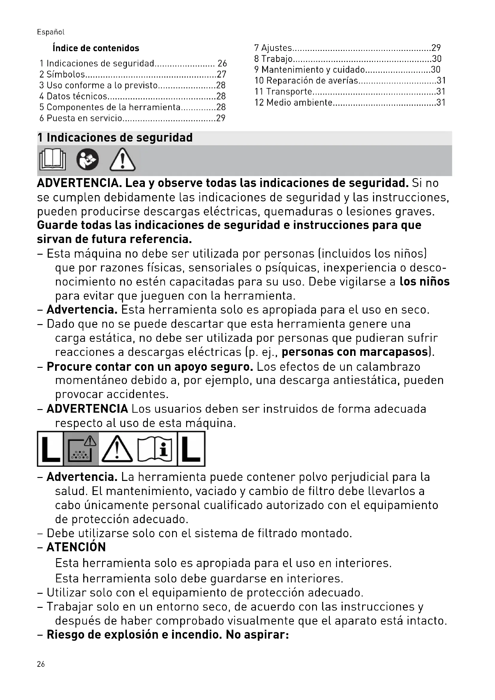 Advertencia. La herramienta puede contener polvo perjudicial para la sa lud. Prohibido subir No aspirar agua ni líquidos Proteger de la lluvia Español 27Peligro de vuelco Consejo, indicación Guía de procedimiento Marcado CE de conformidad No depositar en la basura doméstica. 3 Uso conforme a lo previsto El aspirador es adecuado para – Aspirar y limpiar el polvo con valores límite de hasta 1 mg/m³ correspondiente a la cla se de polvo L, – proporcionar un alto rendimiento en apli caciones profesionales, conforme a IEC/EN 60335-2-69. El aspirador no está recomendado para aspirar y limpiar el polvo fino de forma continua, como p. ej. polvo de cemento o emplaste. El usuario responde de cualquier uso in debido. 4 Datos técnicos Aspirador Consumo de potencia 1000W Consumo nominal máx. del enchufe de la máquina