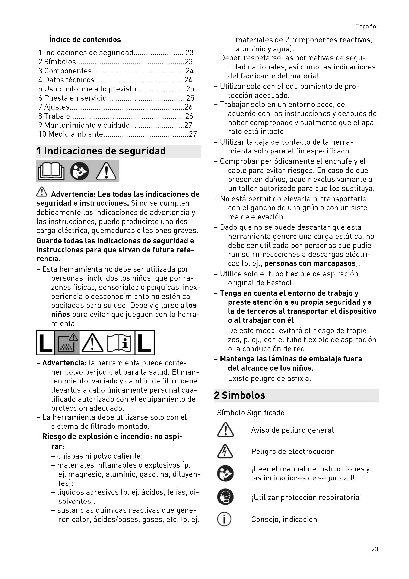 - 10 Medio ambiente 1 Indicaciones de seguridad Advertencia: Lea todas las indicaciones de seguridad e instrucciones. Si no se cumplen debidamente las indicaciones de advertencia y las instrucciones, puede producirse una des carga eléctrica, quemaduras o lesiones graves. Guarde todas las indicaciones de seguridad e instrucciones para que sirvan de futura refe rencia. – Esta herramienta no debe ser utilizada por personas (incluidos los niños) que por ra zones físicas, sensoriales o psíquicas, inex periencia o desconocimiento no estén ca pacitadas para su uso. Debe vigilarse a los niños para evitar que jueguen con la herra mienta. – Advertencia: la herramienta puede conte ner polvo perjudicial para la salud. El man tenimiento, vaciado y cambio de filtro debe llevarlos a cabo únicamente personal cua lificado autorizado con el equipamiento de protección adecuado. – La herramienta debe utilizarse solo con el sistema de filtrado montado. – Riesgo de explosión e incendio: no aspi rar: – chispas ni polvo caliente; – materiales inflamables o explosivos (p. ej. magnesio, aluminio, gasolina, diluyen tes); – líquidos agresivos (p. ej. ácidos, lejías, di solventes); – sustancias químicas reactivas que gene ren calor, ácidos/bases, gases, etc. (p. ej. materiales de 2 componentes reactivos, aluminio y agua). – Deben respetarse las normativas de segu ridad nacionales, así como las indicaciones del fabricante del material. – Utilizar solo con el equipamiento de pro tección adecuado. – Trabajar solo en un entorno seco, de acuerdo con las instrucciones y después de haber comprobado visualmente que el apa rato está intacto. – Utilizar la caja de contacto de la herra mienta solo para el fin especificado. – Comprobar periódicamente el enchufe y el cable para evitar riesgos. En caso de que presenten daños, acudir exclusivamente a un taller autorizado para que los sustituya. – No está permitido elevarla ni transportarla con el gancho de una grúa o con un siste ma de elevación. – Dado que no se puede descartar que esta herramienta genere una carga estática, no debe ser utilizada por personas que pudie ran sufrir reacciones a descargas eléctri cas (p. ej., personas con marcapasos). – Utilice solo el tubo flexible de aspiración original de Festool. – Tenga en cuenta el entorno de trabajo y preste atención a su propia seguridad y a la de terceros al transportar el dispositivo o al trabajar con él. De este modo, evitará el riesgo de tropie zos, p. ej., con el tubo flexible de aspiración o la conducción de red. – Mantenga las láminas de embalaje fuera del alcance de los niños. Existe peligro de asfixia. 2 Símbolos Símbolo Significado Aviso de peligro general Peligro de electrocución ¡Leer el manual de instrucciones y las indicaciones de seguridad! ¡Utilizar protección respiratoria! Consejo, indicación Español 23Símbolo Significado Guía de procedimiento ¡Advertencia! ¡La herramienta pue de contener polvo perjudicial para la salud! No depositar en la basura domésti ca. 3 Componentes [1-1] Orificio de aspiración [1-2] Ranura de conexión para módulo (módulo neumático para CTL 36/48 E LE, CTL 36/48 E LE AC, módulo de ca ja de contacto para CTL 26 E SD) [1-3] Caja de contacto de la máquina [1-4] Compartimento para tubos flexibles [1-5] Empuñadura [1-6] SysDoc [1-7] Limpieza automática (solo variantes con AutoClean) [1-8] Interruptor [1-9] Regulación de la capacidad de aspira ción [1-10] Pinzas de cierre [1-11] Depósito para la suciedad [1-13] Freno Las figuras indicadas se encuentran al principio del manual de instrucciones. 4 Datos técnicos Sistemas móviles de aspiración Consumo de potencia 350 ‑ 1200 W Consumo nominal máx. de la ca ja de contacto de la máquina p. 27