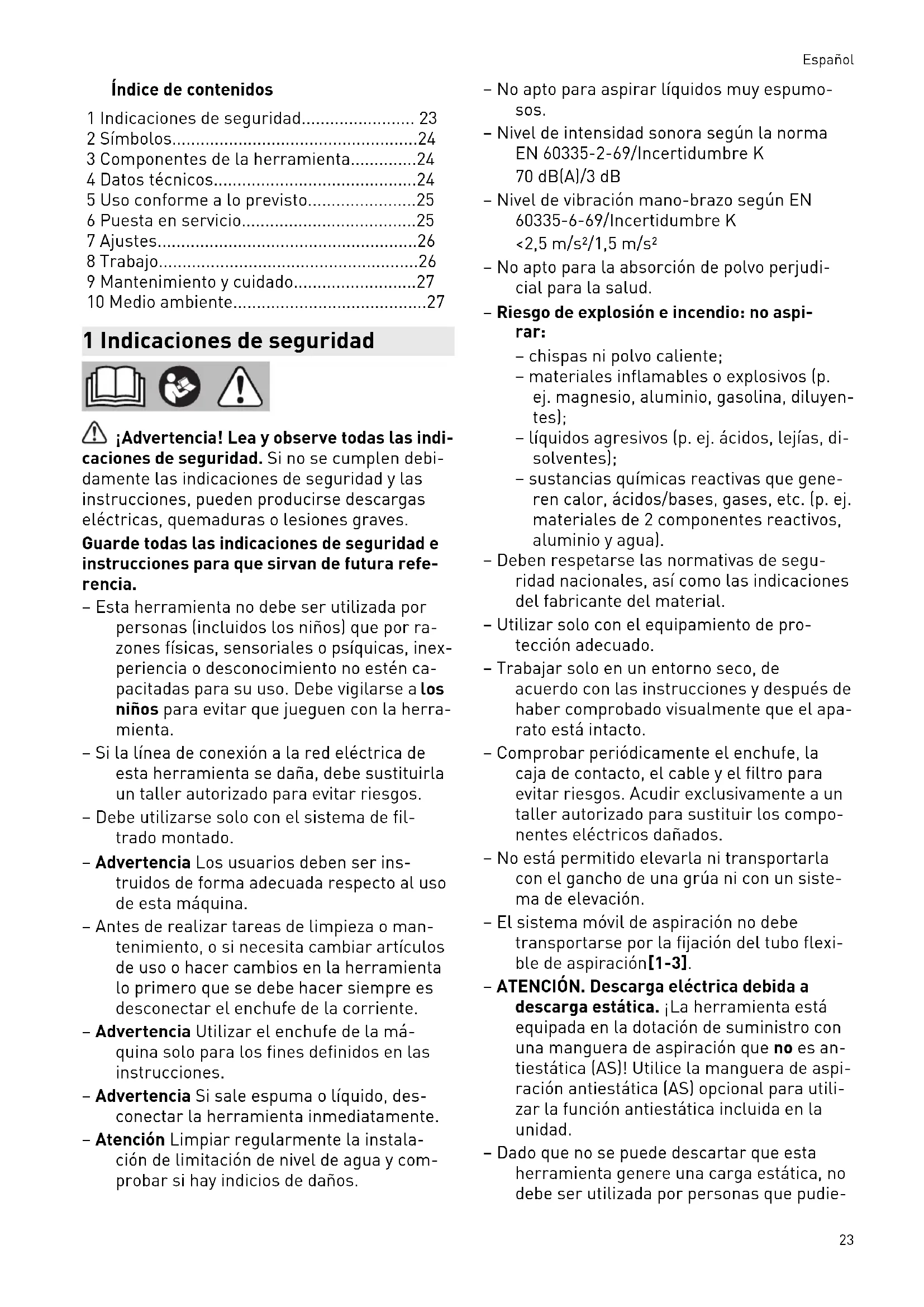 - 10 Medio ambiente 1 Indicaciones de seguridad ¡Advertencia! Lea y observe todas las indi caciones de seguridad. Si no se cumplen debi damente las indicaciones de seguridad y las instrucciones, pueden producirse descargas eléctricas, quemaduras o lesiones graves. Guarde todas las indicaciones de seguridad e instrucciones para que sirvan de futura refe rencia. – Esta herramienta no debe ser utilizada por personas (incluidos los niños) que por ra zones físicas, sensoriales o psíquicas, inex periencia o desconocimiento no estén ca pacitadas para su uso. Debe vigilarse a los niños para evitar que jueguen con la herra mienta. – Si la línea de conexión a la red eléctrica de esta herramienta se daña, debe sustituirla un taller autorizado para evitar riesgos. – Debe utilizarse solo con el sistema de fil trado montado. – Advertencia Los usuarios deben ser ins truidos de forma adecuada respecto al uso de esta máquina. – Antes de realizar tareas de limpieza o man tenimiento, o si necesita cambiar artículos de uso o hacer cambios en la herramienta lo primero que se debe hacer siempre es desconectar el enchufe de la corriente. – Advertencia Utilizar el enchufe de la má quina solo para los fines definidos en las instrucciones. – Advertencia Si sale espuma o líquido, des conectar la herramienta inmediatamente. – Atención Limpiar regularmente la instala ción de limitación de nivel de agua y com probar si hay indicios de daños. – No apto para aspirar líquidos muy espumo sos. – Nivel de intensidad sonora según la norma EN 60335-2-69/Incertidumbre K 70 dB(A)/3 dB – Nivel de vibración mano-brazo según EN 60335-6-69/Incertidumbre K <2,5 m/s²/1,5 m/s² – No apto para la absorción de polvo perjudi cial para la salud. – Riesgo de explosión e incendio: no aspi rar: – chispas ni polvo caliente; – materiales inflamables o explosivos (p. ej. magnesio, aluminio, gasolina, diluyen tes); – líquidos agresivos (p. ej. ácidos, lejías, di solventes); – sustancias químicas reactivas que gene ren calor, ácidos/bases, gases, etc. (p. ej. materiales de 2 componentes reactivos, aluminio y agua). – Deben respetarse las normativas de segu ridad nacionales, así como las indicaciones del fabricante del material. – Utilizar solo con el equipamiento de pro tección adecuado. – Trabajar solo en un entorno seco, de acuerdo con las instrucciones y después de haber comprobado visualmente que el apa rato está intacto. – Comprobar periódicamente el enchufe, la caja de contacto, el cable y el filtro para evitar riesgos. Acudir exclusivamente a un taller autorizado para sustituir los compo nentes eléctricos dañados. – No está permitido elevarla ni transportarla con el gancho de una grúa ni con un siste ma de elevación. – El sistema móvil de aspiración no debe transportarse por la fijación del tubo flexi ble de aspiración [1-3]. – ATENCIÓN. Descarga eléctrica debida a descarga estática. ¡La herramienta está equipada en la dotación de suministro con una manguera de aspiración que no es an tiestática (AS)! Utilice la manguera de aspi ración antiestática (AS) opcional para utili zar la función antiestática incluida en la unidad. – Dado que no se puede descartar que esta herramienta genere una carga estática, no debe ser utilizada por personas que pudie Español 23ran sufrir reacciones a descargas eléctri cas (p. ej., personas con marcapasos). – Deposite la herramienta únicamente en su perficies lisas y asegúrela para que no se mueva. – Tenga en cuenta el entorno de trabajo y preste atención a su propia seguridad y a la de terceros al transportar el dispositivo o al trabajar con él. De este modo, evitará el riesgo de tropie zos, p. ej., con el tubo flexible de aspiración o la conducción de red. – Mantenga las láminas de embalaje fuera del alcance de los niños. Existe peligro de asfixia. 2 Símbolos Aviso de peligro general Peligro de electrocución ¡Leer el manual de instrucciones y las indicaciones de seguridad! No depositar en la basura doméstica. Desenchufar Utilizar protección respiratoria. Prohibido subir 3 Componentes de la herramienta [1-1] Caja de contacto de la máquina [1-2] Depósito de cables y accesorios [1-3] Fijación del tubo flexible de aspira ción [1-4] Empuñadura [1-5] Bloqueo [1-6] Cajón de filtro [1-7] Abrazaderas de cierre [1-8] Abertura de soplado [1-9] Depósito para suciedad [1-10] Interruptor de conexión y descone xión [1-11] Tecla MAN [1-12] Regulación del cable de aspiración Las figuras indicadas se encuentran al principio del manual de instrucciones. 4 Datos técnicos Sistemas móviles de aspiración Consumo de potencia 350 - 1.200 W Consumo nominal máx. del enchufe de la máquina EU CH, DK p. 27