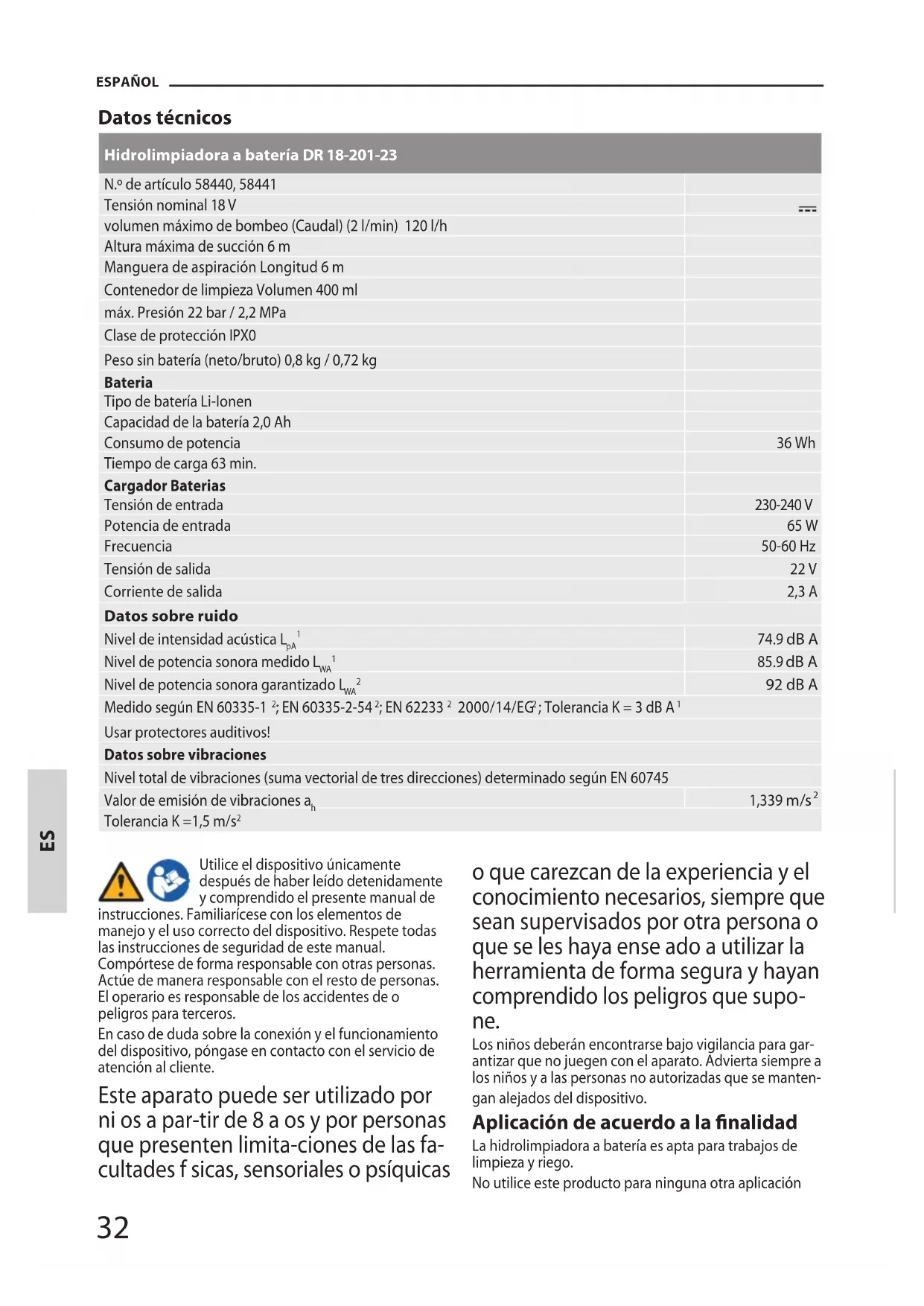 se o atropellarse, ya que existe el riesgo de que se dañe y se produzcan lesiones. El dispositivo no debe funcionar si la manguera de aspiración, las boquillas o la lanza de pulverización están dañadas. No utilizar para limpiar los cristales. Proteja la unidad de las heladas y del funcionamiento en seco. Lleve calzado resistente para protegerse de las descar