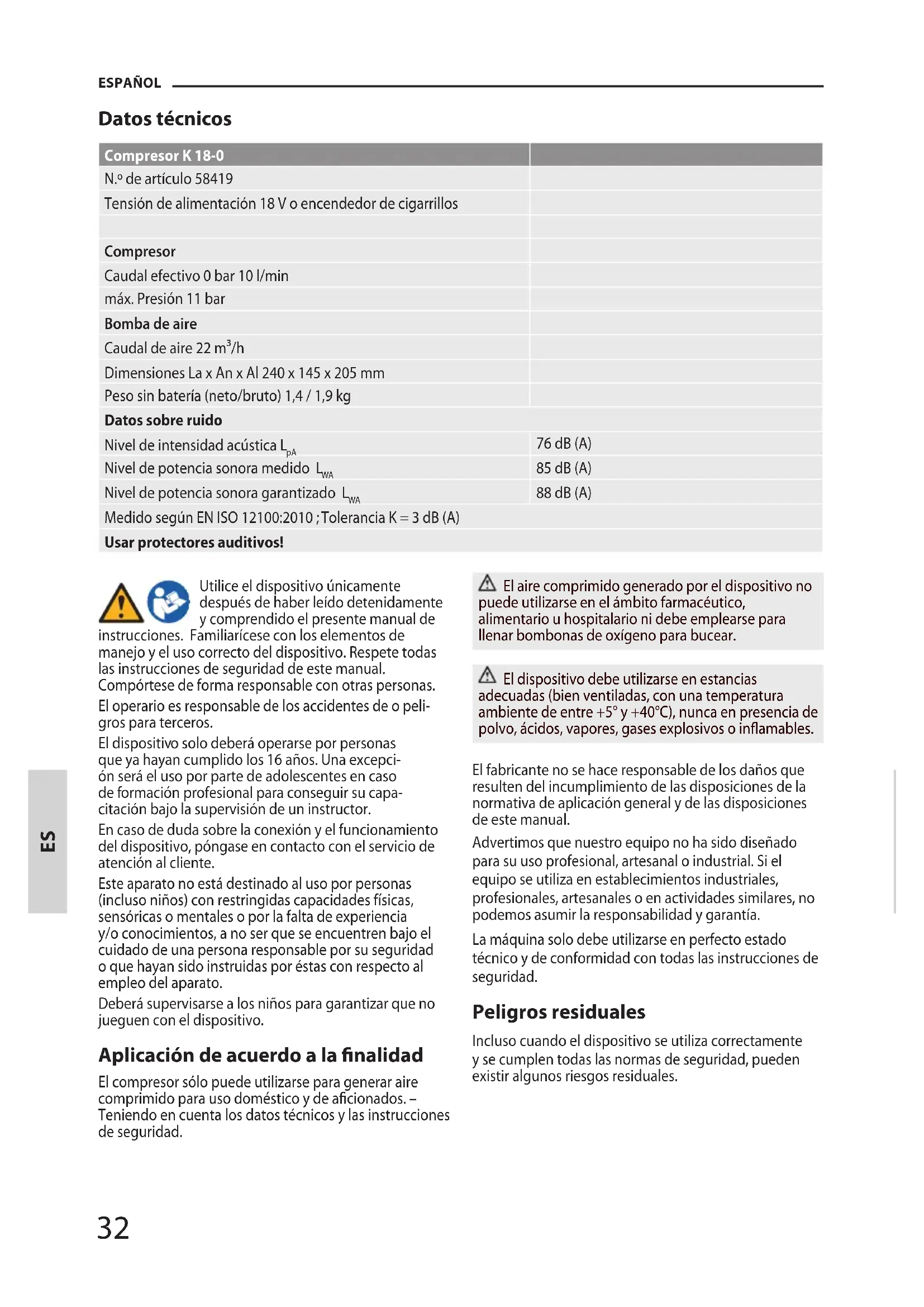 88 dB (A) Medido según EN ISO 12100:2010 ; Tolerancia K = 3 dB (A) Usar protectores auditivos! Utilice el dispositivo únicamente después de haber leído detenidamente y comprendido el presente manual de instrucciones. Familiarícese con los elementos de manejo y el uso correcto del dispositivo. Respete todas las instrucciones de seguridad de este manual. Compórtese de forma responsable con otras personas. El operario es responsable de los accidentes de o peli- gros para terceros. El dispositiv o solo deberá operarse por personas que ya hayan cumplido los 16 años. Una excepci- ón será el uso por parte de adolescentes en caso de f ormación profesional para conseguir su capa- citación bajo la supervisión de un instructor. En caso de duda sobre la conexión y el funcionamiento del dispositivo, póngase en contacto con el servicio de atención al cliente. Este aparato no está destinado al uso por personas (incluso niños) con restringidas capacidades físicas, sensóricas o mentales o por la falta de experiencia y/o conocimientos, a no ser que se encuentren bajo el cuidado de una persona responsable por su seguridad o que hayan sido instruidas por éstas con respecto al empleo del aparato. Deberá supervisarse a los niños para garantizar que no jueguen con el dispositivo. Aplicación de acuerdo a la nalidad El compresor sólo puede utilizarse para generar aire comprimido para uso doméstico y de acionados. – Teniendo en cuenta los datos técnicos y las instrucciones de seguridad. El aire comprimido generado por el dispositivo no puede utilizarse en el ámbito farmacéutico, alimentario u hospitalario ni debe emplearse para llenar bombonas de oxígeno para bucear. El dispositivo debe utilizarse en estancias adecuadas (bien ventiladas, con una temperatura ambiente de entre +5° y +40°C), nunca en presencia de polvo, ácidos, vapores, gases explosivos o inamables. El fabricante no se hace responsable de los daños que resulten del incumplimiento de las disposiciones de la normativa de aplicación general y de las disposiciones de este manual. Advertimos que nuestro equipo no ha sido diseñado para su uso profesional, artesanal o industrial. Si el equipo se utiliza en establecimientos industriales, profesionales, artesanales o en actividades similares, no podemos asumir la responsabilidad y garantía. La máquina solo debe utilizarse en perfecto estado técnico y de conformidad con todas las instrucciones de seguridad. Peligros residuales Incluso cuando el dispositivo se utiliza correctamente y se cumplen todas las normas de seguridad, pueden existir algunos riesgos residuales. ESPAÑOL33