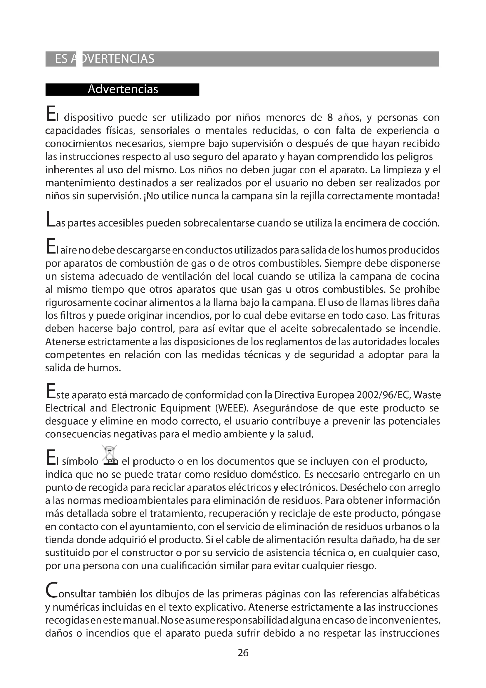 NLONDERHOUD Onderhoud Voor ieder onderhoud eerst de afzuigkap van de stroom loskoppelen. Schoonmaak De kap moet vaak worden schoongemaakt, zowel de binnenkant (behalve de plek achter de vetlter) als de buitenkant. Gebruik voor het reinigen een met of neutraal vloeibaar schoonmaakmiddel vochtig gemaakte doekje. Gebruik geen schuurmiddelen. Attentie: Het niet in acht nemen van de reinigingsnormen van de afzuigkap en van de vervanging en reiniging van de lters kan brandgevaar veroorzaken. Men wordt dan ook verzocht zich aan de instructies te houden. Vetlter deze moet een keer in de maand gereinigd worden met niet agressieve schoonmaakmiddelen, met de hand of in de vaatwasmachine met lage wastemperatuur en een korte wascyclus. Door hem in de vaatwasmachine te wassen kan het metalen vetlter ontkleuren, maar dit is niet van invloed op de eigenschappen, die beslist niet veranderen. Koolstolter (alleen voor de lterversie) De koolstolter F mag niet gewassen of weer gebruikt worden. Het koolstolter moet minstens eenmaal in de 6 maanden worden vervangen. Deze houdt de lastige kookgeuren vast. Beperking van milieuverontreiniging: Om het verbruik van het apparaat te beperken, is het raadzaam om steeds een lagere zuigsnelheid dan vereist in te schakelen, het apparaat na het doven van de branders niet langer dan 15 minuten te laten werken en steeds de lichten uit te schakelen als de kookzone wordt verlaten. Lamp vervanging Attentie! Alvorens de lampjes aan te raken controleer eerst of ze koud zijn. Lamp vervanging Attentie! Alvorens de lampjes aan te raken controleer eerst of ze koud zijn.26 Advertencias ES ADVERTENCIAS El dispositivo puede ser utilizado por niños menores de 8 años, y personas con capacidades físicas, sensoriales o mentales reducidas, o con falta de experiencia o conocimientos necesarios, siempre bajo supervisión o después de que hayan recibido las instrucciones respecto al uso seguro del aparato y hayan comprendido los peligros inherentes al uso del mismo. Los niños no deben jugar con el aparato. La limpieza y el mantenimiento destinados a ser realizados por el usuario no deben ser realizados por niños sin supervisión. ¡No utilice nunca la campana sin la rejilla correctamente montada! Las partes accesibles pueden sobrecalentarse cuando se utiliza la encimera de cocción. El aire no debe descargarse en conductos utilizados para salida de los humos producidos por aparatos de combustión de gas o de otros combustibles. Siempre debe disponerse un sistema adecuado de ventilación del local cuando se utiliza la campana de cocina al mismo tiempo que otros aparatos que usan gas u otros combustibles. Se prohíbe rigurosamente cocinar alimentos a la llama bajo la campana. El uso de llamas libres daña los ltros y puede originar incendios, por lo cual debe evitarse en todo caso. Las frituras deben hacerse bajo control, para así evitar que el aceite sobrecalentado se incendie. Atenerse estrictamente a las disposiciones de los reglamentos de las autoridades locales competentes en relación con las medidas técnicas y de seguridad a adoptar para la salida de humos. Este aparato está marcado de conformidad con la Directiva Europea 2002/96/EC, Waste Electrical and Electronic Equipment (WEEE). Asegurándose de que este producto se desguace y elimine en modo correcto, el usuario contribuye a prevenir las potenciales consecuencias negativas para el medio ambiente y la salud. El símbolo en el producto o en los documentos que se incluyen con el producto, indica que no se puede tratar como residuo doméstico. Es necesario entregarlo en un punto de recogida para reciclar aparatos eléctricos y electrónicos. Deséchelo con arreglo a las normas medioambientales para eliminación de residuos. Para obtener información más detallada sobre el tratamiento, recuperación y reciclaje de este producto, póngase en contacto con el ayuntamiento, con el servicio de eliminación de residuos urbanos o la tienda donde adquirió el producto. Si el cable de alimentación resulta dañado, ha de ser sustituido por el constructor o por su servicio de asistencia técnica o, en cualquier caso, por una persona con una cualicación similar para evitar cualquier riesgo. Consultar también los dibujos de las primeras páginas con las referencias alfabéticas y numéricas incluidas en el texto explicativo. Atenerse estrictamente a las instrucciones recogidas en este manual. No se asume responsabilidad alguna en caso de inconvenientes, daños o incendios que el aparato pueda sufrir debido a no respetar las instruccionesESADVERTENCIAS recogidas en este manual. La instalación y la conexión eléctrica deberán ser realizadas por un técnico especializado. Asegúrese de que la pared donde se ja la campana pueda sostener perfectamente su peso y evite instalarla en paredes no sucientemente robustas (de cartón-yeso, por ejemplo). La campana tiene que tener una distancia mínima de los fuegos de 60 cm en las cocinas eléctricas y de 60 cm en las cocinas a gas o mixtas. Si las instrucciones para la instalación del dispositivo para cocinar con gas especican una distancia mayor, hay que tenerlo en consideración. La campana està equipada por una salida de aire superior B para la descarga de los humos hacia el exterior ( Versiòn aspirante A – tubo de descarga no proporcionado). En el caso de que no sea posible descargar los humos y los vapores de la cocciòn hacia el exterior se puede utilizar la campana en versiòn ltrante F montando 1 ltro a carbones activos F, los humos y vapores vienen reciclados a través de la rejilla superior G . Asegúrese de que en las inmediaciones de la campana haya un punto de acceso a la red de alimentación eléctrica, y de que la instalación esté dotada de un diferencial de 30 mA La tensión de red debe corresponder a la tensión indicada en la etiqueta de características situada dentro de la campana. La campana lleva un cable eléctrico de 1250 mm de longitud, con o sin clavija. Si lleva c