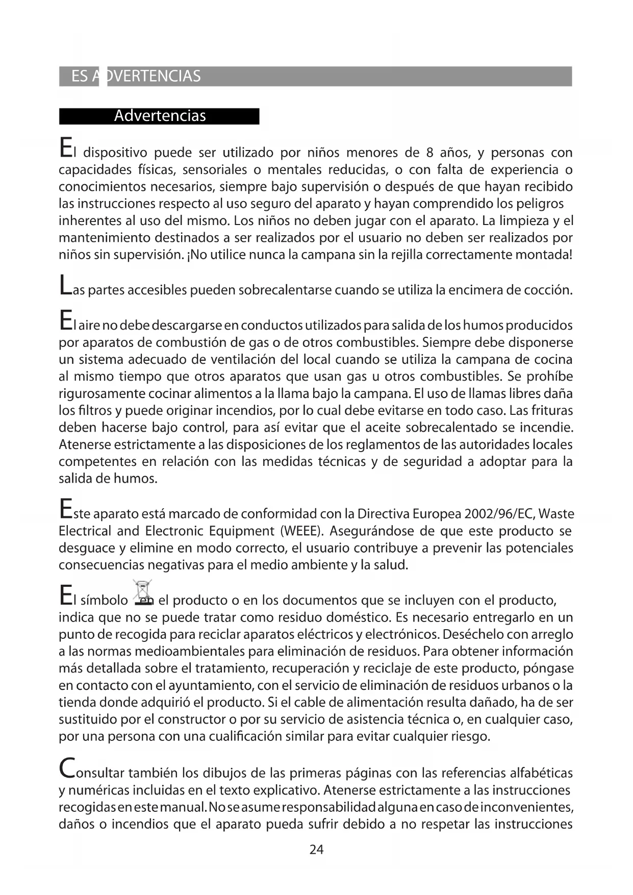 2 3 i23 NLONDERHOUD Onderhoud Voor ieder onderhoud eerst de afzuigkap van de stroom loskoppelen. Schoonmaak De kap moet vaak worden schoongemaakt, zowel de binnenkant (behalve de plek achter de vetlter) als de buitenkant. Gebruik voor het reinigen een met spiritus of neutraal vloeibaar schoonmaakmiddel vochtig gemaakte doekje. Gebruik geen schuurmiddelen. Attentie: Het niet in acht nemen van de reinigingsnormen van de afzuigkap en van de vervanging en reiniging van de lters kan brandgevaar veroorzaken. Men wordt dan ook verzocht zich aan de instructies te houden. Vetlter deze moet een keer in de maand gereinigd worden met niet agressieve schoonmaakmiddelen, met de hand of in de vaatwasmachine met lage wastemperatuur en een korte wascyclus. Door hem in de vaatwasmachine te wassen kan het metalen vetlter ontkleuren, maar dit is niet van invloed op de eigenschappen, die beslist niet veranderen. Koolstolter (alleen voor de lterversie) De koolstolter F mag niet gewassen of weer gebruikt worden. Het koolstolter moet minstens eenmaal in de 6 maanden worden vervangen. Deze houdt de lastige kookgeuren vast. Lamp vervanging Attentie! Alvorens de lampjes aan te raken controleer eerst of ze koud zijn. LED LAMPEN Indien de led verlichtingsgroep niet functioneert, dient men contact op te nemen met het technische servicecentrum om de gehele groep te laten vervangen. Beperking van milieuverontreiniging: Om het verbruik van het apparaat te beperken, is het raadzaam om steeds een lagere zuigsnelheid dan vereist in te schakelen, het apparaat na het doven van de branders niet langer dan 15 minuten te laten werken en steeds de lichten uit te schakelen als de kookzone wordt verlaten.24 Advertencias ES ADVERTENCIAS El dispositivo puede ser utilizado por niños menores de 8 años, y personas con capacidades físicas, sensoriales o mentales reducidas, o con falta de experiencia o conocimientos necesarios, siempre bajo supervisión o después de que hayan recibido las instrucciones respecto al uso seguro del aparato y hayan comprendido los peligros inherentes al uso del mismo. Los niños no deben jugar con el aparato. La limpieza y el mantenimiento destinados a ser realizados por el usuario no deben ser realizados por niños sin supervisión. ¡No utilice nunca la campana sin la rejilla correctamente montada! Las partes accesibles pueden sobrecalentarse cuando se utiliza la encimera de cocción. El aire no debe descargarse en conductos utilizados para salida de los humos producidos por aparatos de combustión de gas o de otros combustibles. Siempre debe disponerse un sistema adecuado de ventilación del local cuando se utiliza la campana de cocina al mismo tiempo que otros aparatos que usan gas u otros combustibles. Se prohíbe rigurosamente cocinar alimentos a la llama bajo la campana. El uso de llamas libres daña los ltros y puede originar incendios, por lo cual debe evitarse en todo caso. Las frituras deben hacerse bajo control, para así evitar que el aceite sobrecalentado se incendie. Atenerse estrictamente a las disposiciones de los reglamentos de las autoridades locales competentes en relación con las medidas técnicas y de seguridad a adoptar para la salida de humos. Este aparato está marcado de conformidad con la Directiva Europea 2002/96/EC, Waste Electrical and Electronic Equipment (WEEE). Asegurándose de que este producto se desguace y elimine en modo correcto, el usuario contribuye a prevenir las potenciales consecuencias negativas para el medio ambiente y la salud. El símbolo en el producto o en los documentos que se incluyen con el producto, indica que no se puede tratar como residuo doméstico. Es necesario entregarlo en un punto de recogida para reciclar aparatos eléctricos y electrónicos. Deséchelo con arreglo a las normas medioambientales para eliminación de residuos. Para obtener información más detallada sobre el tratamiento, recuperación y reciclaje de este producto, póngase en contacto con el ayuntamiento, con el servicio de eliminación de residuos urbanos o la tienda donde adquirió el producto. Si el cable de alimentación resulta dañado, ha de ser sustituido por el constructor o por su servicio de asistencia técnica o, en cualquier caso, por una persona con una cualicación similar para evitar cualquier riesgo. Consultar también los dibujos de las primeras páginas con las referencias alfabéticas y numéricas incluidas en el texto explicativo. Atenerse estrictamente a las instrucciones recogidas en este manual. No se asume responsabilidad alguna en caso de inconvenientes, daños o incendios que el aparato pueda sufrir debido a no respetar las instrucciones25 ESADVERTENCIAS recogidas en este manual. La instalación y la conexión eléctrica deberán ser realizadas por un técnico especializado. Asegúrese de que la pared donde se ja la campana pueda sostener perfectamente su peso y evite instalarla en paredes no sucientemente robustas (de cartón-yeso, por ejemplo). La campana tiene que tener una distancia mínima de los fuegos de 65 cm en las cocinas eléctricas y de 65 cm en las cocinas a gas o mixtas. Si las instrucciones para la instalación del dispositivo para cocinar con gas especican una distancia mayor, hay que tenerlo en consideración. La campana està equipada por una salida de aire superior B para la descarga de los humos hacia el exterior ( Versiòn aspirante A – tubo de descarga no proporcionado). En el caso de que no sea posible descargar los humos y los vapores de la cocciòn hacia el exterior se puede utilizar la campana en versiòn ltrante F montando 1 ltro a carbones activos F, los humos y vapores vienen reciclados a través de la rejilla superior G . Asegúrese de que en las inmediaciones de la campana haya un punto de acceso a la red de alimentación eléctrica, y de que la instalación esté dotada de un diferencial de 30 mA La tensión de red debe corresponder a la tensión indicada en la etiqueta de características situada dentro de la campana