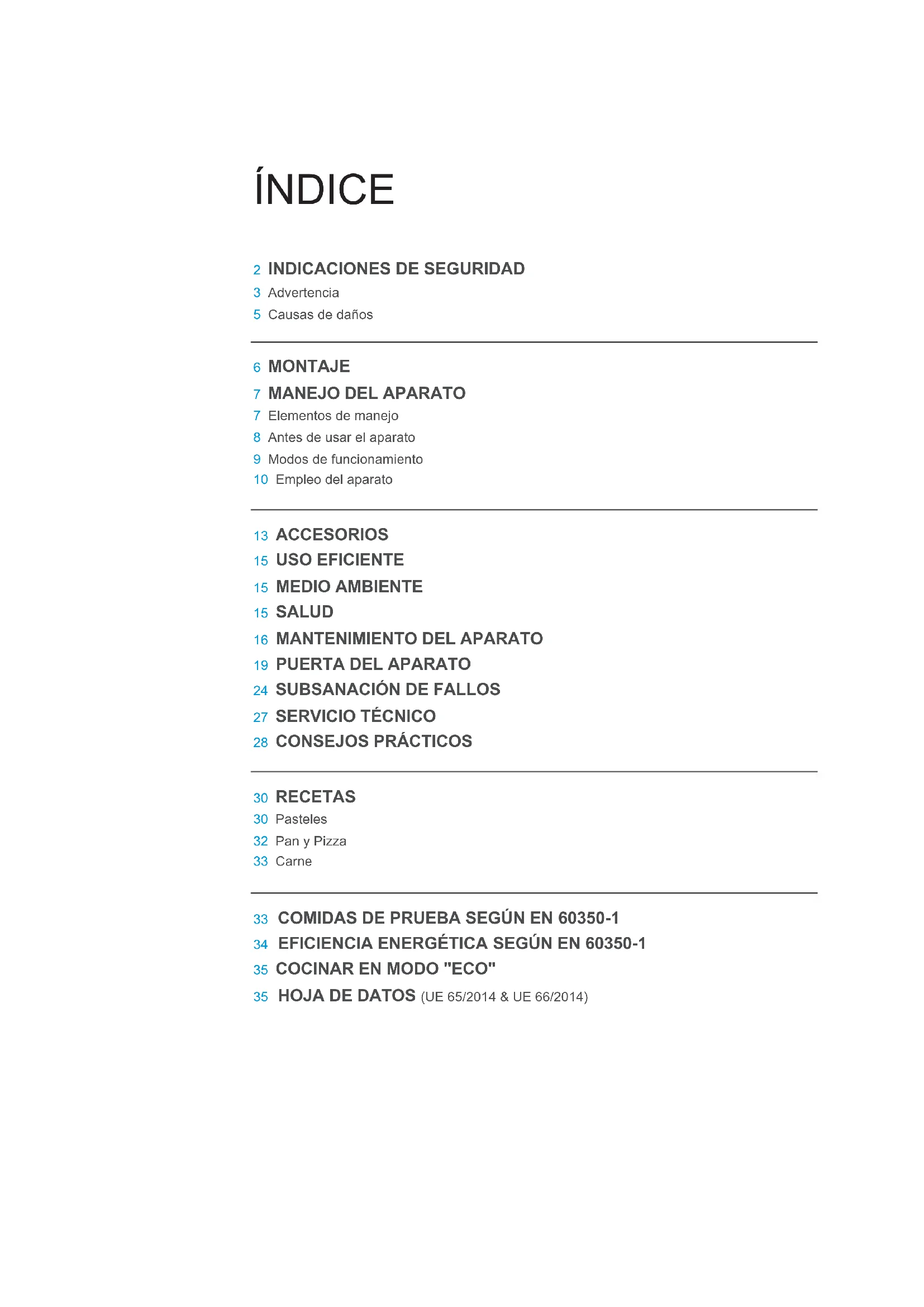 35 HOJA DE DATOS (UE 65/2014 & UE 66/2014)INDICACIONES DE SEGURIDAD Muchas gracias por la adquisición de este horno de cocina Blaupunkt. Antes de desembalar su nuevo aparato, lea atentamente estas instrucciones. Solo así podrá manejar el aparato de forma segura y correcta. Conserve, por favor, el manual de servicio y montaje para futuras consultas u otros propietarios.