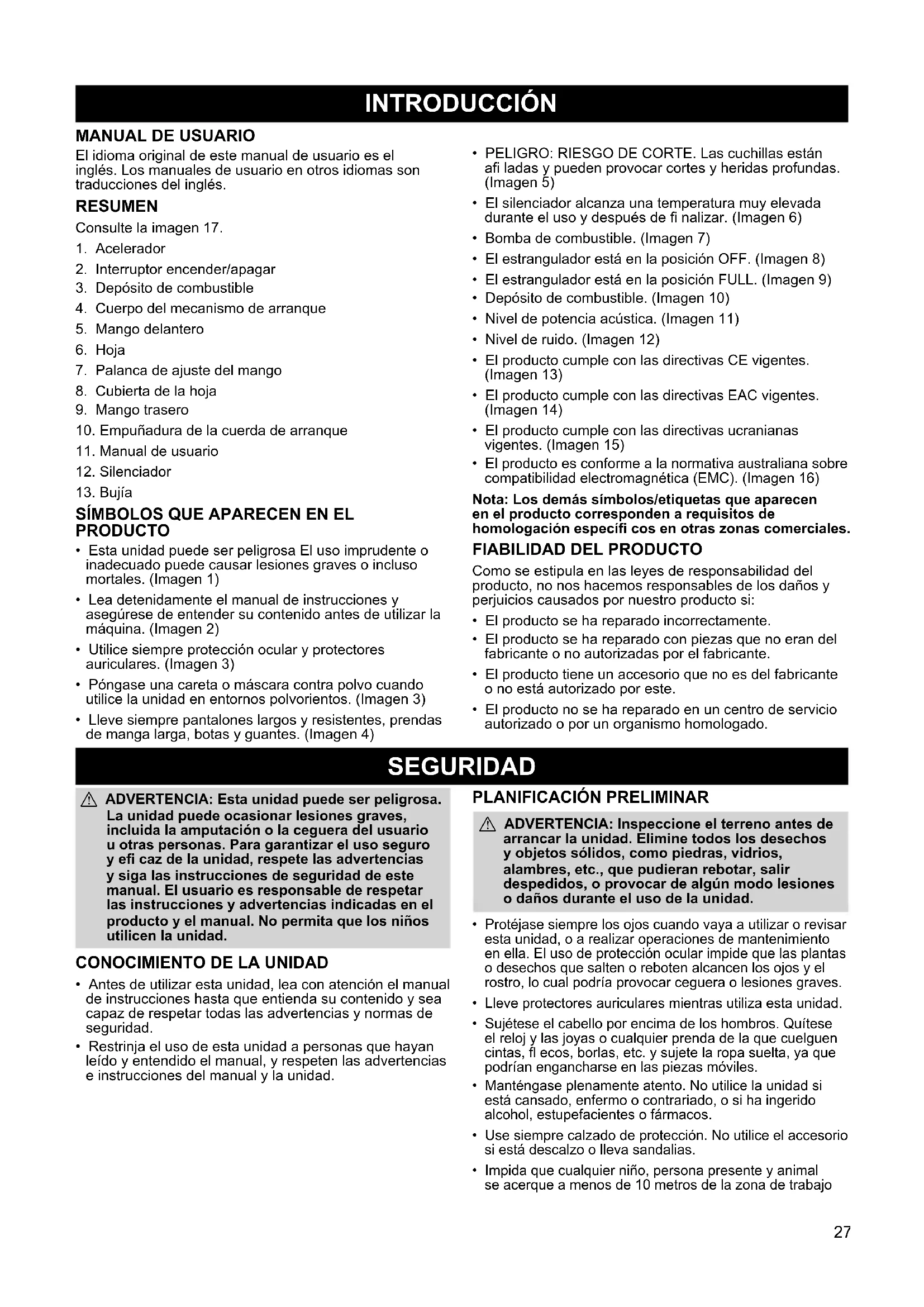 - Guarde la unidad en un lugar seco y fuera del alcance de los niños. AVISO DE SEGURIDAD: La exposición a vibraciones derivada del uso prolongado de herramientas manuales que funcionan con gasolina puede ocasionar daños en los vasos sanguíneos o los nervios de dedos, manos y articulaciones de personas propensas a sufrir problemas de circulación o hinchazón anormal. En climas fríos, el uso prolongado de estas herramientas se ha asociado con daño de los vasos sanguíneos en personas sanas. Cuando se presenten síntomas como visión enturbiada, dolor, pérdida de fuerza, cambio del color o la textura de los dedos o pérdida de sensibilidad en los dedos, las manos o las articulaciones, deje de utilizar esta herramienta y consulte a un médico. El empleo del sistema antivibración no garantiza que no vayan a presentarse estos síntomas. Los usuarios que utilicen herramientas mecánicas de forma continua y regular tendrán que vigilar su salud física y el estado de la herramienta. MONTAJE a ADVERTENCIA: Si la unidad se suministra ya montada, repita todo el procedimiento para cerciorarse de que el montaje es correcto y que todos los cierres están afi anzados. Siga todas las instrucciones de seguridad del manual y en la unidad.