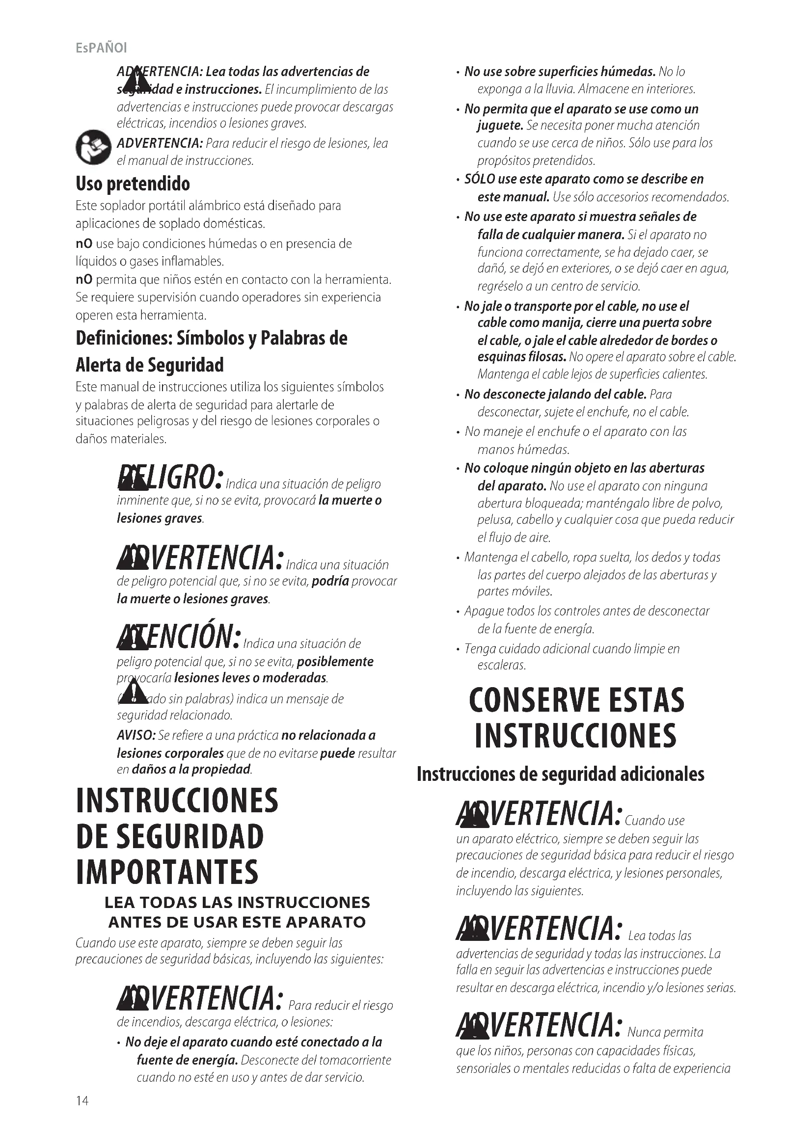 ADVERTENCIA: Lea todas las advertencias de seguridad e instrucciones. El incumplimiento de las advertencias e instrucciones puede provocar descargas eléctricas, incendios o lesionesgraves. ADVERTENCIA: Para reducir el riesgo de lesiones, lea el manual deinstrucciones.ESPAÑOL