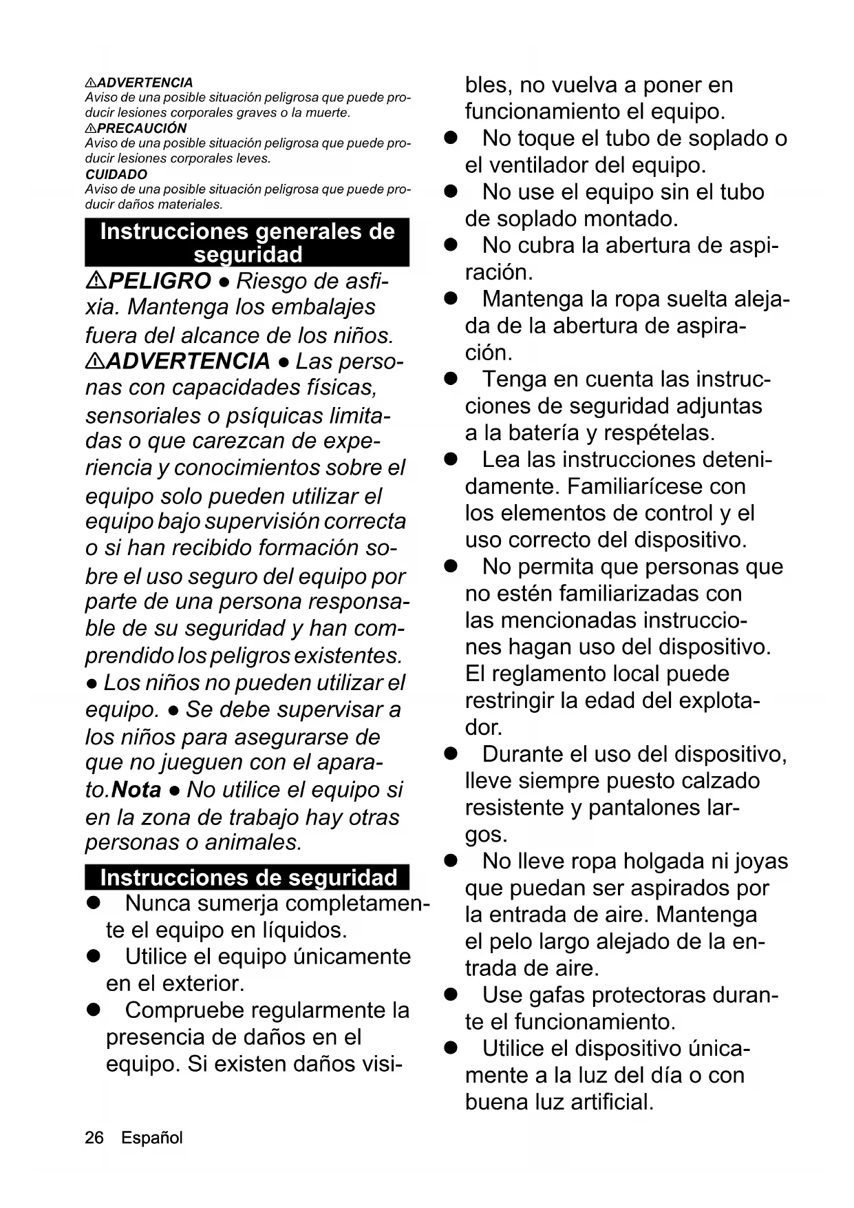- Declaración de conformidad CE Español 몇 ADVERTENCIA Aviso de una posible situación peligrosa que puede pro- ducir lesiones corporales graves o la muerte. 몇 PRECAUCIÓN Aviso de una posible situación peligrosa que puede pro- ducir lesiones corporales leves. CUIDADO Aviso de una posible situación peligrosa que puede pro- ducir daños materiales. Instrucciones generales de seguridad PELIGRO ● Riesgo de asfi- xia. Mantenga los embalajes fuera del alcance de los niños. 몇 ADVERTENCIA ● Las perso- nas con capacidades físicas, sensoriales o psíquicas limita- das o que carezcan de expe- riencia y conocimientos sobre el equipo solo pueden utilizar el equipo bajo supervisión correcta o si han recibido formación so- bre el uso seguro del equipo por parte de una persona responsa- ble de su seguridad y han com- prendido los peligros existentes. ● Los niños no pueden utilizar el equipo. ● Se debe supervisar a los niños para asegurarse de que no jueguen con el apara- to.Nota ● No utilice el equipo si en la zona de trabajo hay otras personas o animales. Instrucciones de seguridad Nunca sumerja completamen- te el equipo en líquidos. Utilice el equipo únicamente en el exterior. Compruebe regularmente la presencia de daños en el equipo. Si existen daños visi- bles, no vuelva a poner en funcionamiento el equipo. No toque el tubo de soplado o el ventilador del equipo. No use el equipo sin el tubo de soplado montado. No cubra la abertura de aspi- ración. Mantenga la ropa suelta aleja- da de la abertura de aspira- ción. Tenga en cuenta las instruc- ciones de seguridad adjuntas a la batería y respételas. Lea las instrucciones deteni- damente. Familiarícese con los elementos de control y el uso correcto del dispositivo. No permita que personas que no estén familiarizadas con las mencionadas instruccio- nes hagan uso del dispositivo. El reglamento local puede restringir la edad del explota- dor. Durante el uso del dispositivo, lleve siempre puesto calzado resistente y pantalones lar- gos. No lleve ropa holgada ni joyas que puedan ser aspirados por la entrada de aire. Mantenga el pelo largo alejado de la en- trada de aire. Use gafas protectoras duran- te el funcionamiento. Utilice el dispositivo única- mente a la luz del día o con buena luz artificial.Español 27 No se sobrecargue y manten- ga siempre el equilibrio. Asegúrese siempre en pen- dientes de que tiene un punto de apoyo. Camine mientras tenga el dis- positivo, no corra. Mantenga todas las entradas de aire de refrigeración libres de suciedad. No sople nunca la suciedad en dirección a otras personas. Apriete las tuercas, los pernos y los tornillos para asegurar que el dispositivo está en un estado de servicio seguro. Sustituya las piezas que estén desgastadas o dañadas. Use exclusivamente acceso- rios y recambios originales. Uso previsto 몇 ADVERTENCIA Peligro de lesiones por partículas que salen despe- didas Utilice únicamente la manguera de soplado con tubo si no supone un peligro para las personas presentes. El equipo está diseñado para soplar hojas situadas en el suelo, cortar el césped, podar arbustos y para sucie- dad suelta. Utilice el equipo únicamente para uso doméstico. Usos erróneos previsibles No se permite ningún uso no previsto. El operario será responsable de los daños producidos por un uso no previsto. Protección del medioambiente Los materiales del embalaje son reciclables. Eli- mine los embalajes de forma respetuosa con el medioambiente. Los equipos eléctricos y electrónicos contienen materiales reciclables y, a menudo, componen- tes, como baterías, acumuladores o aceite, que suponen un riesgo potencial para la salud de las personas o el medioambiente en caso de manipularse o eliminarse de forma inadecuada. Sin embargo, dichos componentes son necesarios para un servicio adecua- do del equipo. Los equipos identificados con este sím- bolo no pueden eliminarse con la basura doméstica. Avisos sobre sustancias contenidas (REACH) Encontrará información actual sobre las sustancias contenidas en: www.kaercher.com/REACH Símbolos en el equipo Manguera de soplado con tubo LBL 2/LBL 4 Accesorios y recambios Utilice únicamente accesorios y recambios originales, estos garantizan un servicio seguro y fiable del equipo. Encontrará información sobre los accesorios y recam- bios en www.kaercher.com. Volumen de suministro El volumen de suministro del equipo de muestra en el embalaje. Compruebe la integridad del volumen de su- ministro durante el desembalaje. Póngase en contacto con su distribuidor si faltan accesorios o en caso de da- ños de transporte. Descripción del equipo Figura A 1 Boquilla plana con bordes rayados2 Parte inferior del tubo de soplado3 Parte superior del tubo de soplado4 Salida de aire5 Interruptor del equipo 18 V: On/Off 36 V: Off, nivel 1, nivel 2 6 Tecla de desbloqueo de la batería7 Placa de características8 Alojamiento para la batería Battery Power (+)9 Abertura de aspiración10 *Batería Battery Power 36/2511 *Cargador rápido Battery Power 36 V12 *Cargador estándar Battery Power 18 V13 *Batería Battery Power 18/25 *Incluido en el alcance del suministro de las variantes del juego. Aviso sobre objetos que salen volando. Mantenga al resto de personas lejos de la zona de trabajo. Utilice protección para los oídos ade- cuada y unas gafas de protección du- rante el uso del equipo. Proteja el equipo de la lluvia y de salpi- caduras de agua.28 Español Montaje del tubo de soplado p. 2926
