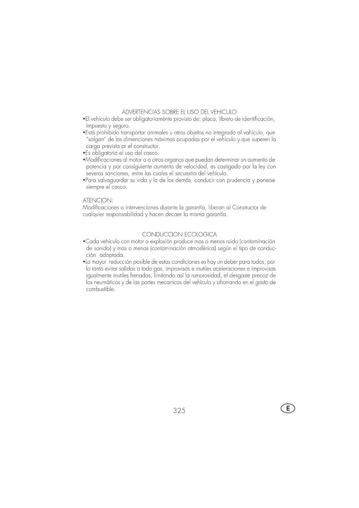 - Para salvaguardar su vida y la de los demás, conducir con prudencia y ponerse siempre el casco. ATENCION: Modificaciones o intervenciones durante la garantía, liberan al Constructor de cualquier responsabilidad y hacen decaer la misma garantía. CONDUCCION ECOLOGICA