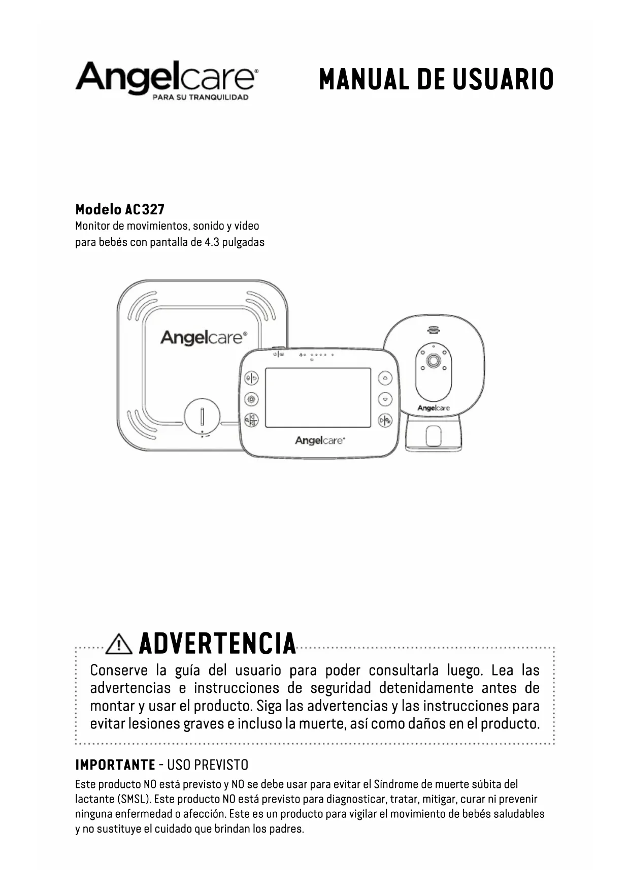 SIM327-NA-25012021 Información de contacto ¡IMPORTANTE! El monitor de bebés Angelcare® es un producto de cuidado personal. No devuelva el producto a la tienda. Si tiene preguntas o necesita ayuda, comuníquese con su distribuidor antes de devolver el producto. En Angelcare®, avalamos todos nuestros productos. Si no está completamente satisfecho o tiene alguna pregunta, comuníquese con su distribuidor antes de devolver el producto: Estados Unidos y Canadá: Comuníquese con nosotros en info@angelcarebaby.com Otros países: Encuentre su distribuidor local en nuestro sitio web: angelcarebaby.com/distributors Para registrar su producto, visite nuestro registro en línea en : www.angelcarebaby.com Usaremos la información proporcionada para contactarlo si hay una alerta de seguridad o un retiro del mercado para este producto.