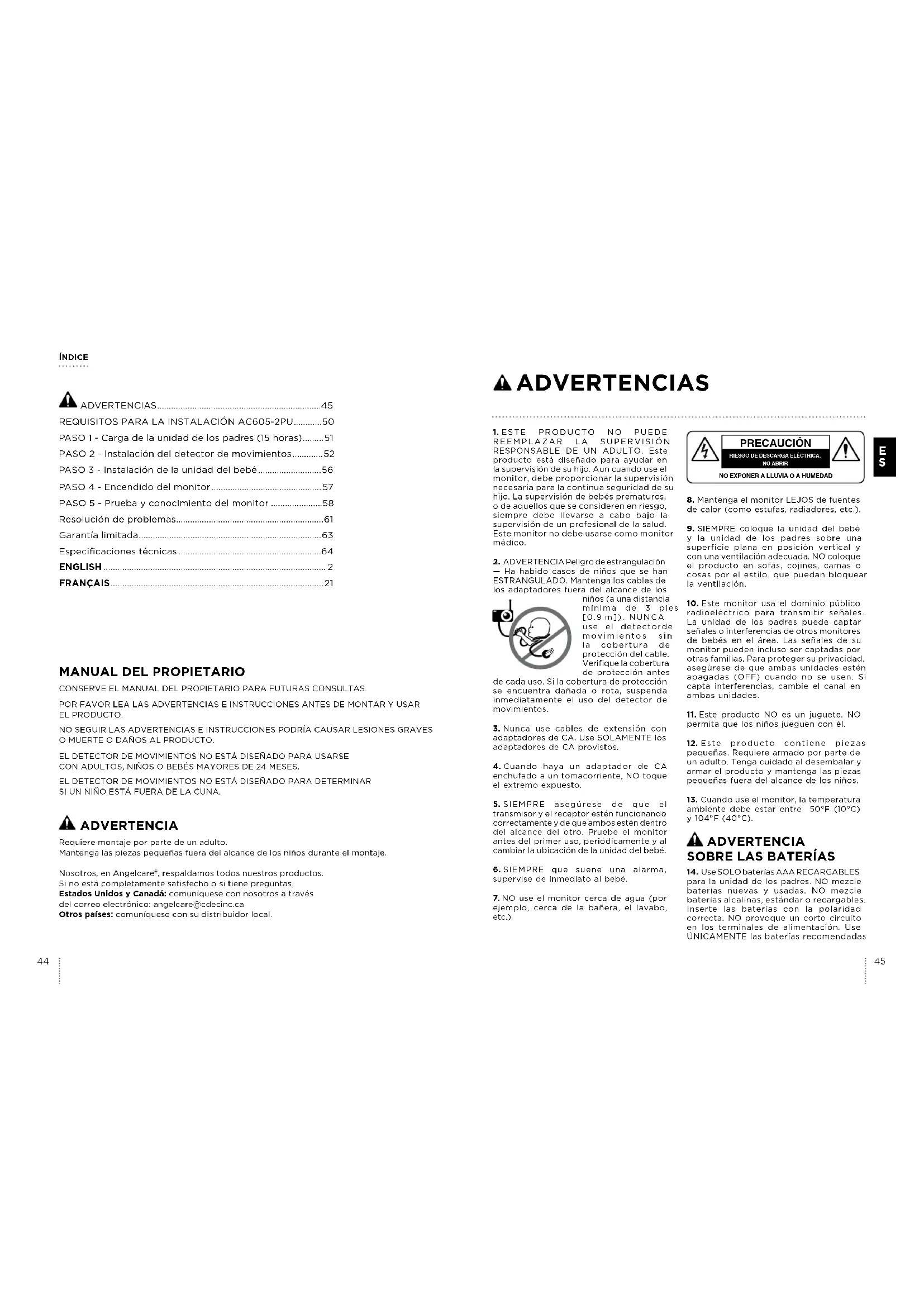 CONSERVE EL MANUAL DEL PROPIETARIO PARA FUTURAS CONSULTAS.POR FAVOR LEA LAS ADVERTENCIAS E INSTRUCCIONES ANTES DE MONTAR Y USAR EL PRODUCTO.NO SEGUIR LAS ADVERTENCIAS E INSTRUCCIONES PODRÍA CAUSAR LESIONES GRAVES O MUERTE O DAÑOS AL PRODUCTO.EL DETECTOR DE MOVIMIENTOS NO ESTÁ DISEÑADO PARA USARSE CON ADULTOS, NIÑOS O BEBÉS MAYORES DE 24 MESES.EL DETECTOR DE MOVIMIENTOS NO ESTÁ DISEÑADO PARA DETERMINAR SI UN NIÑO ESTÁ FUERA DE LA CUNA. ADVERTENCIA Requiere montaje por parte de un adulto.Mantenga las piezas pequeñas fuera del alcance de los niños durante el montaje.Nosotros, en Angelcare , respaldamos todos nuestros productos.Si no está completamente satisfecho o si tiene preguntas, Estados Unidos y Canadá: comuníquese con nosotros a través del correo electrónico: angelcare@cdecinc.caOtros países: comuníquese con su distribuidor local.1. ESTE PRODUCTO NO PUEDE REEMPLAZAR LA SUPERVISIÓN RESPONSABLE DE UN ADULTO. Este producto está diseñado para ayudar en la supervisión de su hijo. Aun cuando use el monitor, debe proporcionar la supervisión necesaria para la continua seguridad de su hijo. La supervisión de bebés prematuros, o de aquellos que se consideren en riesgo, siempre debe llevarse a cabo bajo la supervisión de un profesional de la salud. Este monitor no debe usarse como monitor médico.2. ADVERTENCIA Peligro de estrangulación — Ha habido casos de niños que se han ESTRANGULADO. Mantenga los cables de los adaptadores fuera del alcance de los niños (a una distancia mínima de 3 pies [0.9 m]). NUNCA use el detectorde movimientos sin la cobertura de protección del cable. Verifique la cobertura de protección antes de cada uso. Si la cobertura de protección se encuentra dañada o rota, suspenda inmediatamente el uso del detector de movimientos.3. Nunca use cables de extensión con adaptadores de CA. Use SOLAMENTE los adaptadores de CA provistos.4. Cuando haya un adaptador de CA enchufado a un tomacorriente, NO toque el extremo expuesto.5. SIEMPRE asegúrese de que el transmisor y el receptor estén funcionando correctamente y de que ambos estén dentro del alcance del otro. Pruebe el monitor antes del primer uso, periódicamente y al cambiar la ubicación de la unidad del bebé.6. SIEMPRE que suene una alarma, supervise de inmediato al bebé.7. NO use el monitor cerca de agua (por ejemplo, cerca de la bañera, el lavabo, etc.). PRECAUCIÓN RIESGO DE DESCARGA ELÉCTRICA. NO ABRIRNO EXPONER A LLUVIA O A HUMEDAD8. Mantenga el monitor LEJOS de fuentes de calor (como estufas, radiadores, etc.).9. SIEMPRE coloque la unidad del bebé y la unidad de los padres sobre una superficie plana en posición vertical y con una ventilación adecuada. NO coloque el producto en sofás, cojines, camas o cosas por el estilo, que puedan bloquear la ventilación.10. Este monitor usa el dominio público radioeléctrico para transmitir señales. La unidad de los padres puede captar señales o interferencias de otros monitores de bebés en el área. Las señales de su monitor pueden incluso ser captadas por otras familias. Para proteger su privacidad, asegúrese de que ambas unidades estén apagadas (OFF) cuando no se usen. Si capta interferencias, cambie el canal en ambas unidades.11. Este producto NO es un juguete. NO permita que los niños jueguen con él.12. Este producto contiene piezas pequeñas. Requiere armado por parte de un adulto. Tenga cuidado al desembalar y armar el producto y mantenga las piezas pequeñas fuera del alcance de los niños.13. Cuando use el monitor, la temperatura ambiente debe estar entre 50°F (10°C) y 104°F (40°C). ADVERTENCIA