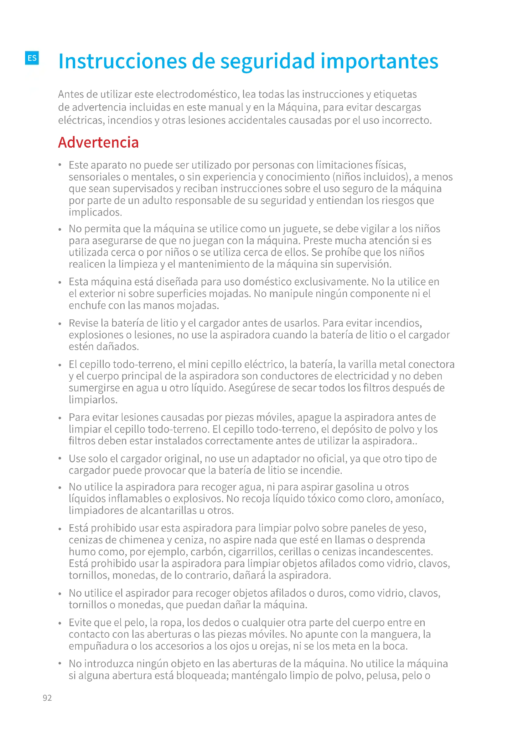 No utilice la aspiradora para recoger agua, ni para aspirar gasolina u otros líquidos inflamables o explosivos. No recoja líquido tóxico como cloro, amoníaco, limpiadores de alcantarillas u otros.
