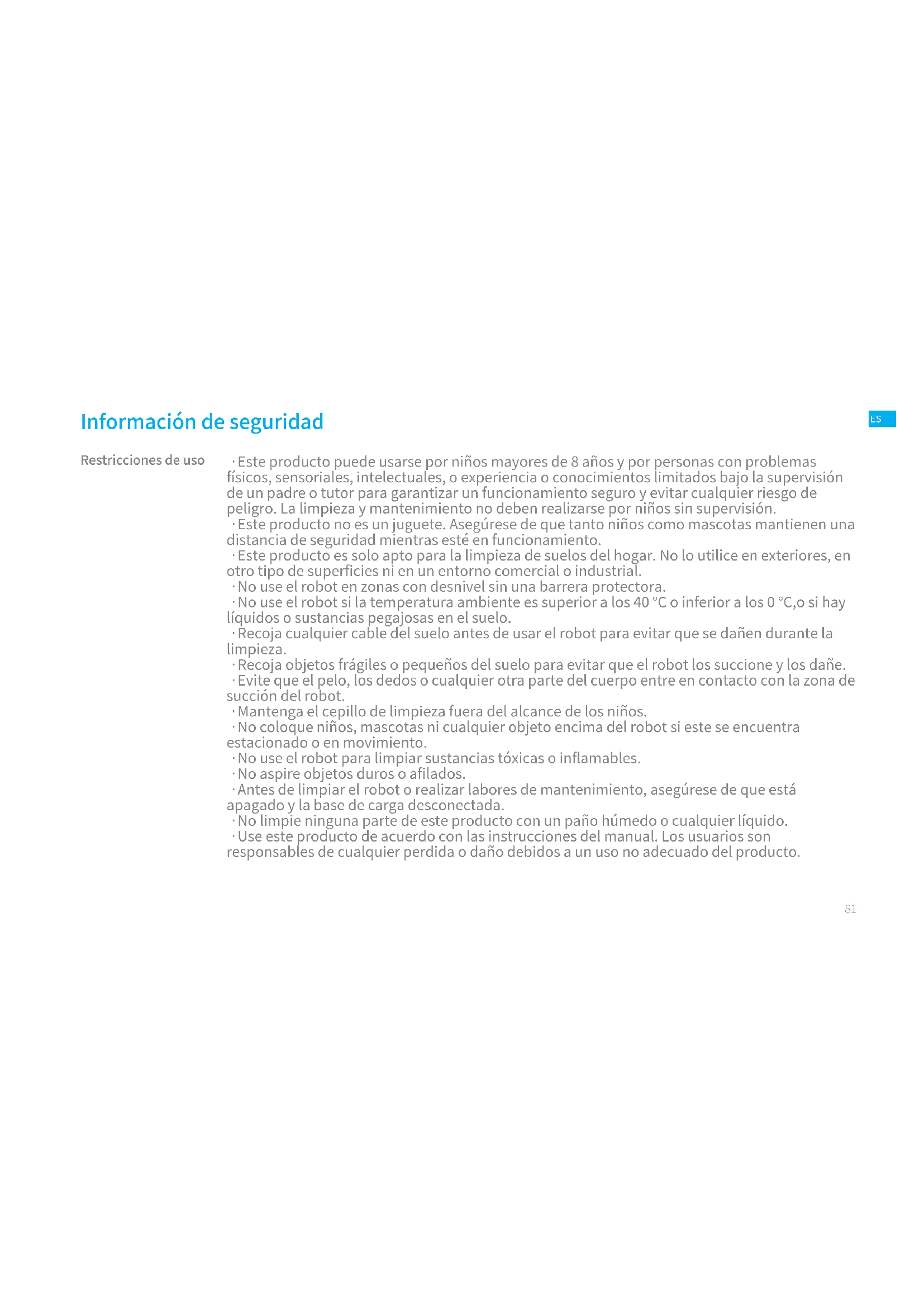 - Este producto es solo apto para la limpieza de suelos del hogar. No lo utilice en exteriores, en otro tipo de superficies ni en un entorno comercial o industrial.