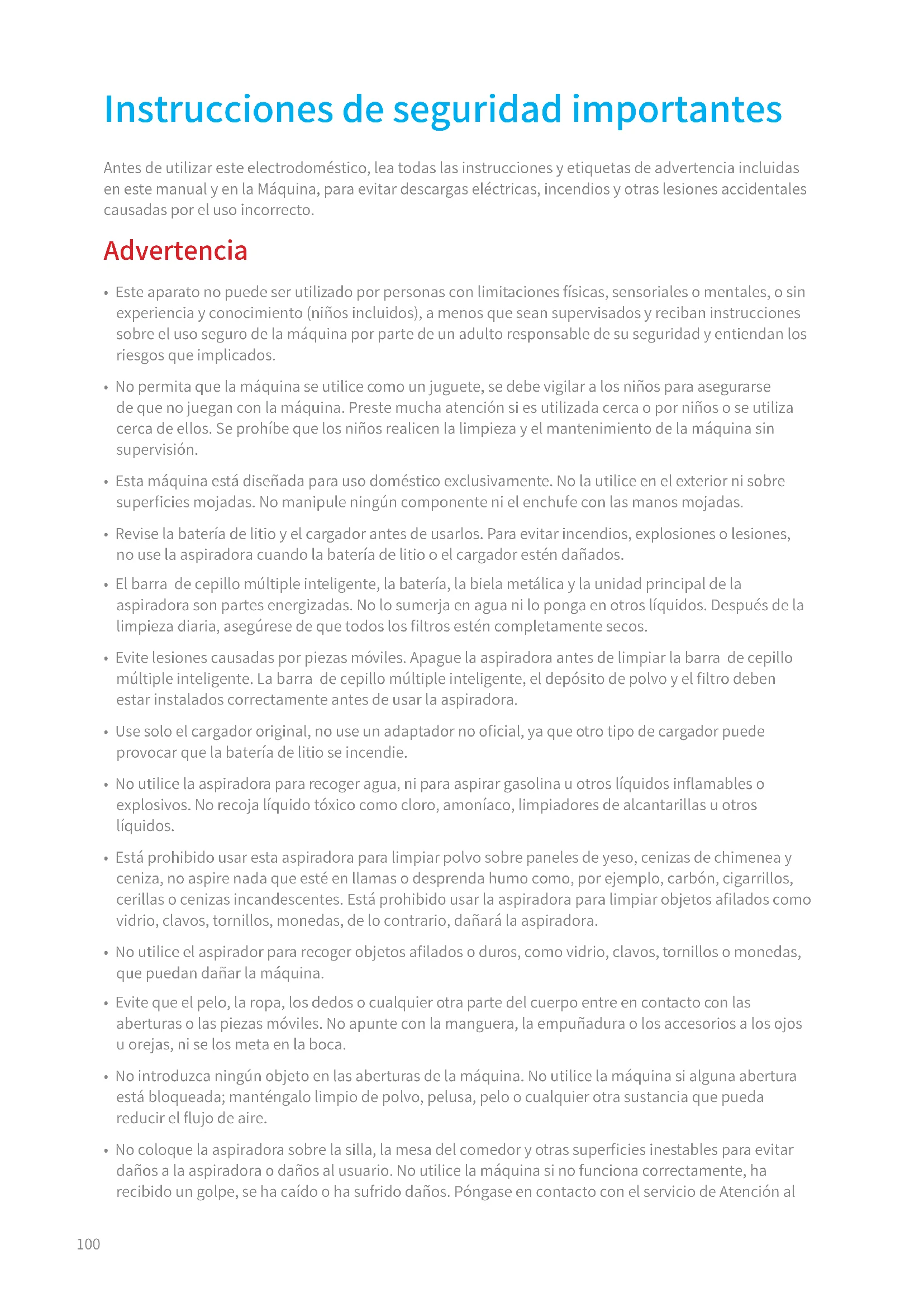Preguntas frecuentes Si el aspirador no funciona correctamente, consulte la siguiente tabla de posibles soluciones. Averías comunes Posible causa Solución La aspiradora no funciona. No tiene batería o le queda poca. Cargue completamente la aspiradora y reanude el uso. Activa el modo de protección contra sobrecalentamiento debido a una obstrucción. Espere hasta que el aspirador se enfríe, luego reactívelo. La abertura de succión o el conducto de aire está bloqueado. Limpie cualquier obstrucción de la abertura de succión o del conducto de aire. La potencia de succión disminuye. El compartimento de polvo está lleno y/o el filtro está obstruido. Vacíe el depósito del polvo y limpie el conjunto del filtro. El accesorio ensamblado está bloqueada. Despeje cualquier bloqueo en el accesorio ensamblado. El motor hace un ruido raro. La abertura de succión principal o la varilla extensible está bloqueada. Limpie cualquier obstrucción en la abertura de succión principal o en la Varilla extensible. El primer indicador aparece rojo después de encender la aspiradora. El pack de batería está dañado. Póngase en contacto con el servicio posventa para concertar una cita de mantenimiento. El primer indicador parpadea en rojo al cargar la aspiradora. El cargador no es compatible. Utilice únicamente el cargador original para cargar la aspiradora.123 Preguntas frecuentes La batería se carga lentamente. La temperatura de la batería es demasiado alta o baja. Espere a que la temperatura de la batería se normalice y reanude el uso. El indicador de batería no se enciende durante la carga. El cargador no está conectado a la aspiradora. Asegúrese de que el cargador esté bien conectado. La batería está totalmente cargada y cambió al modo de suspensión. Puede utilizar la aspiradora como de costumbre. Si el problema persiste después de descartar las dos posibilidades anteriores. Póngase en contacto con el servicio posventa para obtener ayuda. Averías comunes Posible causa Solución El pack de batería de ion de litio contiene sustancias perjudiciales para el medio ambiente. Antes de desechar la aspiradora, quite el pack de batería y deséchelo o recíclelo siguiendo las leyes y reglamentos locales del país o región en el que se use.124 Indicación de fallo Si la aspiradora no funciona con normalidad, en la pantalla aparecerá un mensaje de error. Consulte la tabla siguiente para encontrar la solución al problema en función del mensaje de error. Icono del error Mensaje del error Soluciones Sobrecalentamiento de la batería Espere a que la temperatura de la batería se normalice antes de reanudar el uso. Error Póngase en contacto con el servicio posventa para concertar una cita de mantenimiento. El rodillo está atascado Consulte "Limpieza de la barra-cepillo multifunción inteligente" en la sección de Cuidado y mantenimiento para ver las instrucciones de cómo limpiar de pelo y otros desechos el rodillo. Conducto de aire bloqueado Compruebe si el filtro cartucho, Varilla extensible y la barra-cepillo multifunción inteligente están bloqueadas. Todos los productos que llevan este símbolo son residuos de aparatos eléctricos y electrónicos (RAEE según la directiva 2012/19/UE) que no deben mezclarse con residuos domésticos sin clasicar. En su lugar, debe proteger la salud humana y el medio ambiente entregando sus equipos de desecho a un punto de recogida para el reciclaje de residuos de equipos eléctricos y electrónicos, designado por el gobierno o las autoridades locales. La eliminación y el reciclado correctos ayudarán a evitar posibles consecuencias negativas para el medio ambiente y la salud humana. Póngase en contacto con el instalador o con las autoridades locales para obtener más información sobre la ubicación y las condiciones de dichos puntos de recogida. Información sobre RAEE125 Инструкции по технике безопасности Предупреждение Во избежание травм из-за случайного поражения электрическим током или воспламенения в результате неправильной эксплуатации изделия перед началом использования внимательно прочитайте руководство по эксплуатации.