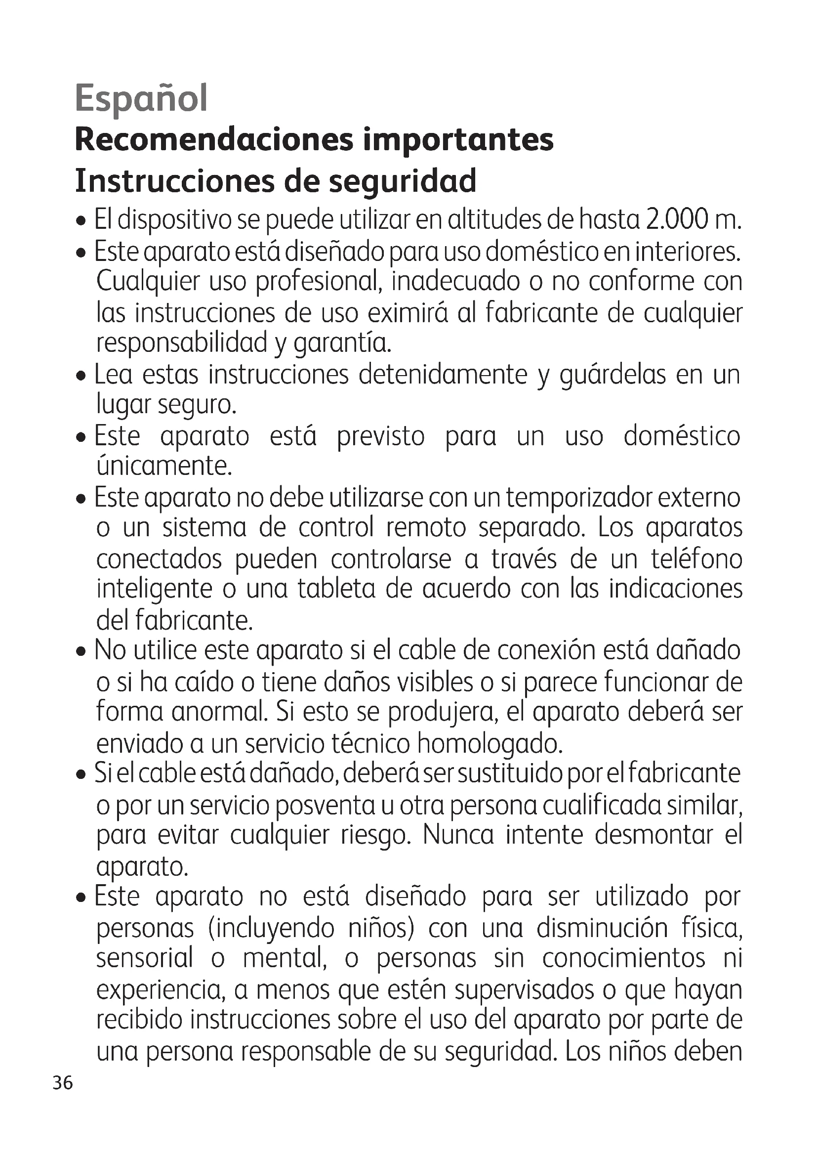 - Este aparato no está diseñado para ser utilizado por personas (incluyendo niños) con una disminución física, sensorial o mental, o personas sin conocimientos ni experiencia, a menos que estén supervisados o que hayan recibido instrucciones sobre el uso del aparato por parte de una persona responsable de su seguridad. Los niños deben Español37 estar vigilados para asegurar que no juegan con el aparato.