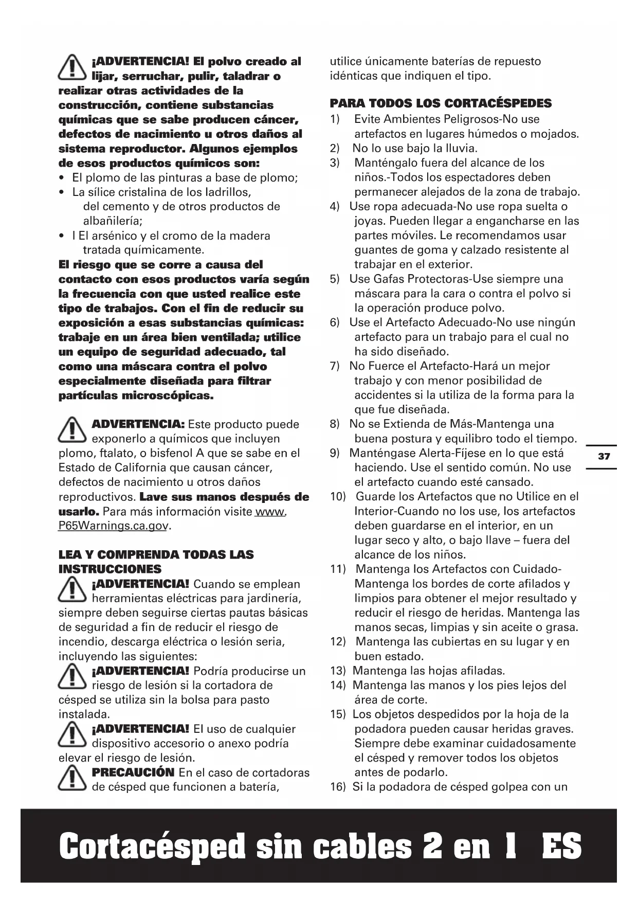 INSTRUCCIONES ¡ADVERTENCIA! Cuando se emplean herramientas eléctricas para jardinería, siempre deben seguirse ciertas pautas básicas de seguridad a fin de reducir el riesgo de incendio, descarga eléctrica o lesión seria, incluyendo las siguientes: ¡ADVERTENCIA! Podría producirse un riesgo de lesión si la cortadora de césped se utiliza sin la bolsa para pasto instalada. ¡ADVERTENCIA! El uso de cualquier dispositivo accesorio o anexo podría elevar el riesgo de lesión. PRECAUCIÓN En el caso de cortadoras de césped que funcionen a batería, utilice únicamente baterías de repuesto idénticas que indiquen el tipo.
