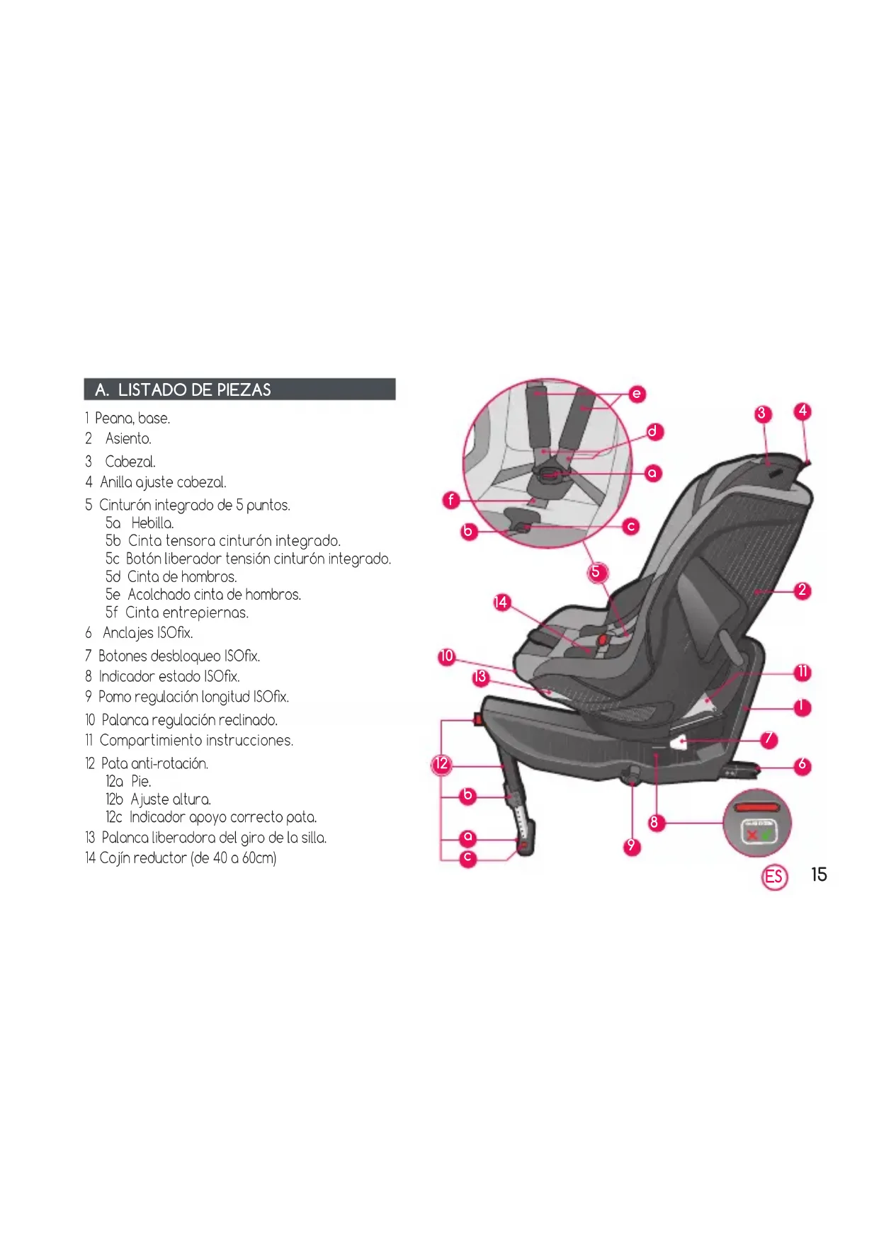 1 Peana, base.2 Asiento.3 Cabezal.4 Anilla ajuste cabezal.5 Cinturón integrado de 5 puntos.5a Hebilla.5b Cinta tensora cinturón integrado.5c Botón liberador tensión cinturón integrado.5d Cinta de hombros.5e Acolchado cinta de hombros.5f Cinta entrepiernas.6 Anclajes ISOx.7 Botones desbloqueo ISOx.8 Indicador estado ISOx.9 Pomo regulación longitud ISOx.10 Palanca regulación reclinado.11 Compartimiento instrucciones.12 Pata anti-rotación.12a Pie.12b Ajuste altura.12c Indicador apoyo correcto pata.13 Palanca liberadora del giro de la silla.14 Cojín reductor (de 40 a 60cm)3