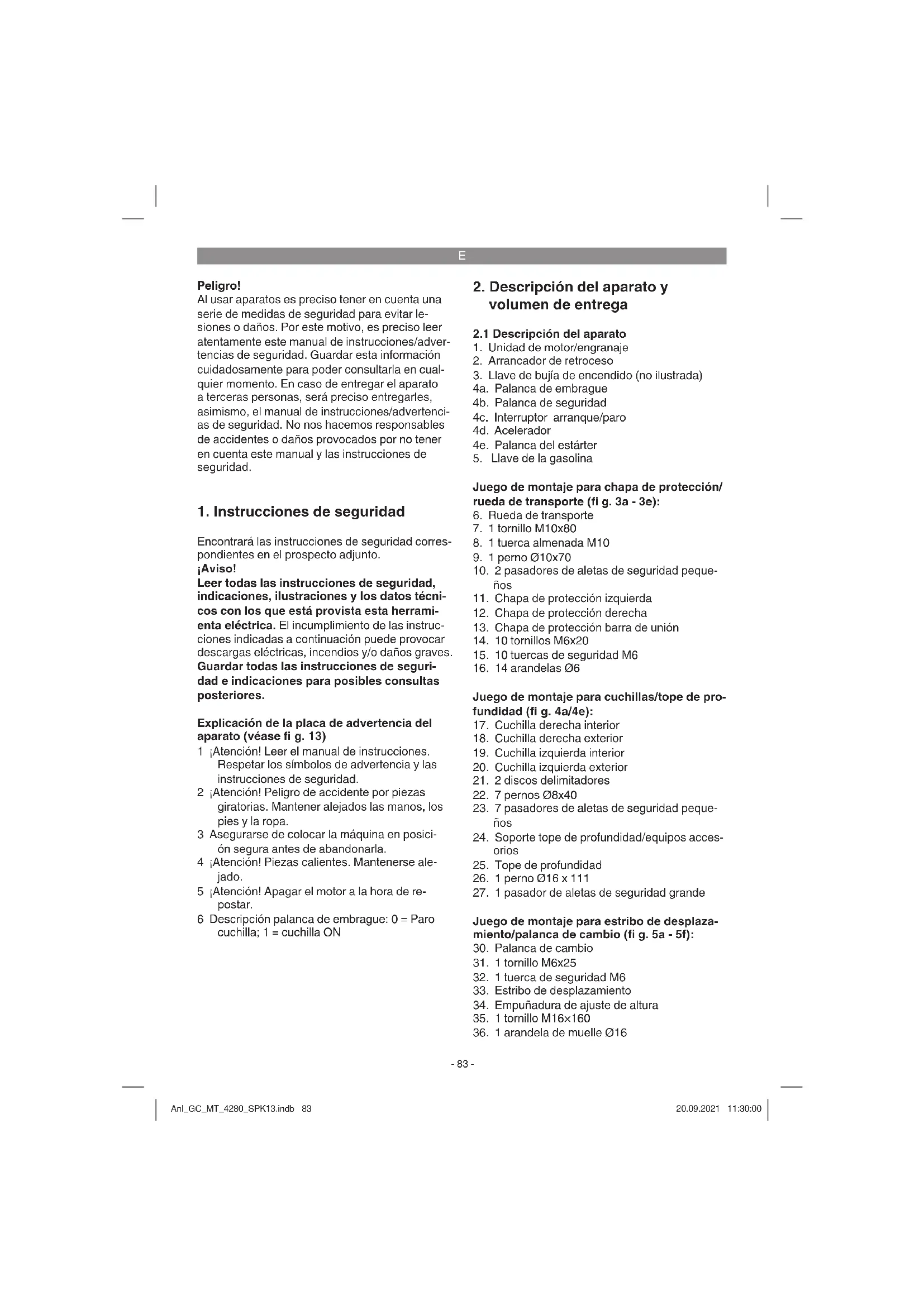 Arrancar el motor con el arrancador de ret- roceso (2); para ello, tirar de la empuñadura Anl_GC_MT_4280_SPK13.indb 85Anl_GC_MT_4280_SPK13.indb 85 20.09.2021 11:30:0120.09.2021 11:30:01E