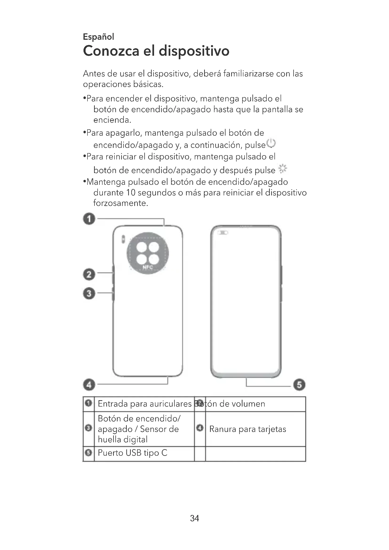 - Mantenga pulsado el botón de encendido/apagado durante 10 segundos o más para reiniciar el dispositivo forzosamente. Entrada para auriculares Botón de volumen Botón de encendido/ apagado / Sensor de huella digital Ranura para tarjetas Puerto USB tipo C 34• Mantenga el área NFC cerca de los otros dispositivos u objetos cuando utilice la función NFC.