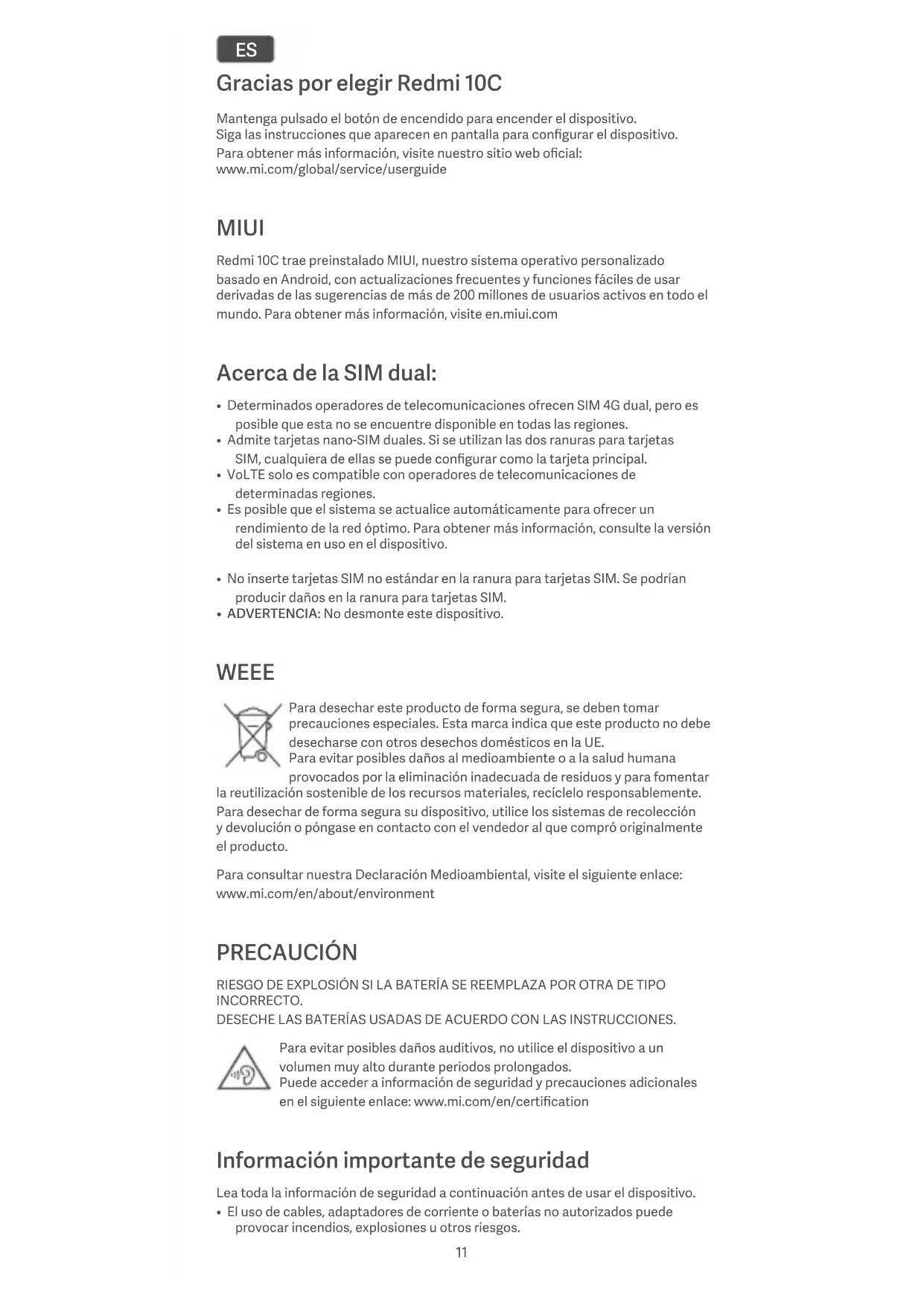 - ADVERTENCIA: No desmonte este dispositivo. WEEE Para desechar este producto de forma segura, se deben tomar precauciones especiales. Esta marca indica que este producto no debe desecharse con otros desechos domésticos en la UE. Para evitar posibles daños al medioambiente o a la salud humana provocados por la eliminación inadecuada de residuos y para fomentar la reutilización sostenible de los recursos materiales, recíclelo responsablemente. Para desechar de forma segura su dispositivo, utilice los sistemas de recolección y devolución o póngase en contacto con el vendedor al que compró originalmente el producto. Para consultar nuestra Declaración Medioambiental, visite el siguiente enlace: www.mi.com/en/about/environment PRECAUCIÓN RIESGO DE EXPLOSIÓN SI LA BATERÍA SE REEMPLAZA POR OTRA DE TIPO INCORRECTO. DESECHE LAS BATERÍAS USADAS DE ACUERDO CON LAS INSTRUCCIONES. Para evitar posibles daños auditivos, no utilice el dispositivo a un volumen muy alto durante periodos prolongados. Puede acceder a información de seguridad y precauciones adicionales en el siguiente enlace: www.mi.com/en/certification Información importante de seguridad Lea toda la información de seguridad a continuación antes de usar el dispositivo.