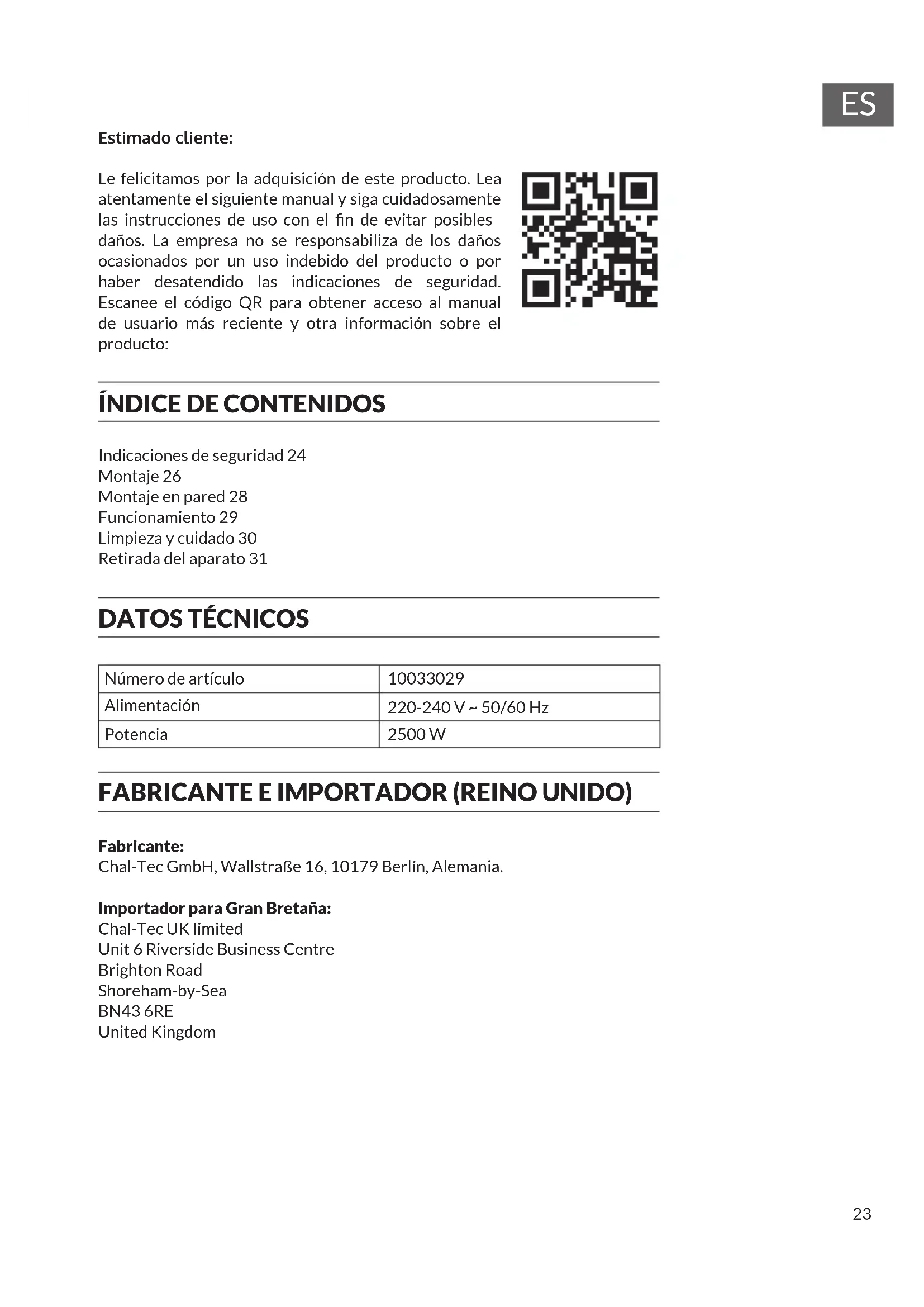 Estimado cliente: Le felicitamos por la adquisición de este producto. Lea atentamente el siguiente manual y siga cuidadosamente las instrucciones de uso con el n de evitar posibles daños. La empresa no se responsabiliza de los daños ocasionados por un uso indebido del producto o por haber desatendido las indicaciones de seguridad. Escanee el código QR para obtener acceso al manual de usuario más reciente y otra información sobre el producto: