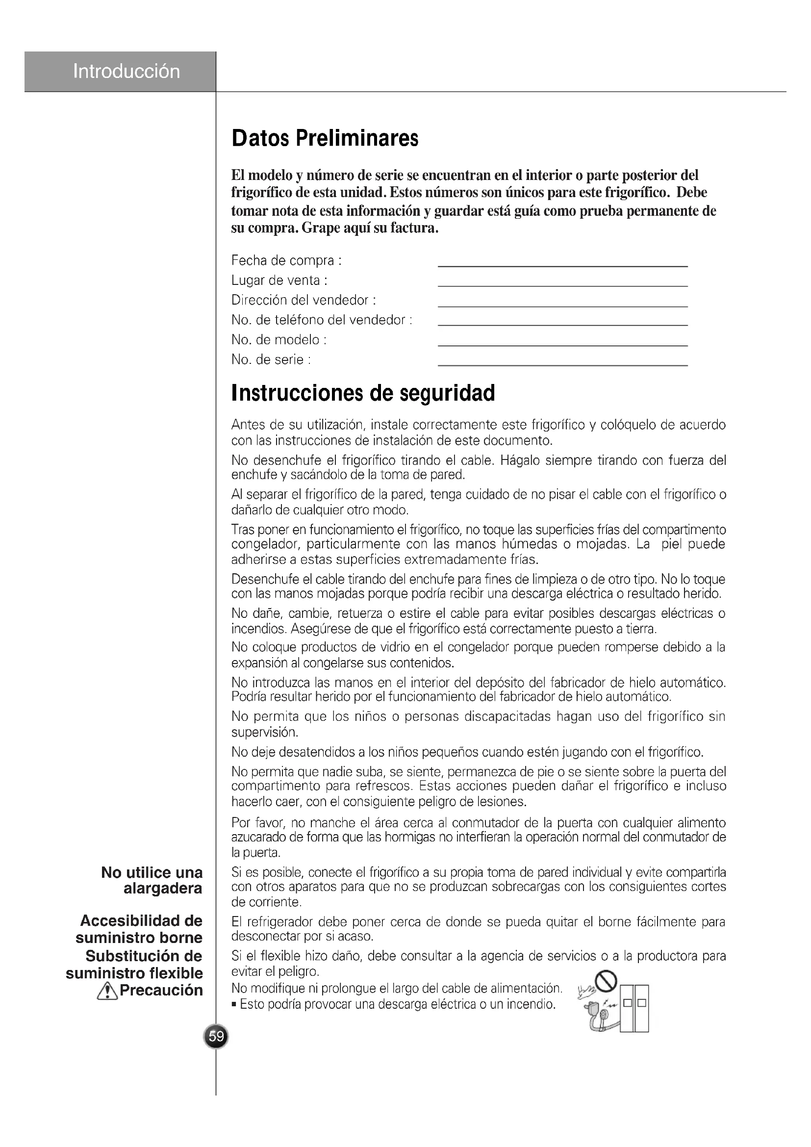 Instrucciones de seguridad Introducción60 Identificación de las partes PELIGRO: riesgo de que los niños queden encerrados. Antes de deshacerse de su viejo frigorífico o congelador: Desmonte las puertas pero deje en su lugar las baldas para que los niños no entrar al interior con facilidad. Un frigorífico no debe ser usado como juguete por los niños o personas discapacitadas sin la debida supervisión. Asegúrese de que los niños no juegan con el frigorífico. No guarde o use gasolina u otros líquidos o vapores inflamables cerca del frigorífico o cualquier otro aparato eléctrico. Si se produce un cortocircuito, la toma de tierra reduce el riesgo de descargas eléctricas proporcionando un hilo de escape para la corriente eléctrica. Para evitar posibles descargas eléctricas, este aparato debe estar conectado a tierra. Un uso inadecuado de la toma de tierra puede producir descargas eléctricas. Consulte a un técnico o electricista cualificados si no entiende correctamente las instrucciones de puesta a tierra, o si tiene dudas sobre si la puesta a tierra se ha realizado correctamente. Riesgos de que los niños queden encerrados No guardar Toma de tierra Compartimentode congeladorCompartimento de frigoríficoEsquina deproductos lácteosEstantes de puertaEspacio plusFabricador dehielo automáticoLámparaBalda(acero o vidrio)BaldaEstante de puertaCajónEstante de puertaTapa inferiorLámparaBaldaEstante de puerta(1 pieza o 2 piezas)Estante de puerta(1 pieza o 2 piezas)BaldaCajón para tentempiés(opcional)Balda (abatable o normal)Compartimento pararefrescos (opcional)HueveraCajón para verduras (1 o 2)Estante de puertaInterruptor de humedadZona despensa (opcional)Cajón para verdura(opcional)Interruptor deconversión(carnes/verduras)(opcional)Soporte para vino (Plástico o cable)