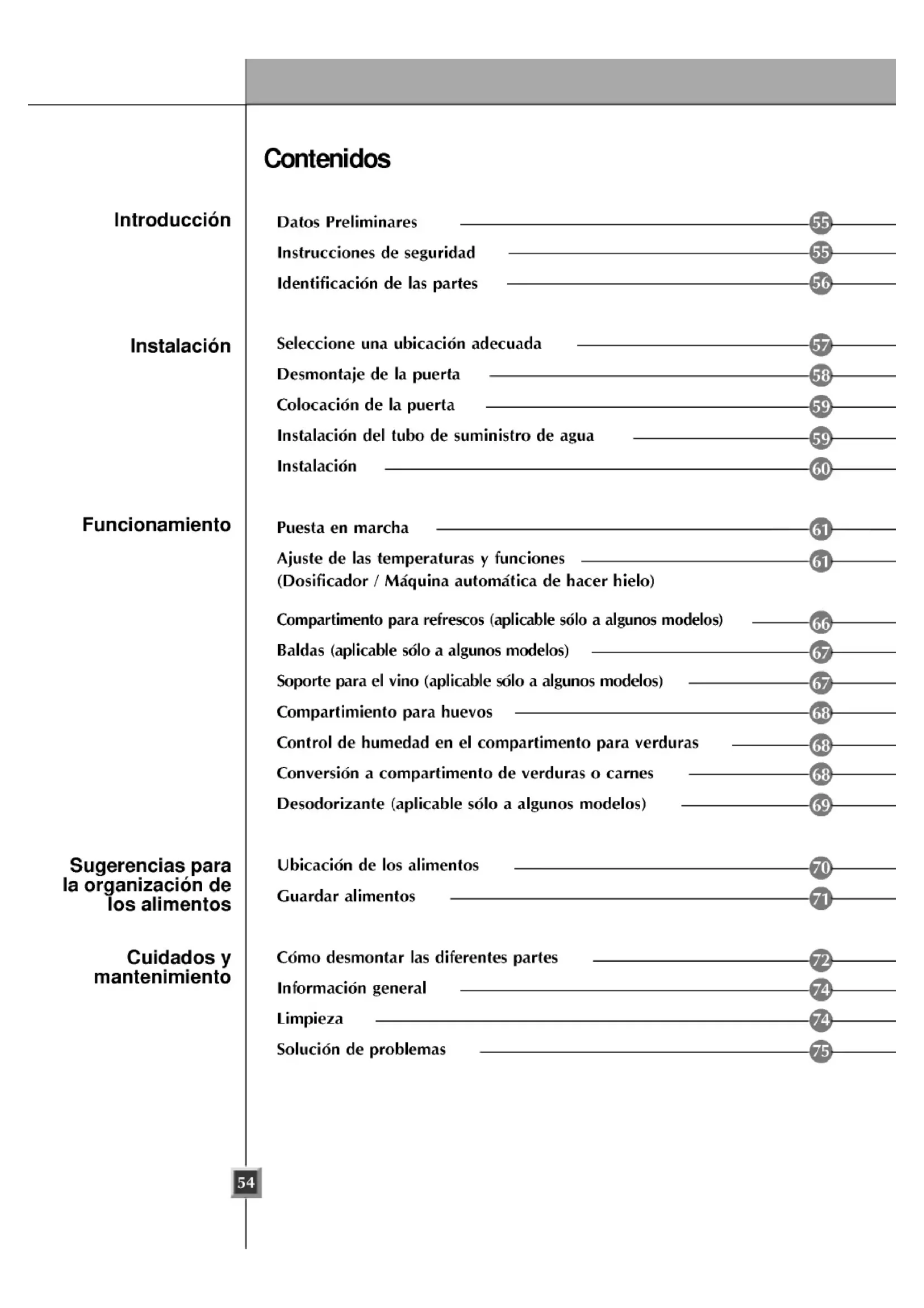 fallos) Lafuncionde diagnostico detectaautomaticamenteelfallocuandoestese produce enel producto duranteelusodel refrigerador. Sielfallose produce enuna pieza del producto, estenofuncionaaunquese oprima cualquier botonynohace ninguna indicacionnormal.En este casonodesconectela energia electricasino contacte inmediatamenteal centro deservicioslocales.Tomamucho tiempo alostecnicosdelserviciodetectarla parte falladasiel refrigerador hasido apagado.65 Deshagase delhielo (alrededor de20 cubitos) yelagua (aproximadamente vasos) producidos por primera veztrasla instalacion del frigorifico. |El primer hieloyagua incluyen particulas uoloresdeltubodesuministrodeaguaoel deposito deagua.Estoesnecesarioencasodequeel frigorifico nose haya usadodurantemucho tiempo. permita quelosninos manipulen compensador Losninos pueden apretar compensador incorrectamenteodanarlas lamparas. Asegurese dequelosalimentosno bloquean elpasodelhielo.Silosalimentossecolocanenlaentradadelpasodel hielo, quizas bloquee elpasodelhielo.Tambien puede cubrirseconhieloen polvo siseutilizasolamentehielo fragmentado.