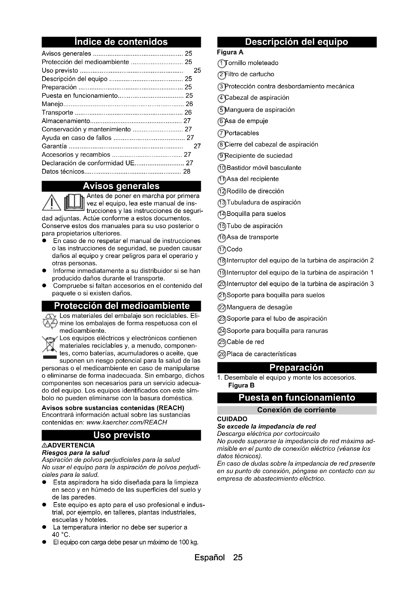 H05VV-F 2x1,5 H05VV-F 2x1,5 Onderdelennummer (EU) 6.647-069.0 6.647-069.0 Kabellengte m 10 10Español 25 Índice de contenidos Avisos generales Antes de poner en marcha por primera vez el equipo, lea este manual de ins- trucciones y las instrucciones de seguri- dad adjuntas. Actúe conforme a estos documentos. Conserve estos dos manuales para su uso posterior o para propietarios ulteriores. En caso de no respetar el manual de instrucciones o las instrucciones de seguridad, se pueden causar daños al equipo y crear peligros para el operario y otras personas. Informe inmediatamente a su distribuidor si se han producido daños durante el transporte. Compruebe si faltan accesorios en el contenido del paquete o si existen daños. Protección del medioambiente Los materiales del embalaje son reciclables. Eli- mine los embalajes de forma respetuosa con el medioambiente. Los equipos eléctricos y electrónicos contienen materiales reciclables y, a menudo, componen- tes, como baterías, acumuladores o aceite, que suponen un riesgo potencial para la salud de las personas o el medioambiente en caso de manipularse o eliminarse de forma inadecuada. Sin embargo, dichos componentes son necesarios para un servicio adecua- do del equipo. Los equipos identificados con este sím- bolo no pueden eliminarse con la basura doméstica. Avisos sobre sustancias contenidas (REACH) Encontrará información actual sobre las sustancias contenidas en: www.kaercher.com/REACH Uso previsto 몇 ADVERTENCIA Riesgos para la salud Aspiración de polvos perjudiciales para la salud No usar el equipo para la aspiración de polvos perjudi- ciales para la salud. Esta aspiradora ha sido diseñada para la limpieza en seco y en húmedo de las superficies del suelo y de las paredes. Este equipo es apto para el uso profesional e indus- trial, por ejemplo, en talleres, plantas industriales, escuelas y hoteles. La temperatura interior no debe ser superior a 40 °C. El equipo con carga debe pesar un máximo de 100 kg. Descripción del equipo Figura A 1 Tornillo moleteado 2 Filtro de cartucho 3 Protección contra desbordamiento mecánica 4 Cabezal de aspiración 5 Manguera de aspiración 6 Asa de empuje 7 Portacables 8 Cierre del cabezal de aspiración 9 Recipiente de suciedad 10 Bastidor móvil basculante 11 Asa del recipiente 12 Rodillo de dirección 13 Tubuladura de aspiración 14 Boquilla para suelos 15 Tubo de aspiración 16 Asa de transporte 17 Codo 18 Interruptor del equipo de la turbina de aspiración 2 19 Interruptor del equipo de la turbina de aspiración 1 20 Interruptor del equipo de la turbina de aspiración 3 21 Soporte para boquilla para suelos 22 Manguera de desagüe 23 Soporte para el tubo de aspiración 24 Soporte para boquilla para ranuras 25 Cable de red 26 Placa de características Preparación