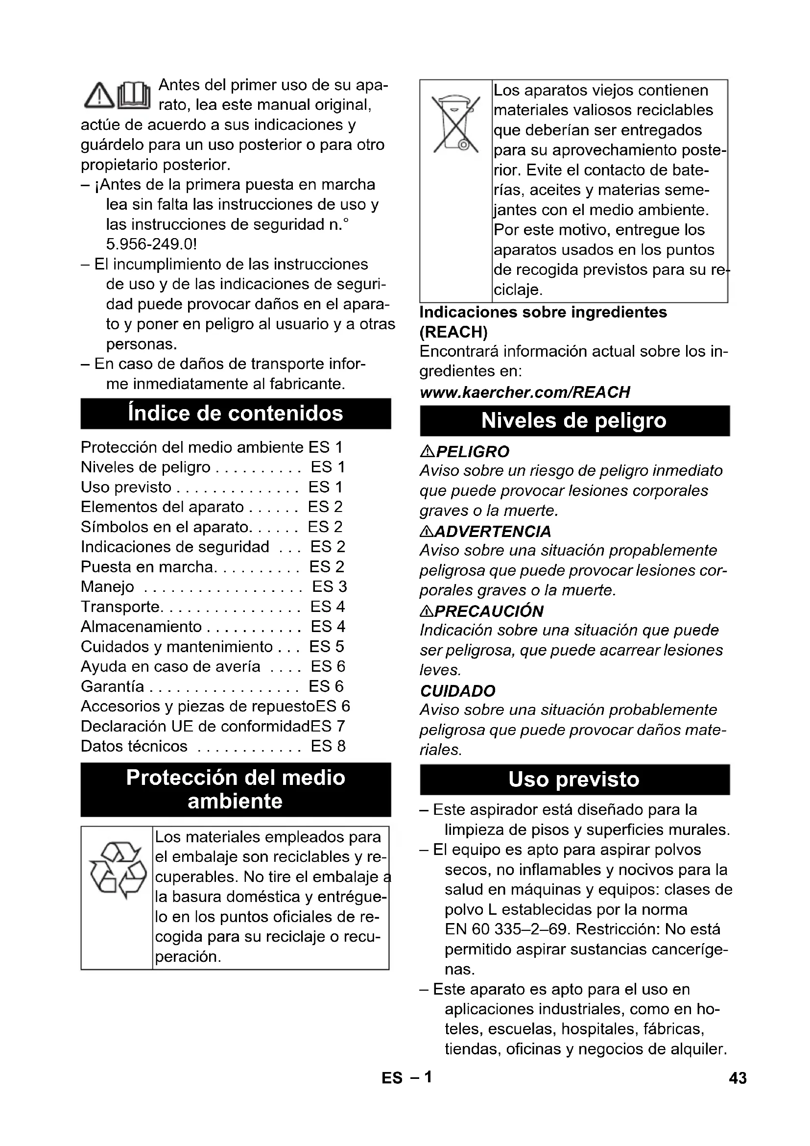 Ap Te L Onderdeelnr. Lengte snoer EU 6.650-332.0 6 m 42 NL– 1 Antes del primer uso de su apa- rato, lea este manual original, actúe de acuerdo a sus indicaciones y guárdelo para un uso posterior o para otro propietario posterior. – ¡Antes de la primera puesta en marcha lea sin falta las instrucciones de uso y las instrucciones de seguridad n.° 5.956-249.0! – El incumplimiento de las instrucciones de uso y de las indicaciones de seguri- dad puede provocar daños en el apara- to y poner en peligro al usuario y a otras personas. – En caso de daños de transporte infor- me inmediatamente al fabricante. Indicaciones sobre ingredientes (REACH) Encontrará información actual sobre los in- gredientes en: www.kaercher.com/REACH PELIGRO Aviso sobre un riesgo de peligro inmediato que puede provocar lesiones corporales graves o la muerte. 몇 ADVERTENCIA Aviso sobre una situación propablemente peligrosa que puede provocar lesiones cor- porales graves o la muerte. 몇 PRECAUCIÓN Indicación sobre una situación que puede ser peligrosa, que puede acarrear lesiones leves. CUIDADO Aviso sobre una situación probablemente peligrosa que puede provocar daños mate- riales. – Este aspirador está diseñado para la limpieza de pisos y superficies murales. – El equipo es apto para aspirar polvos secos, no inflamables y nocivos para la salud en máquinas y equipos: clases de polvo L establecidas por la norma EN 60 335–2–69. Restricción: No está permitido aspirar sustancias canceríge- nas. – Este aparato es apto para el uso en aplicaciones industriales, como en ho- teles, escuelas, hospitales, fábricas, tiendas, oficinas y negocios de alquiler. Índice de contenidos Protección del medio ambiente ES 1 Niveles de peligro . . . . . . . . . . ES 1 Uso previsto . . . . . . . . . . . . . . ES 1 Elementos del aparato . . . . . . ES 2 Símbolos en el aparato. . . . . . ES 2 Indicaciones de seguridad . . . ES 2 Puesta en marcha. . . . . . . . . . ES 2 Manejo . . . . . . . . . . . . . . . . . . ES 3 Transporte. . . . . . . . . . . . . . . . ES 4 Almacenamiento . . . . . . . . . . . ES 4 Cuidados y mantenimiento . . . ES 5 Ayuda en caso de avería . . . . ES 6 Garantía . . . . . . . . . . . . . . . . . ES 6 Accesorios y piezas de repuestoES 6 Declaración UE de conformidadES 7 Datos técnicos . . . . . . . . . . . . ES 8 Protección del medio ambiente Los materiales empleados para el embalaje son reciclables y re- cuperables. No tire el embalaje a la basura doméstica y entrégue- lo en los puntos oficiales de re- cogida para su reciclaje o recu- peración. Los aparatos viejos contienen materiales valiosos reciclables que deberían ser entregados para su aprovechamiento poste- rior. Evite el contacto de bate- rías, aceites y materias seme- jantes con el medio ambiente. Por este motivo, entregue los aparatos usados en los puntos de recogida previstos para su re- ciclaje. Niveles de peligro Uso previsto 43ES– 2 1 Alojamiento para boquilla para suelos 2 Manguera de aspiración 3 Salida de aire, aire de trabajo 4 Cabezal de aspiración 5 Bloqueo del cabezal de absorción 6 Recipiente acumulador de suciedad 7 Rodillo de dirección 8 Mango empotrado 9 Entrada de aire, aire refrigerado del motor 10 Tubuladura de aspiración 11 Enchufe (solo Ap Te L) 12 Boquilla barredora de suelos 13 Tubo de aspiración 14 Interruptor principal 15 Botón de la limpieza del filtro 16 Asa de transporte 17 Orejeta de fijación 18 Gancho para manguera 19 Flotador 20 Codo 21 Filtro de cartucho (PES) 22 Tuerca de fijación 23 Soporte para la tubería de absorción 24 Cable de conexión a la red 25 Placa de características 26 Gancho porta cables PELIGRO – Cuando se retorne el aire de escape al cuarto, debe existir en el mismo una tasa suficiente de renovación de aire L. Para respetar el valor límite requerido, el flujo volumétrico retornado debe ser como máximo el 50% del flujo volumé- trico de aire exterior limpio (volumen del cuarto V